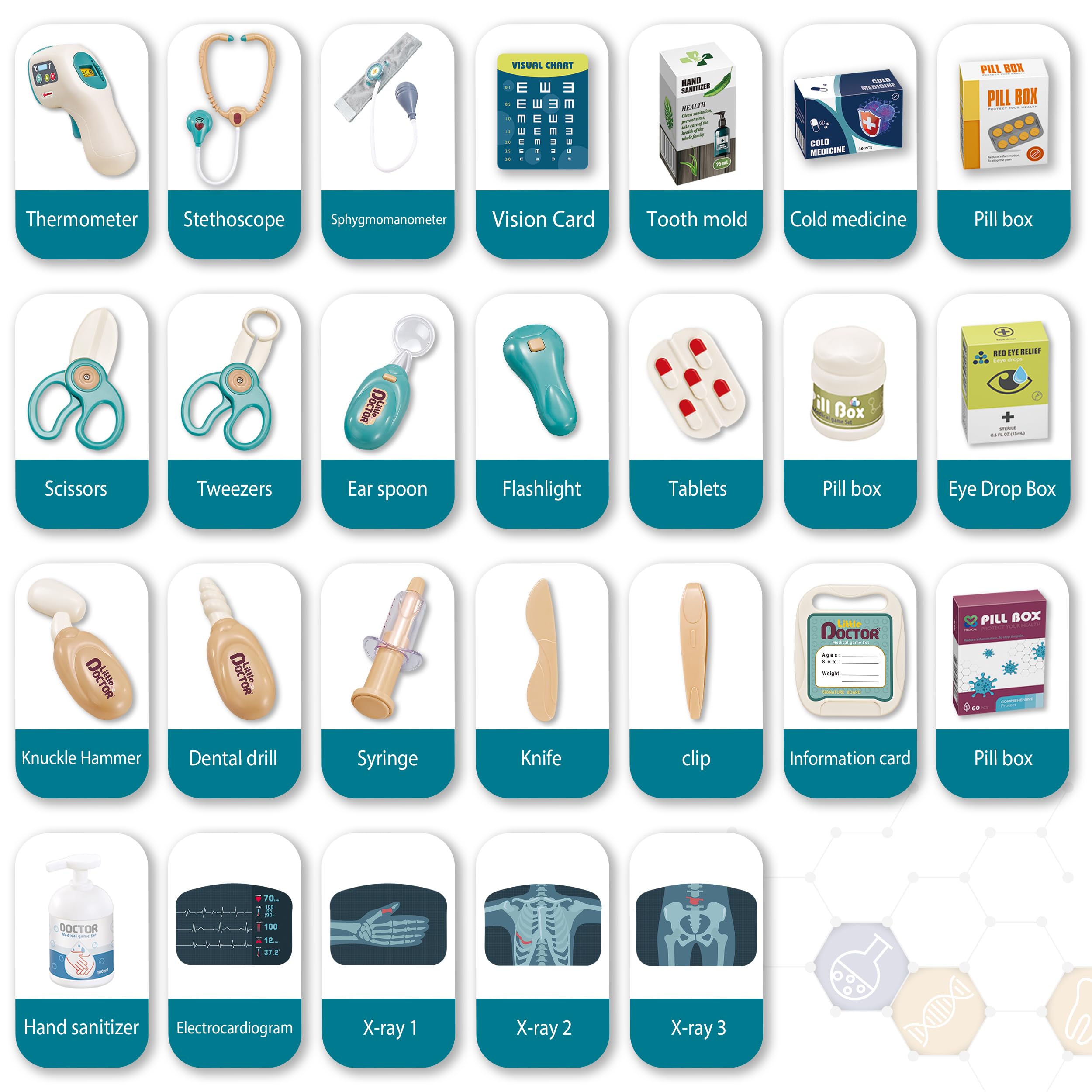 A complete fun of medical tools: The doctor cart kit comes with a syringe, endoscope, thermometer, eye chart,glasses and more. Press the button of the stethoscope and the light will come on and be accompanied by a sound.