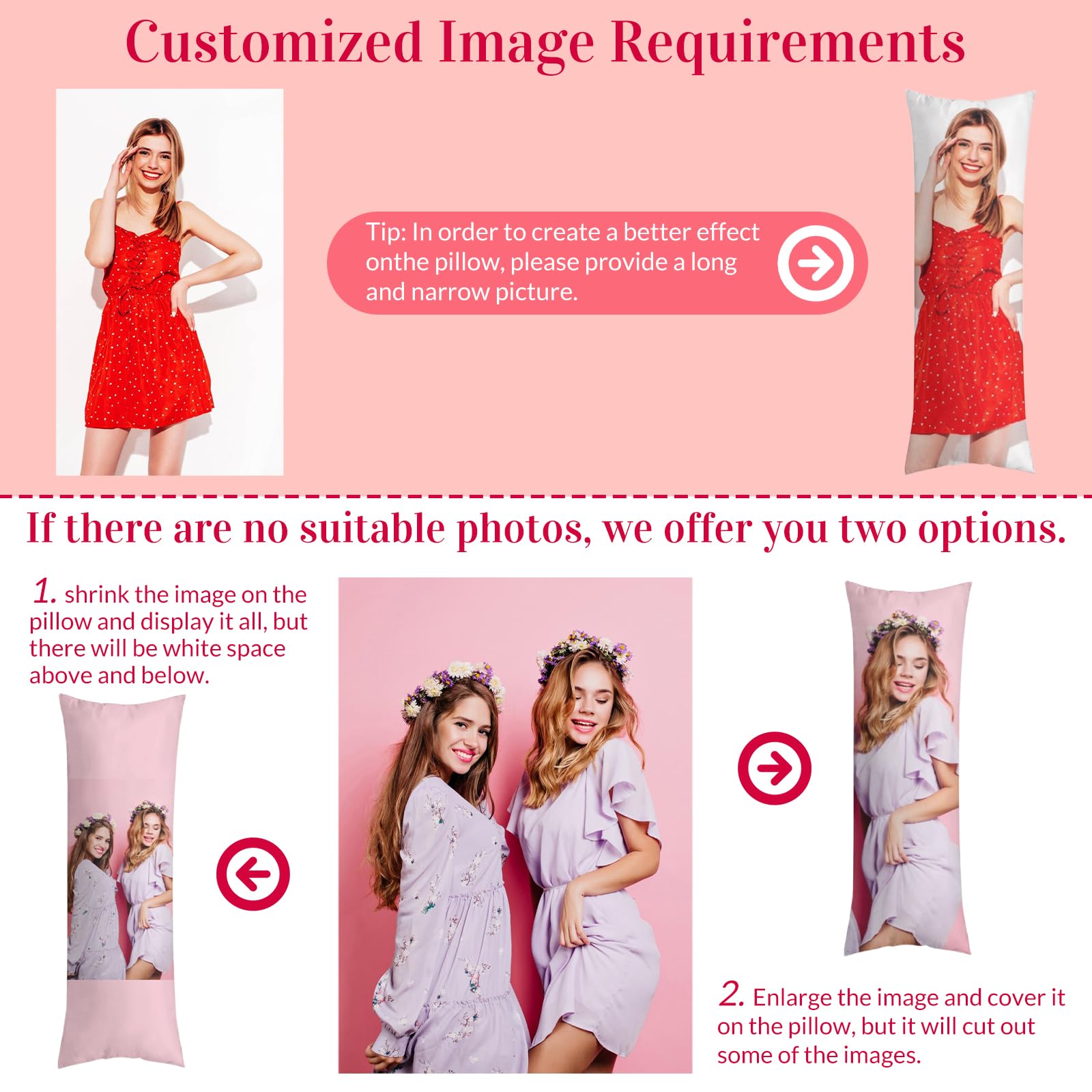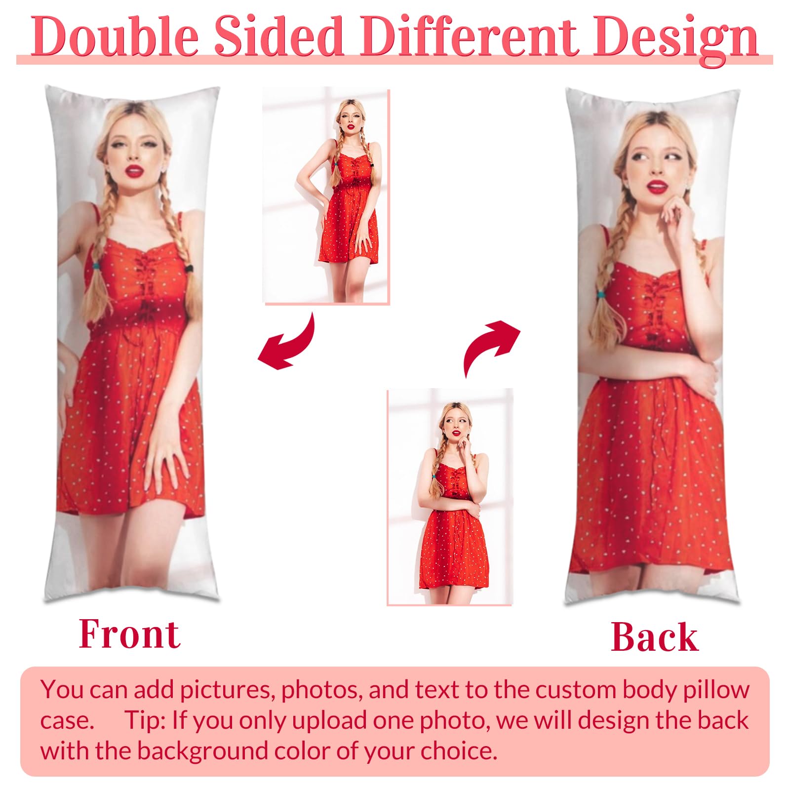 You can add your own pictures, photos, text, and double-sided printing on custom body pillow case. If you need to design different photos on both sides of full body pillow case, please upload both front and back photos