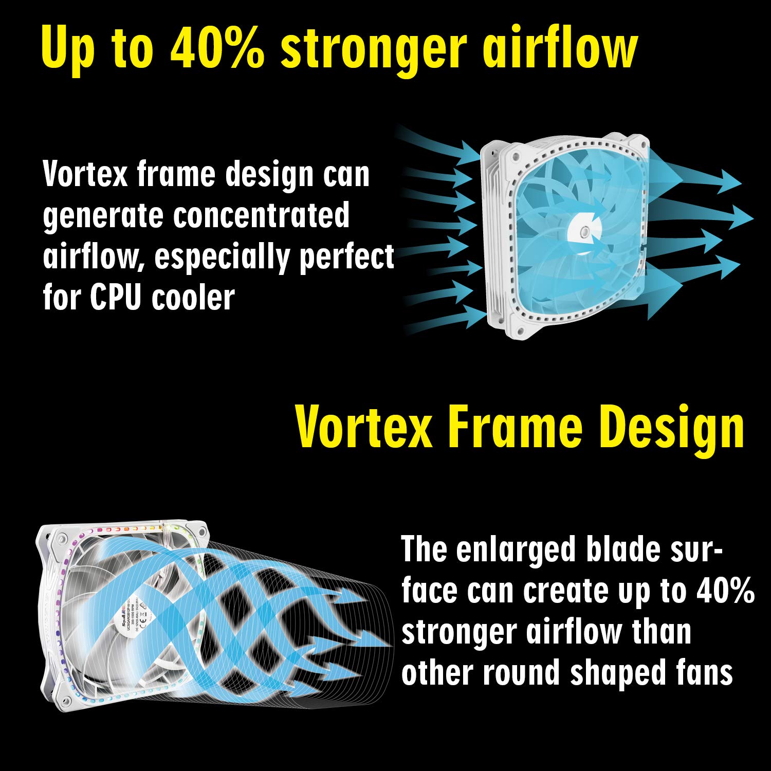【Up to 40% stronger airflow】 The enlarged Blade surface and air inlet design Due to its unique square frame design can create up to 40% stronger airflow than other RGB fans