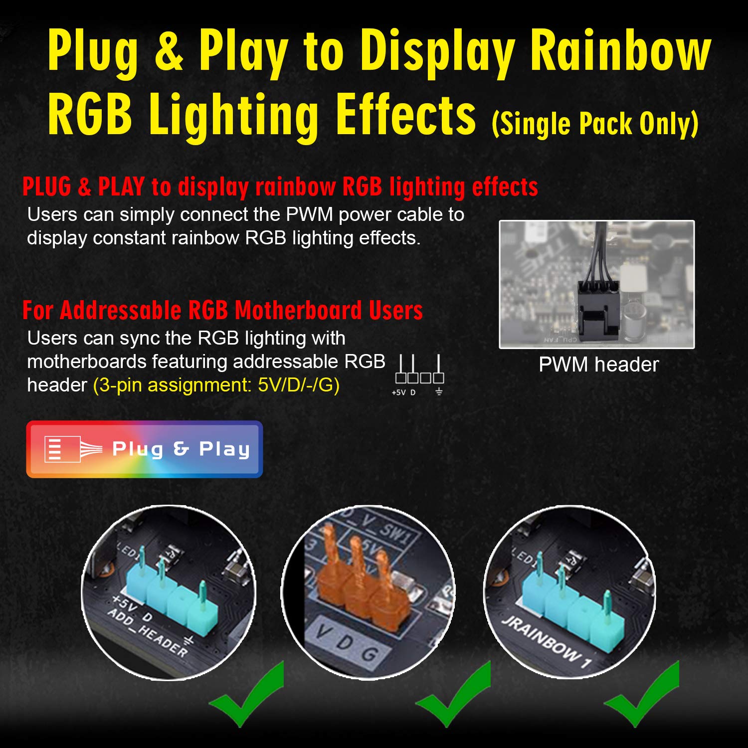 【Plug & play installation】 non-rgb motherboard users can use the PWM power cable to connect the fan to create constant rainbow RGB lighting effects