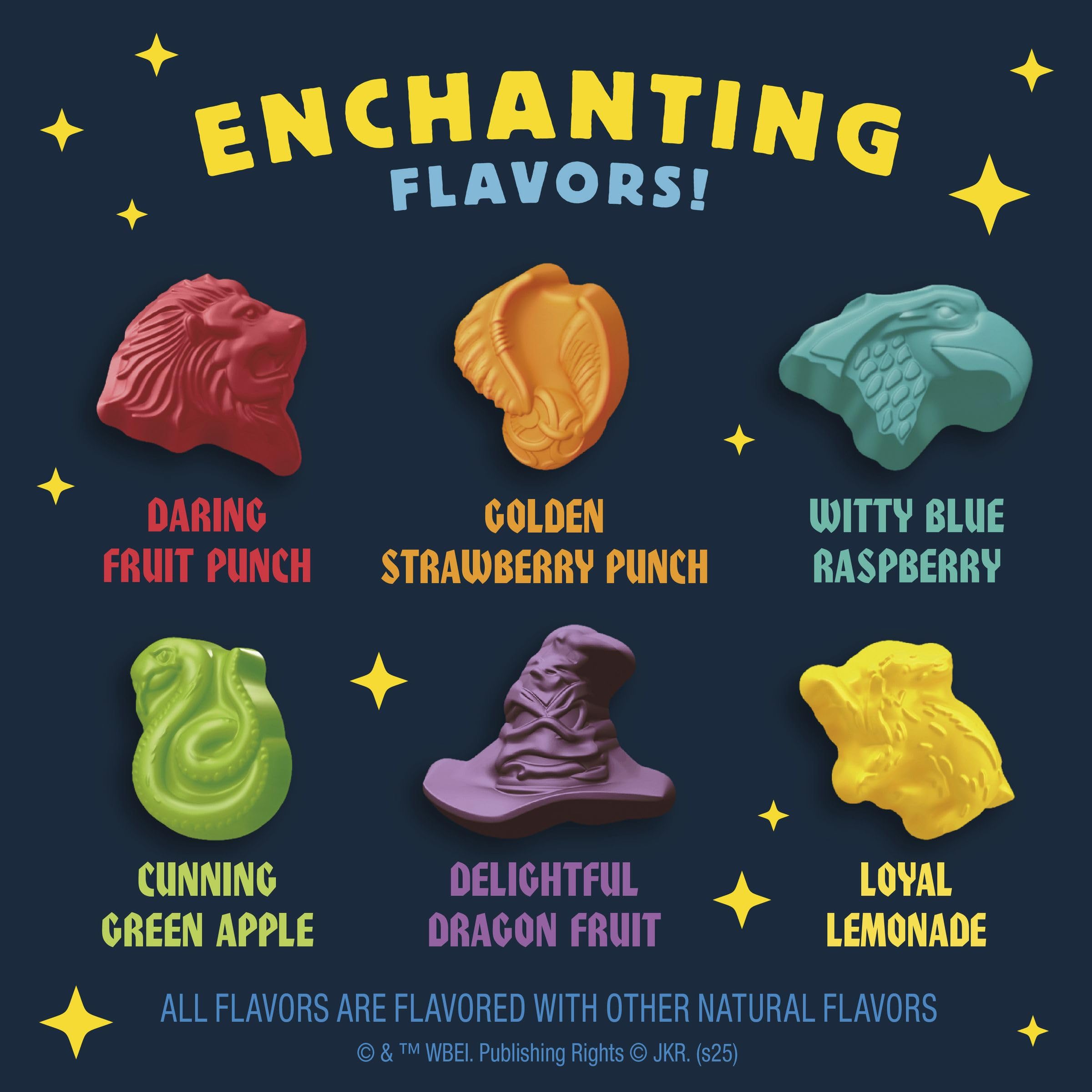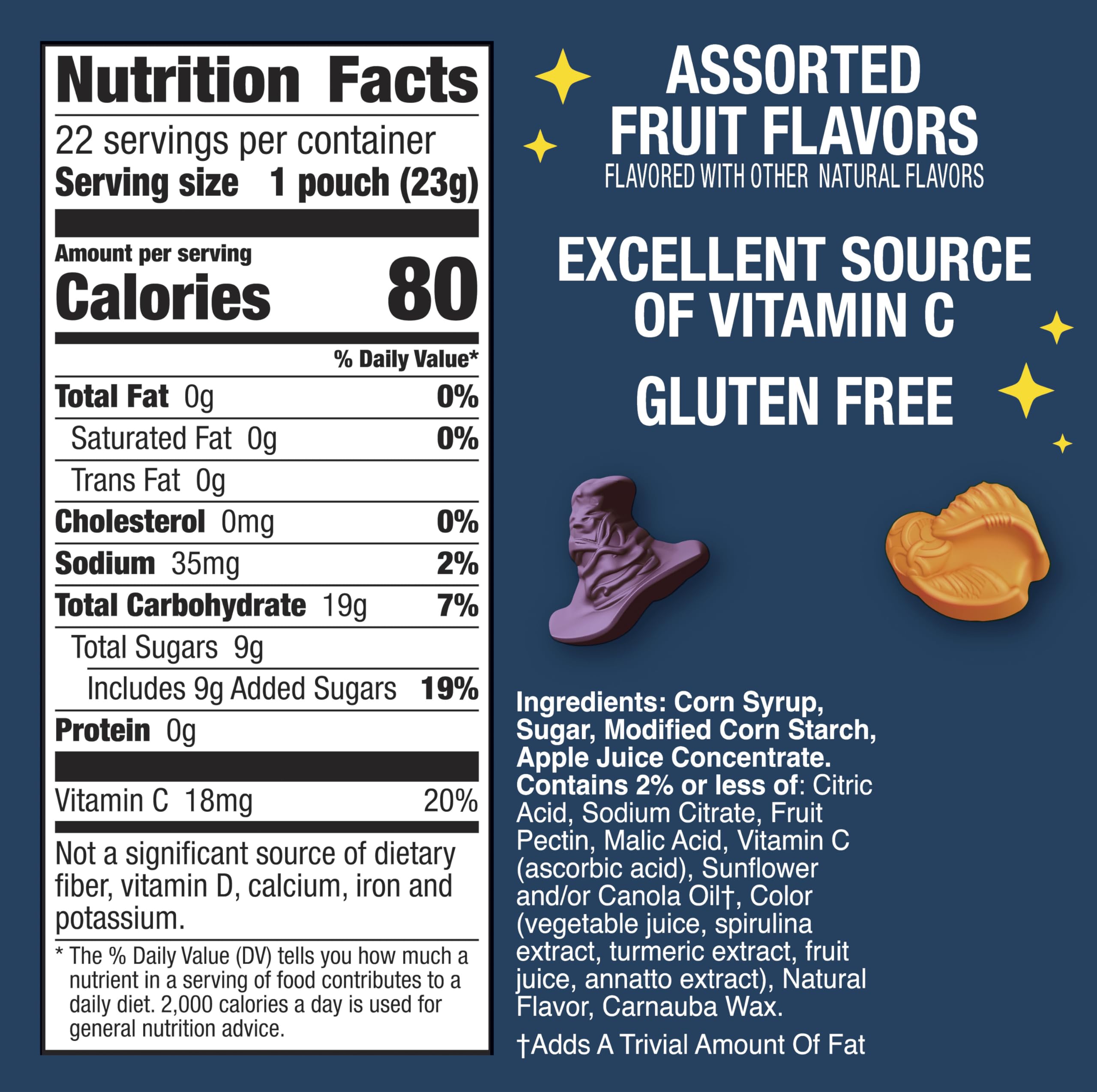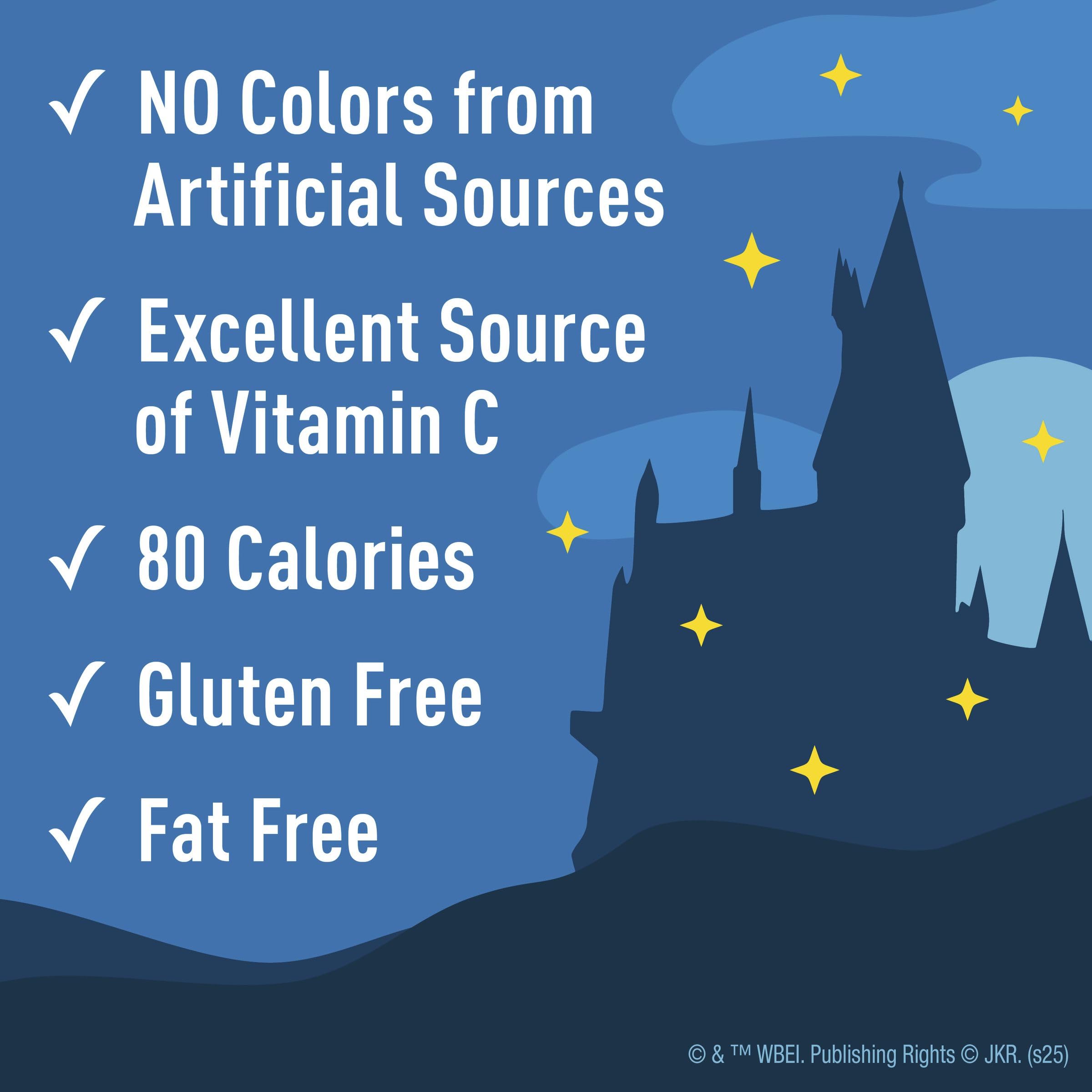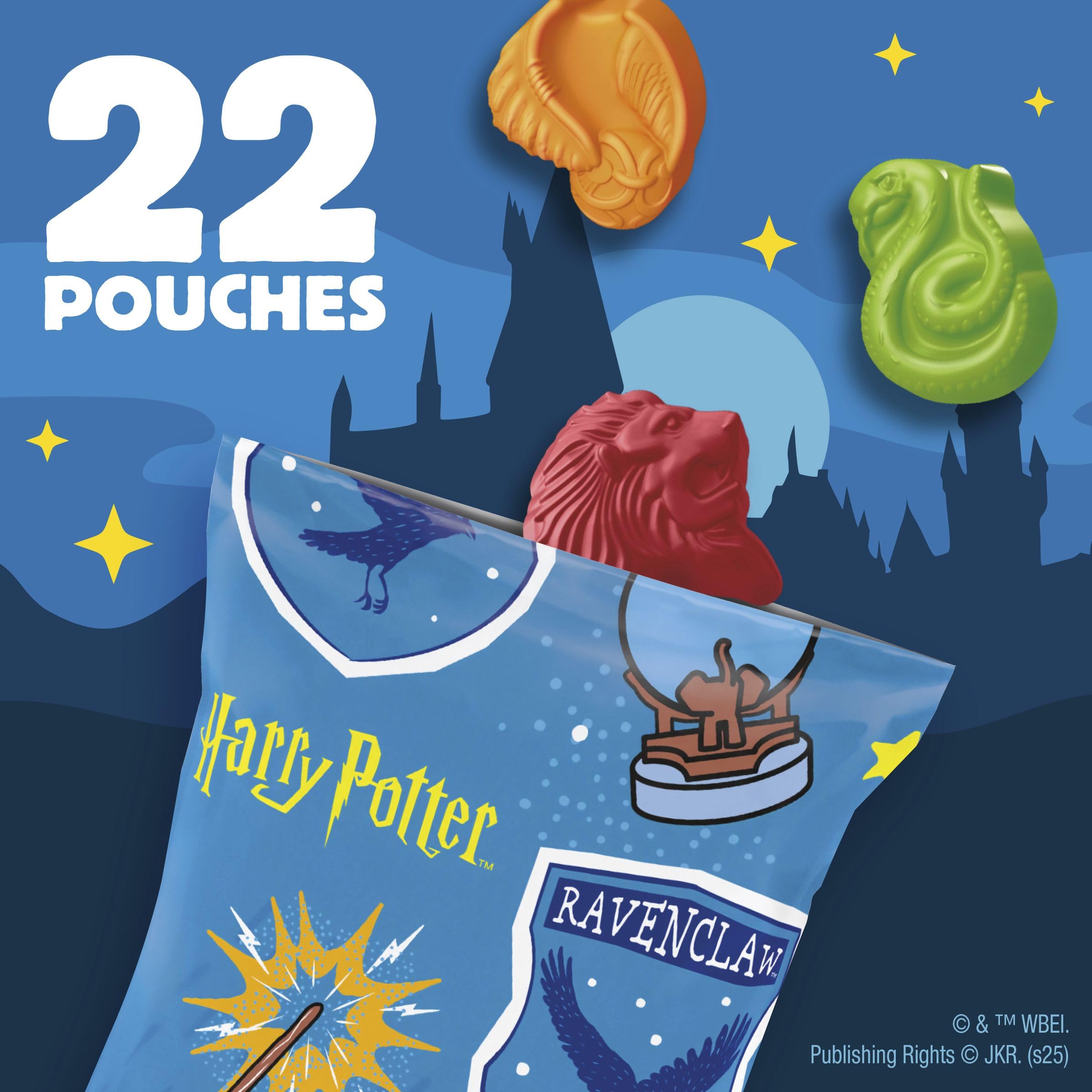 Discover the magic with Harry Potter Fruit Flavored Snacks. Bursting with fruity taste, these fun gummy snacks are shaped like the house symbols, sorting hat, and golden snitch. From Loyal Lemonade to Daring Fruit Punch, every witch and wizard can enjoy a medley of flavors. These gluten free snacks contain no colors from artificial sources and are an excellent source of vitamin C. A great treat for parties and goodie bags, or a sweet addition to your road trip. Add a little magic to your everyday by testing your Harry Potter Hogwarts knowledge with trivia inside the box. Pop these into your pantry and enjoy a quick, fat free snack full of fruity flavor. Contains one 17.6 oz Value Pack cardboard box of chewy Harry Potter Fruit Flavored Snacks; 22 pouches.