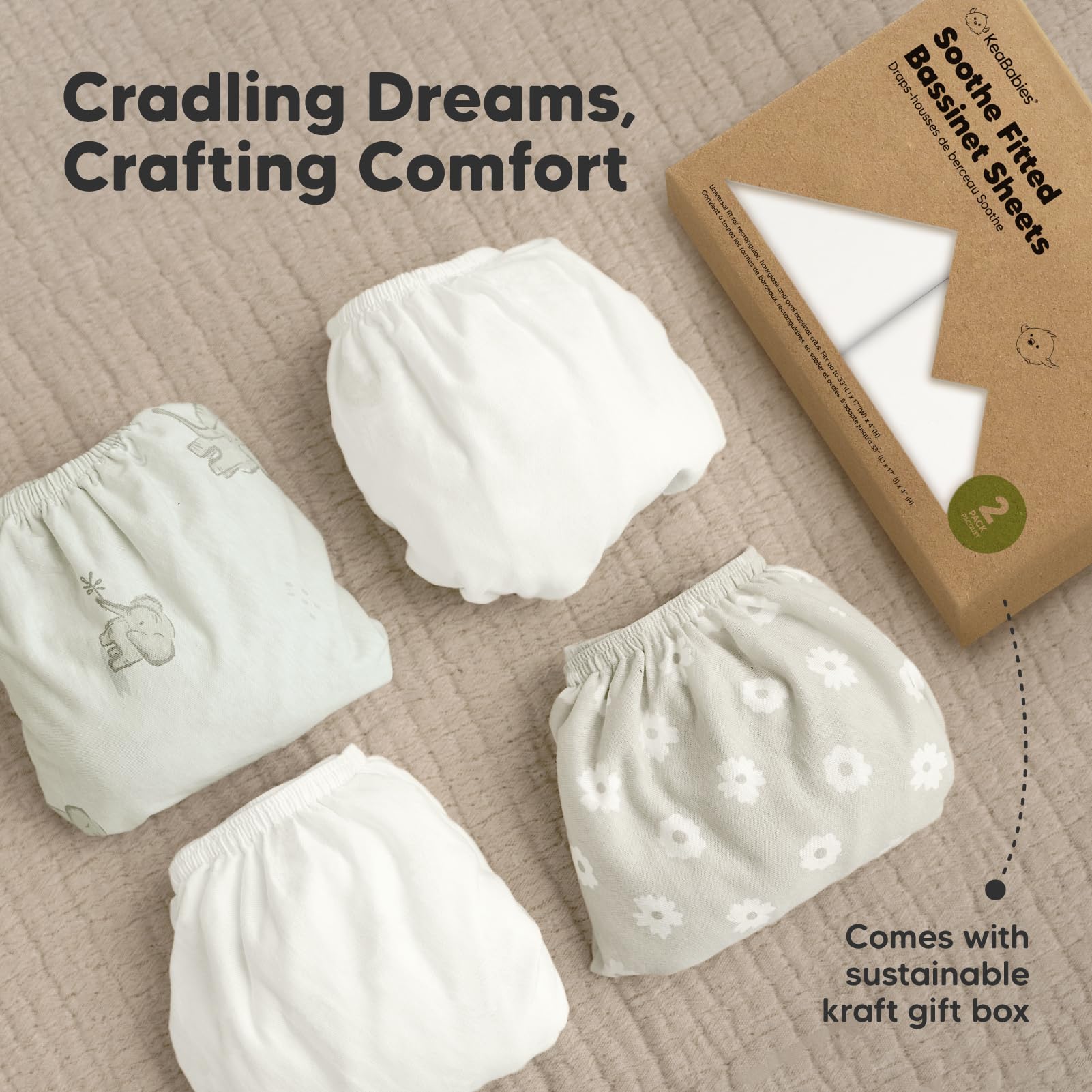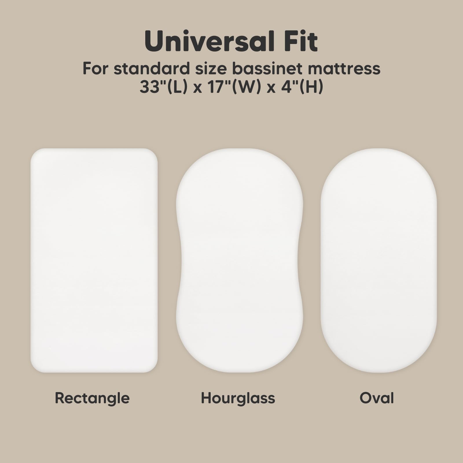 2-Pack Bassinet Fitted Sheets - KeaBabies Soothe Bassinet Mattress Sheets, sized at 33" x 17" with a depth of up to 4", provide a universal fit for all bassinet mattress pad types. They can be used as hourglass, oval, rectangle bassinet sheets.