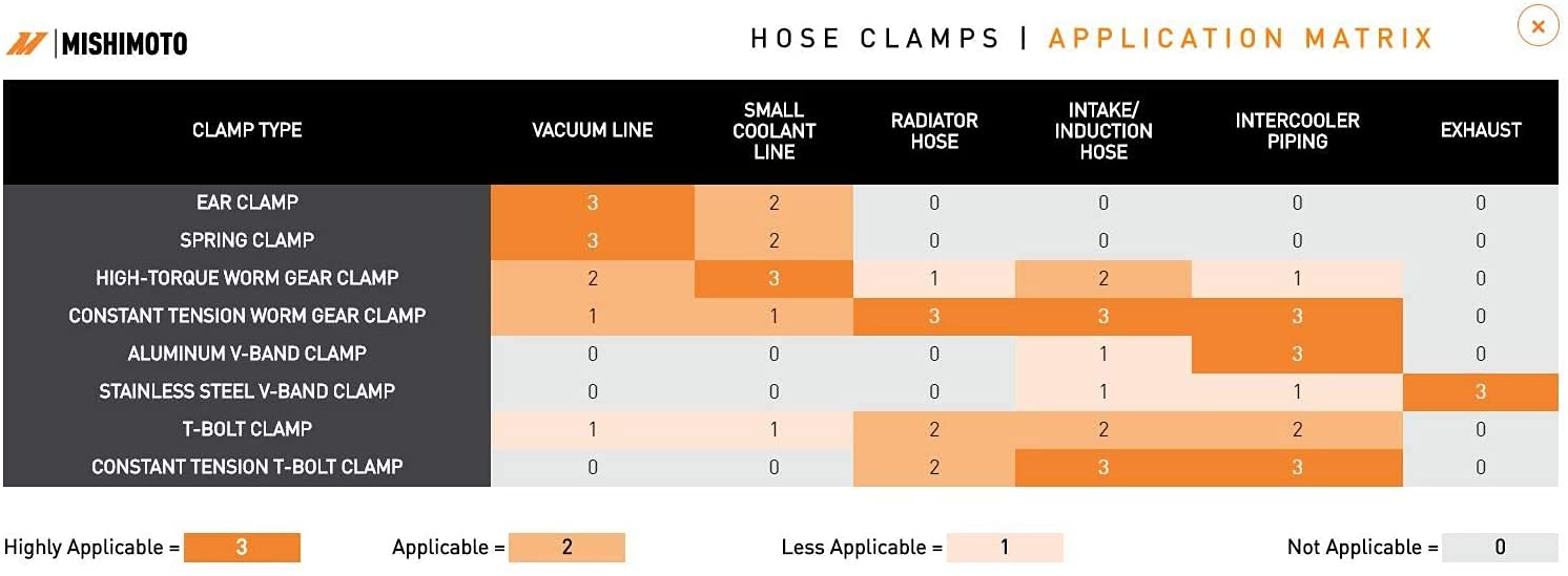 High-powered turbocharged vehicles need an air-charge system that can handle the demands of extreme heat and pressure. Failing clamps and blown boots are aggravating problems that can result in the end to a day at the drag strip or a delayed weekend trip. Mishimoto constant tension T-bolt clamps are constructed of 100 percent stainless steel and provide the reliability and durability, need to keep the vehicle on the road and out of the shop. These clamps are spring loaded to provide strong and consistent holding power. Mishimoto engineered these heavy-duty clamps to compensate for thermal expansion and to provide peace of mind for even the most extreme pressures. The Mishimoto constant tension T-bolt clamps are available in a variety of sizes from 2.5 inches to 4 inches. These clamps feature an etched 'M' logo and are backed by the lifetime warranty.