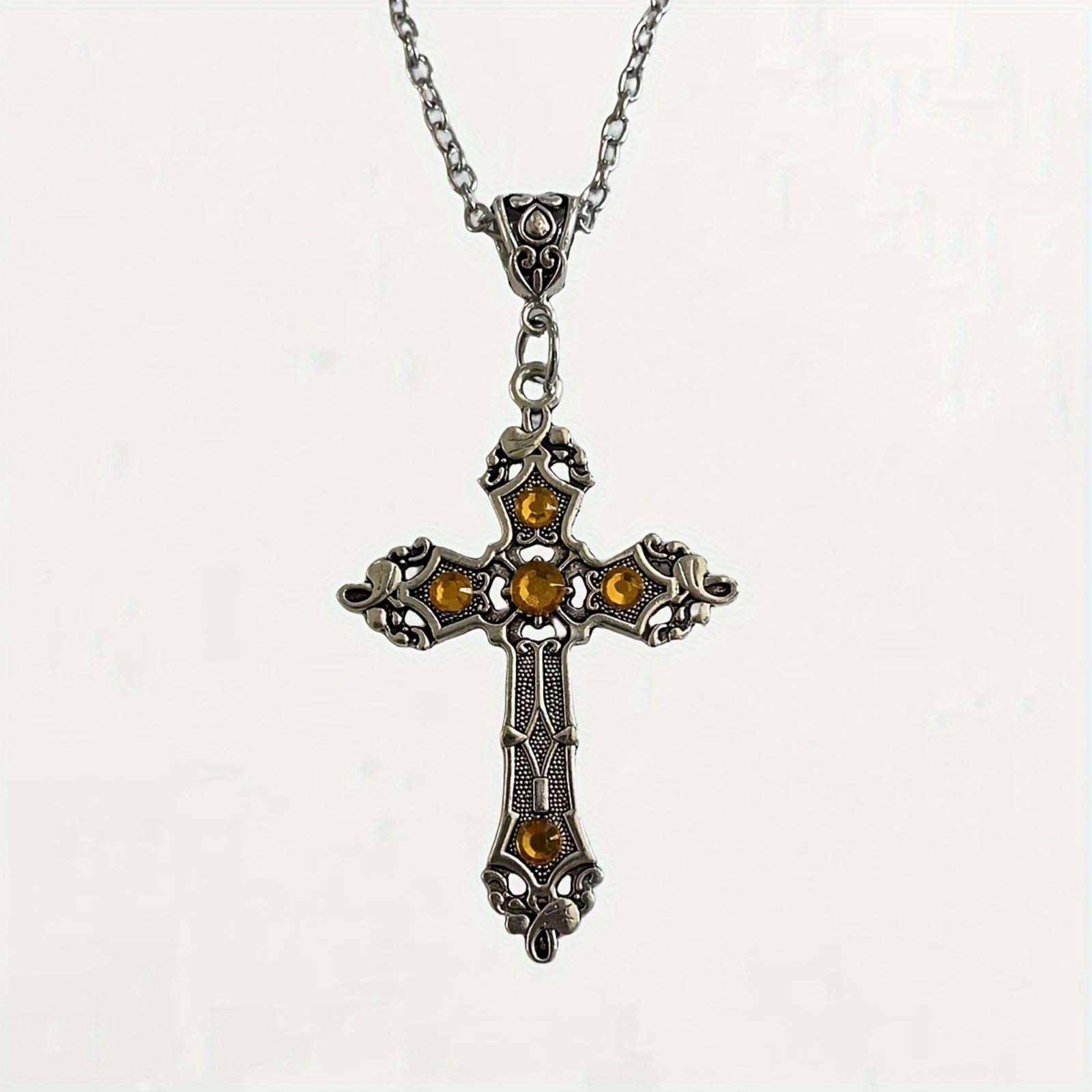 Silvertone pendant of a large, ornate cross on bail loop, with black glass stone center. hangs off of a matching chain.