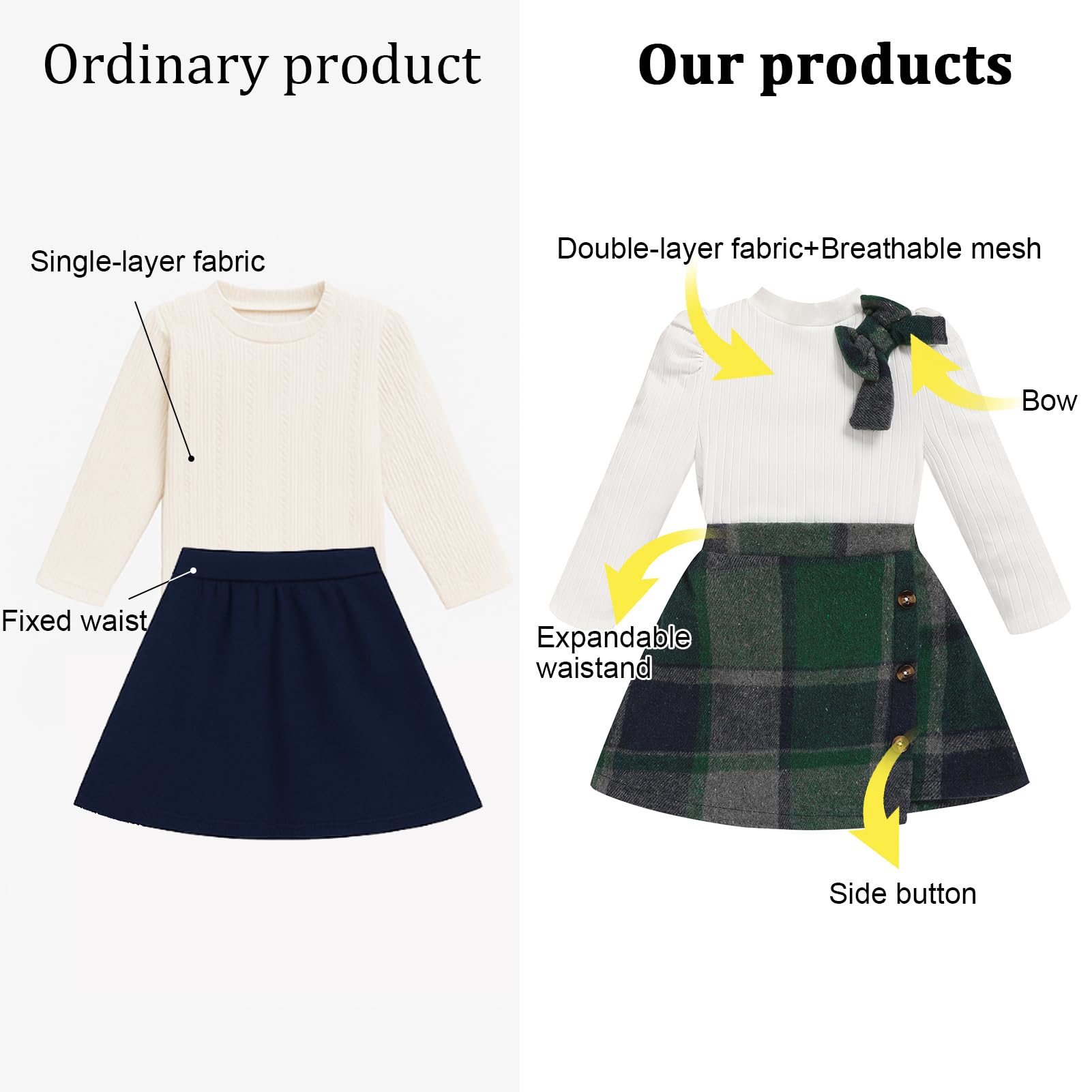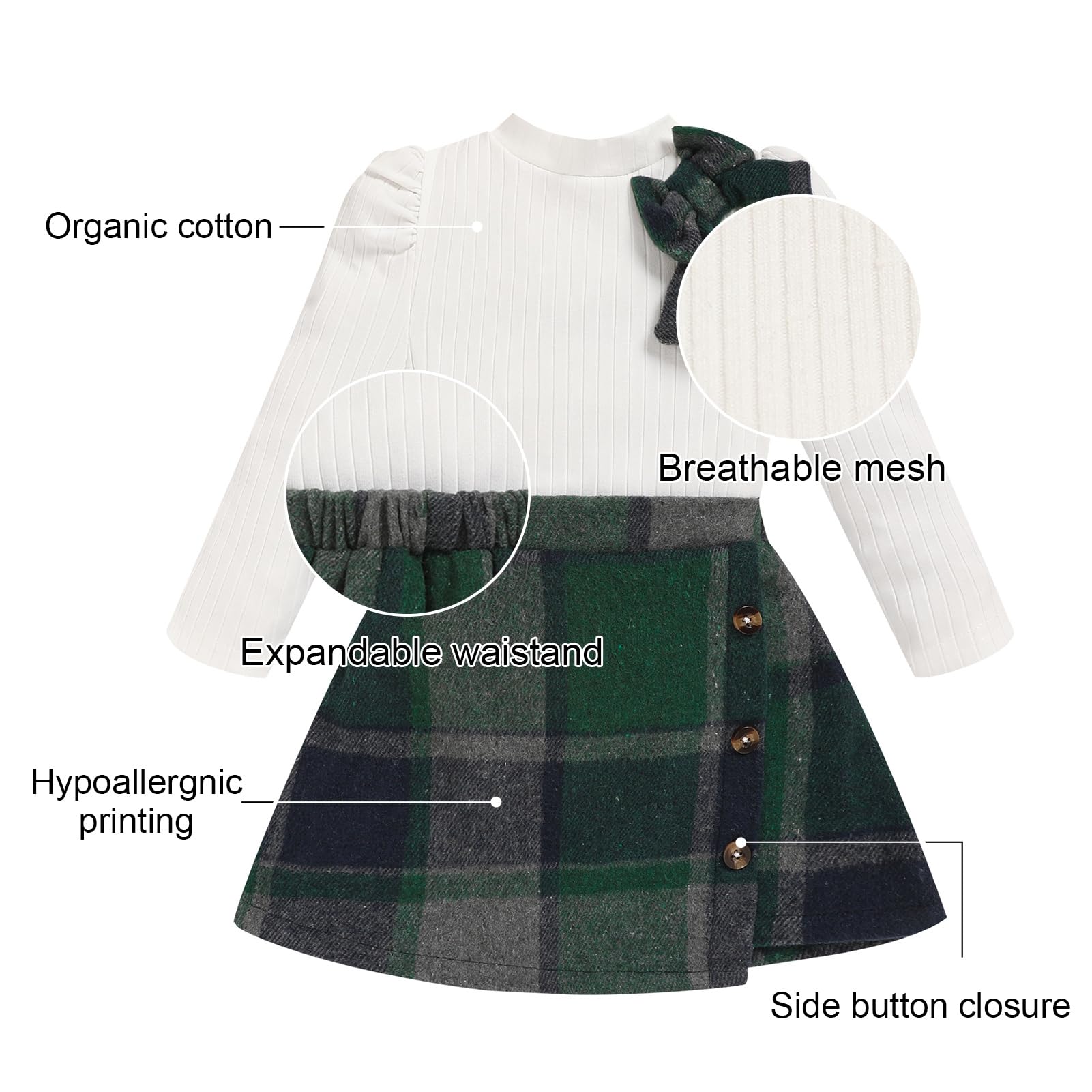 MATERIAL: Toddler girl shirt sweater top is made of cotton and polyester, bottom skirt is made of cotton blend and polyester, soft, breathble, and comfortable, sweet toddler baby girl 2 piece skirt set, cute baby girl clothes.