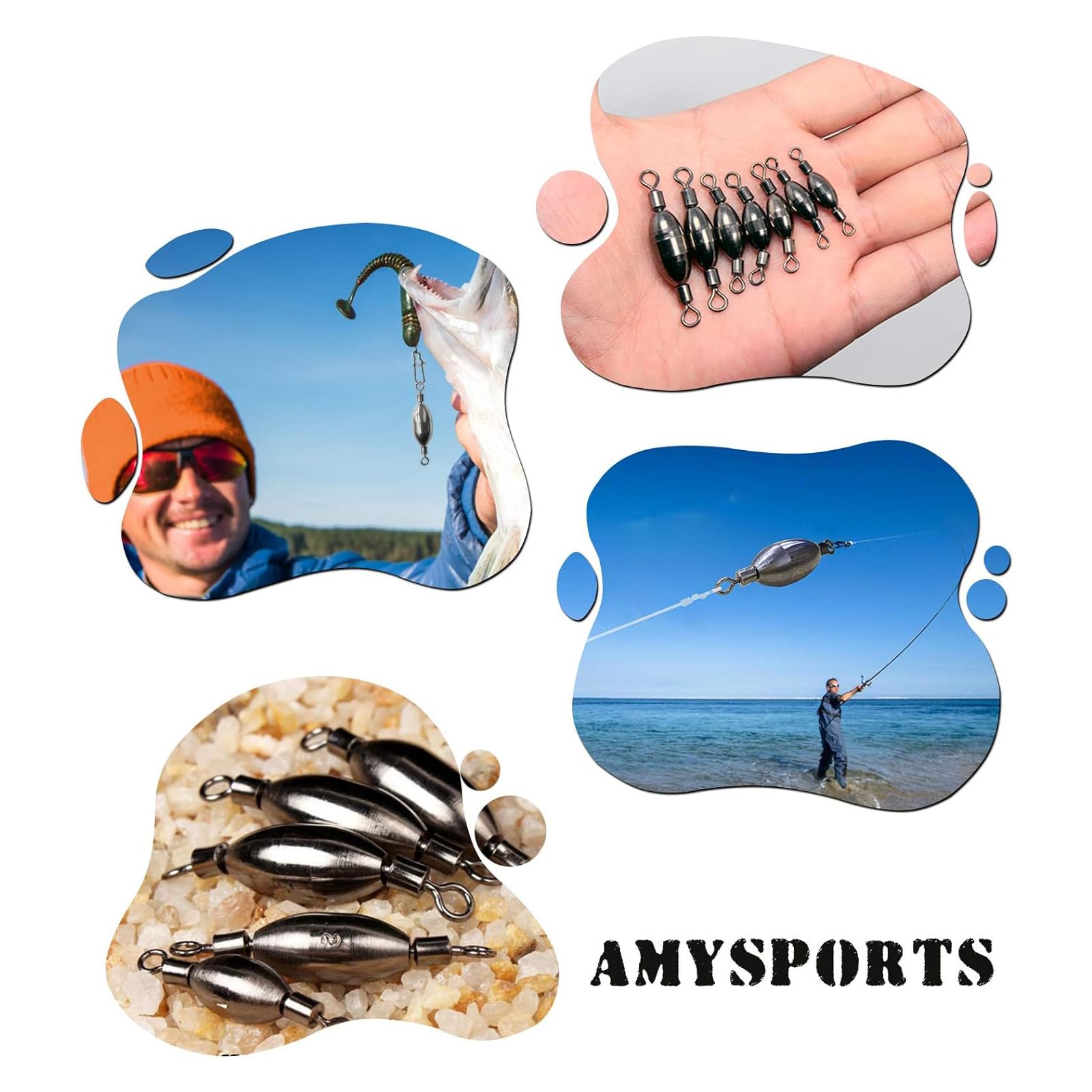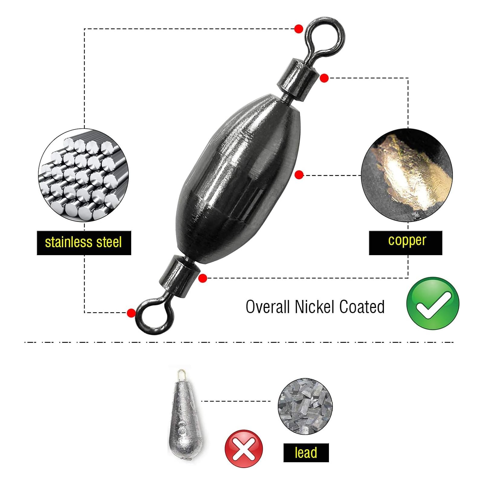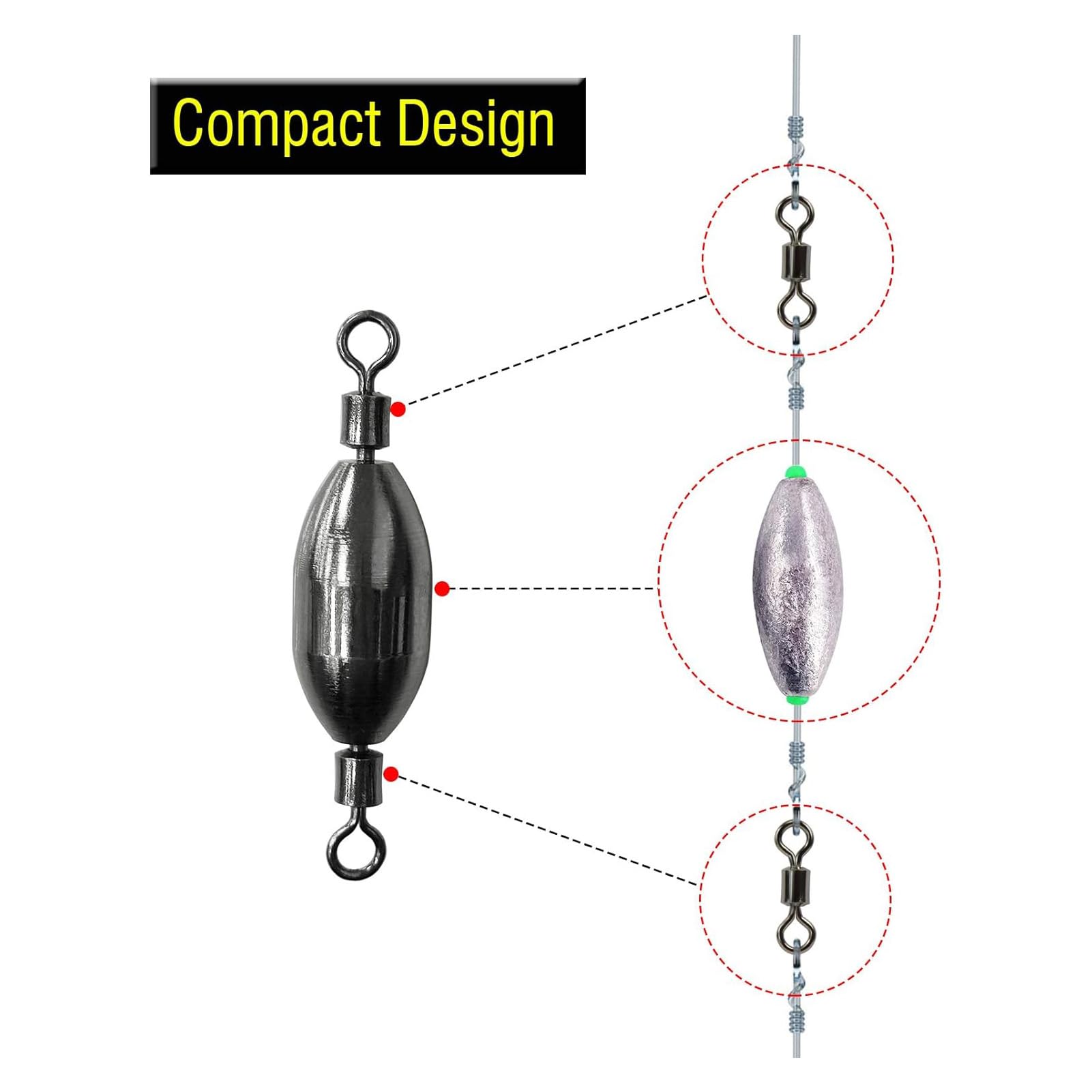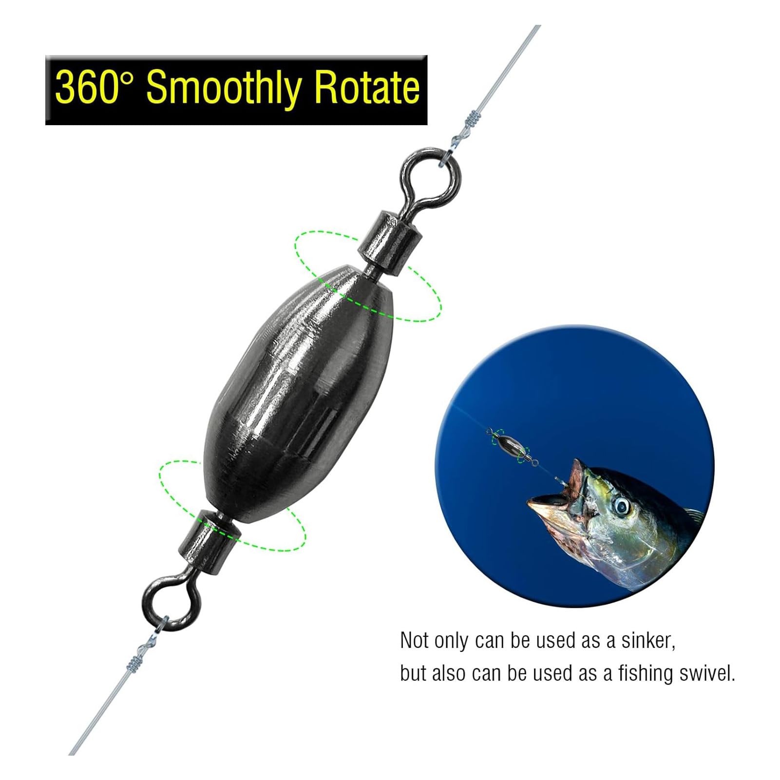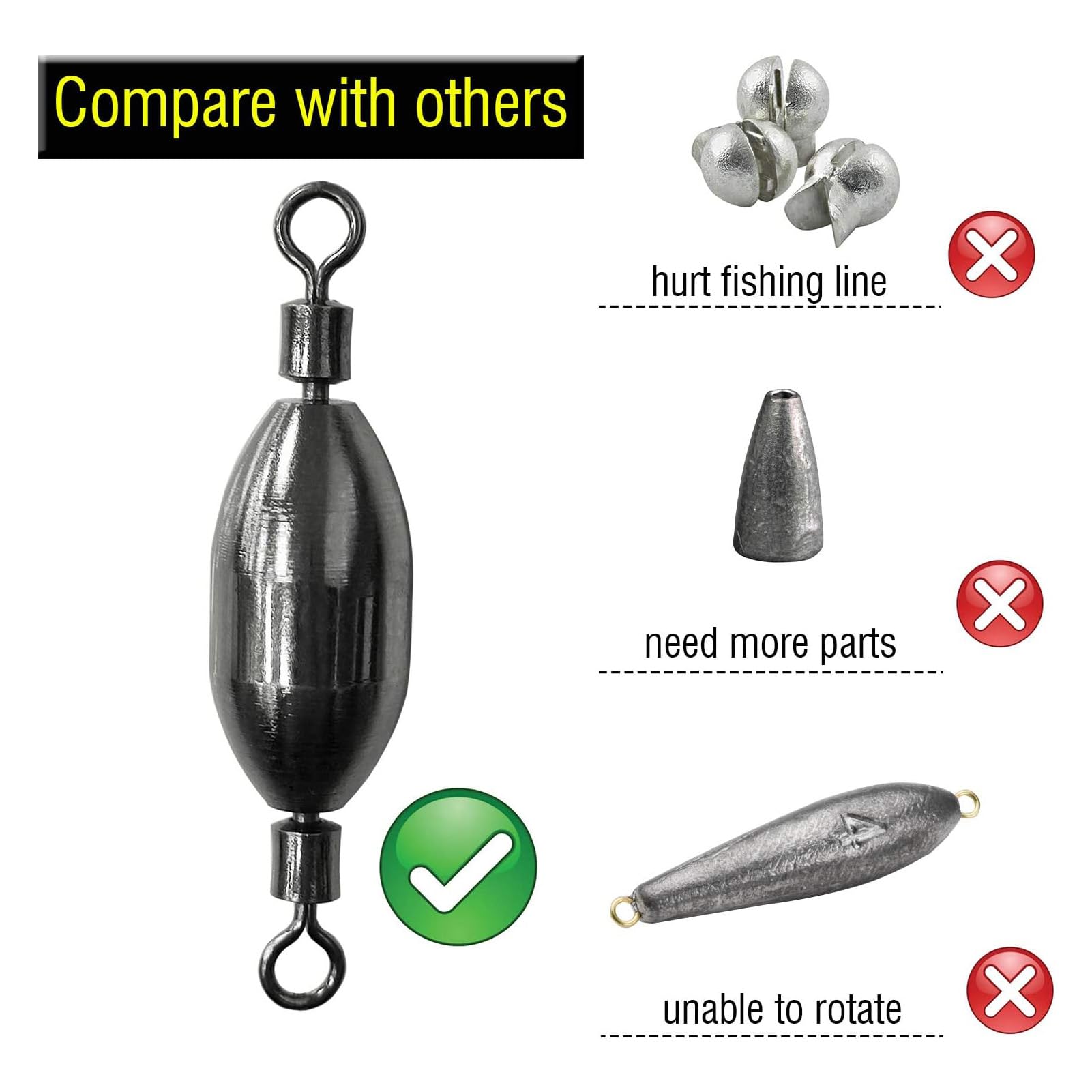 Fishing Weights Sinker With Rolling Swivel: Two in one fishing accessories of fishing weights sinkers and fishing swivel. It has the both advantages of fishing swivel and traditional fishing weights sinkers at the same time.It would save the cost of purchasing fishing swivel. At the both ends of the fishing weights sinkers are fishing rolling swivels, which can be connected with fishing line or lure. The swivels at both ends of fishing sinkers weight can rotate very smoothly.
