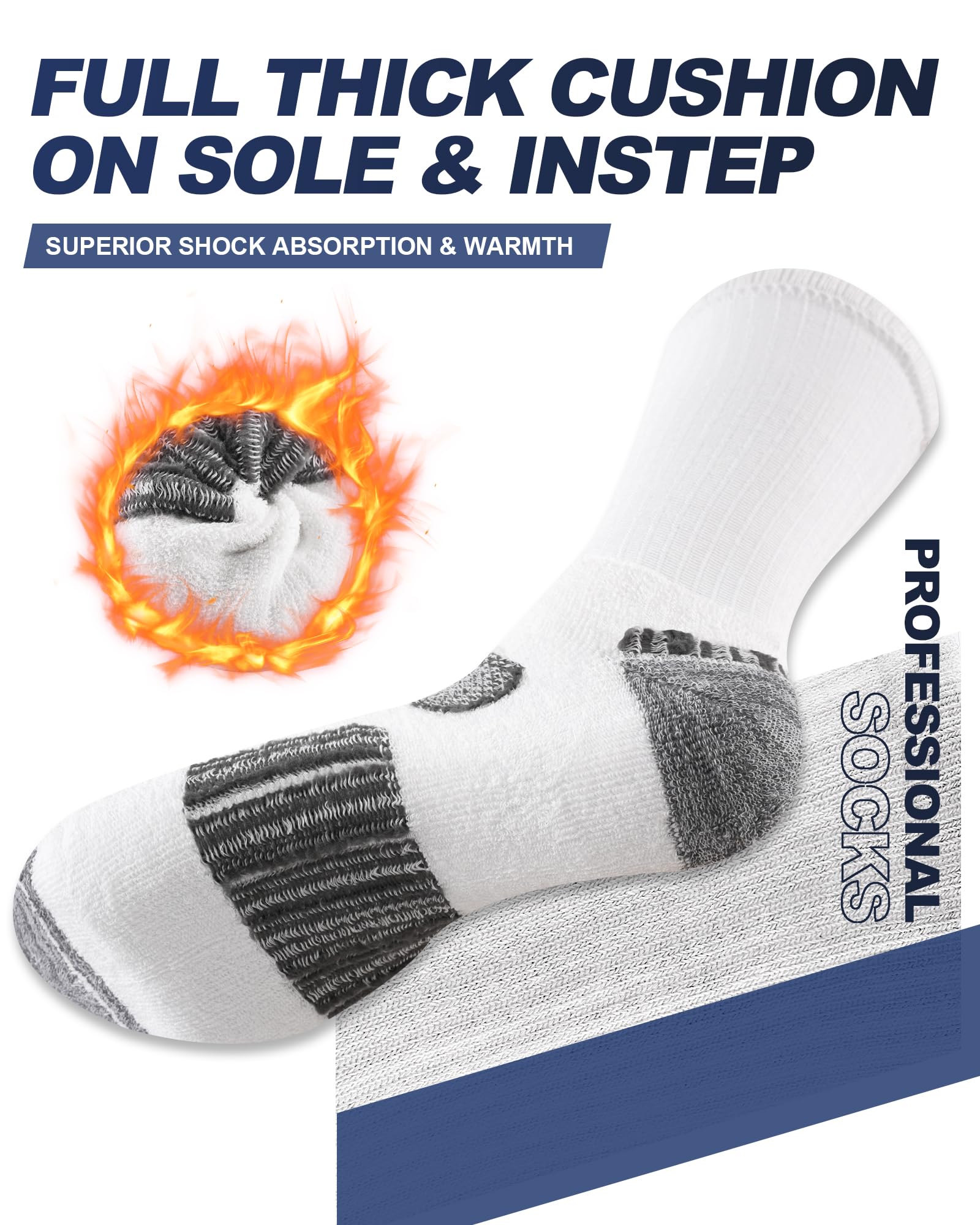 Cushioned sole for shock absorption : Full-foot terry cushioning absorbs impact, reduces foot fatigue, and provides extra comfort during long hours of standing, walking, or hiking. Perfect cushioned socks for men who demand comfort in boots or sneakers.