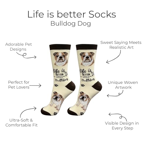 Description Introducing our collection of adorable and vibrant pet lover socks designed exclusively for pet lovers! These funny socks are the epitome of cuteness and novelty, guaranteed to bring a smile to your face. Big image of dog head woven on both sides on the socks and full body image woven on the bottom of the socks with a cute saying that says life is better with Dog. These socks are made in South Korea, These funny socks are made from 200 needle count machines which give life-like detail of your favorite pet. Step up your sock game with our adorable and hilarious Dog Socks, designed especially for pet lovers! These novelty socks are the perfect addition to your collection, featuring cute and silly designs that are bound to make you smile. Made with high-quality materials, these fun socks offer both comfort and style. They add a playful and fashionable touch to your everyday outfits, whether you're dressing up or keeping it casual. Whether you're a dog mom, a dog dad, or simply a dog lover, these socks are a must-have. With their delightful designs and comfortable fit, these socks are a fashionable treat for pet lovers and make great novelty gifts and dog mom gifts.