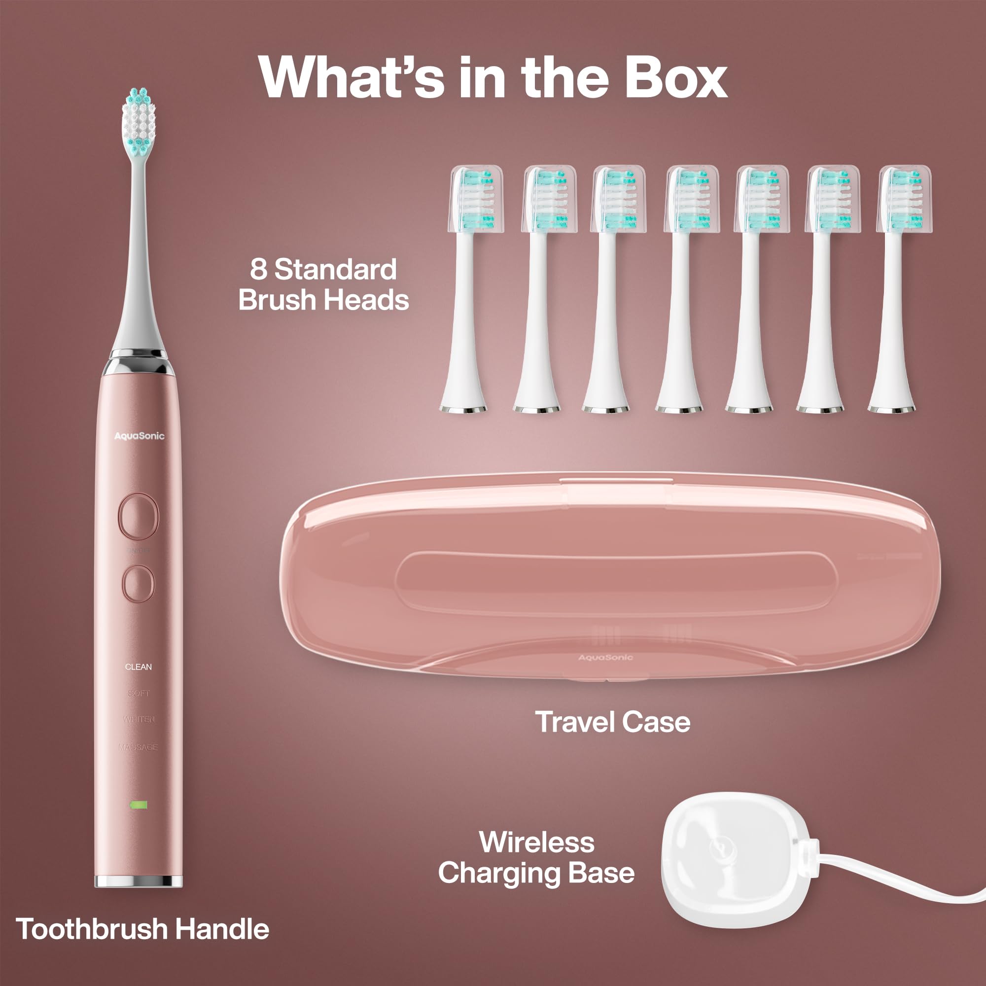 What's in the Box – 1 Satin Rose Gold Smart Toothbrush, 8 DuPont brush heads, 1 custom travel case, user manual, warranty card..