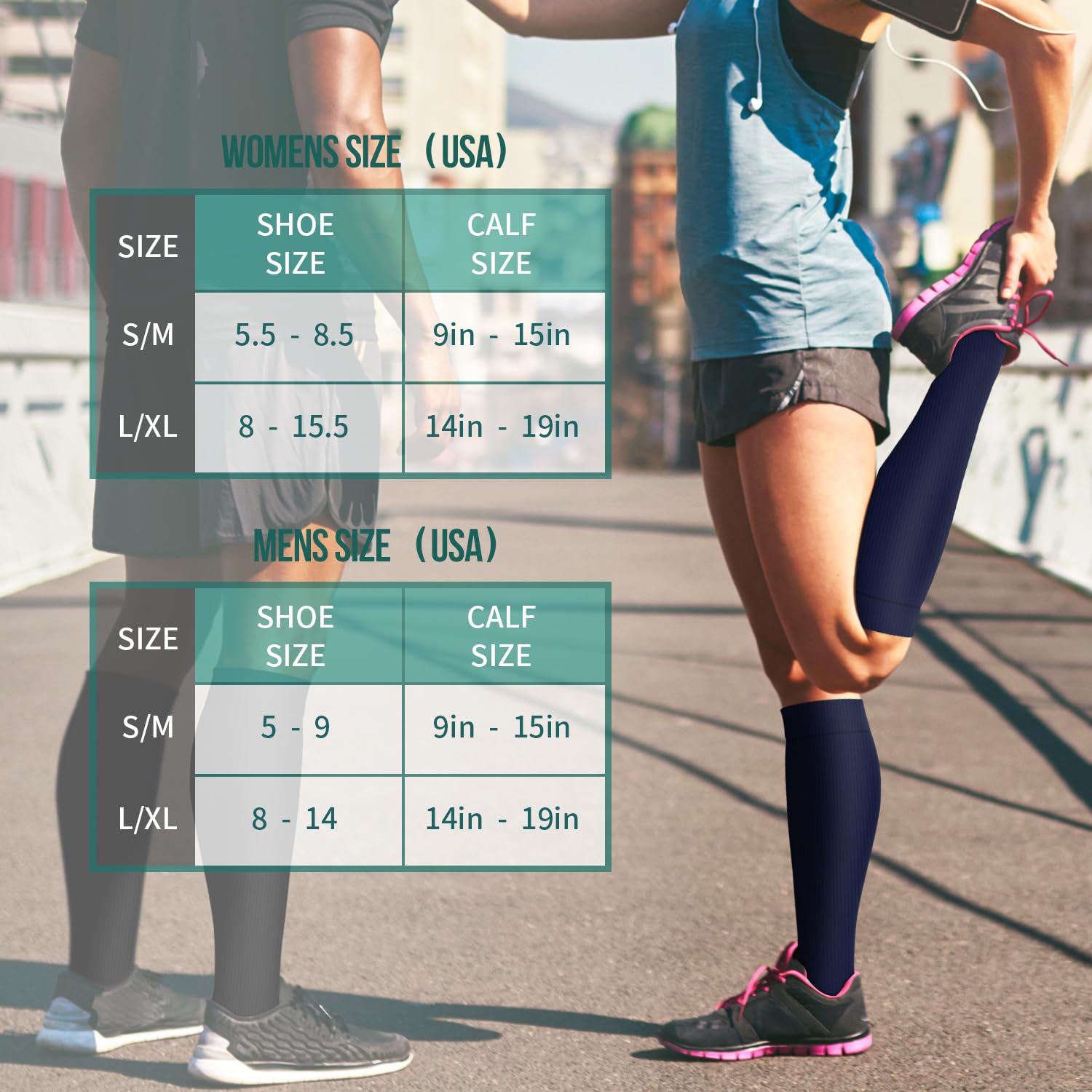 LAB TESTED GRADIENT COMPRESSION -Our Graduated Compression Socks put pressure in just the right spots,work by creating a "pressure gradient"(using graduated compression of 15-20 mmHg)which helps to push oxygen-poor blood out of the feet and legs,and back to the heart. More blood pumping means more Healthier legs and less pain+swelling.Great for long periods of sitting or standing, endurance sports, flying and travel, post-workout recovery, pregnancy, and spider & varicose veins.
