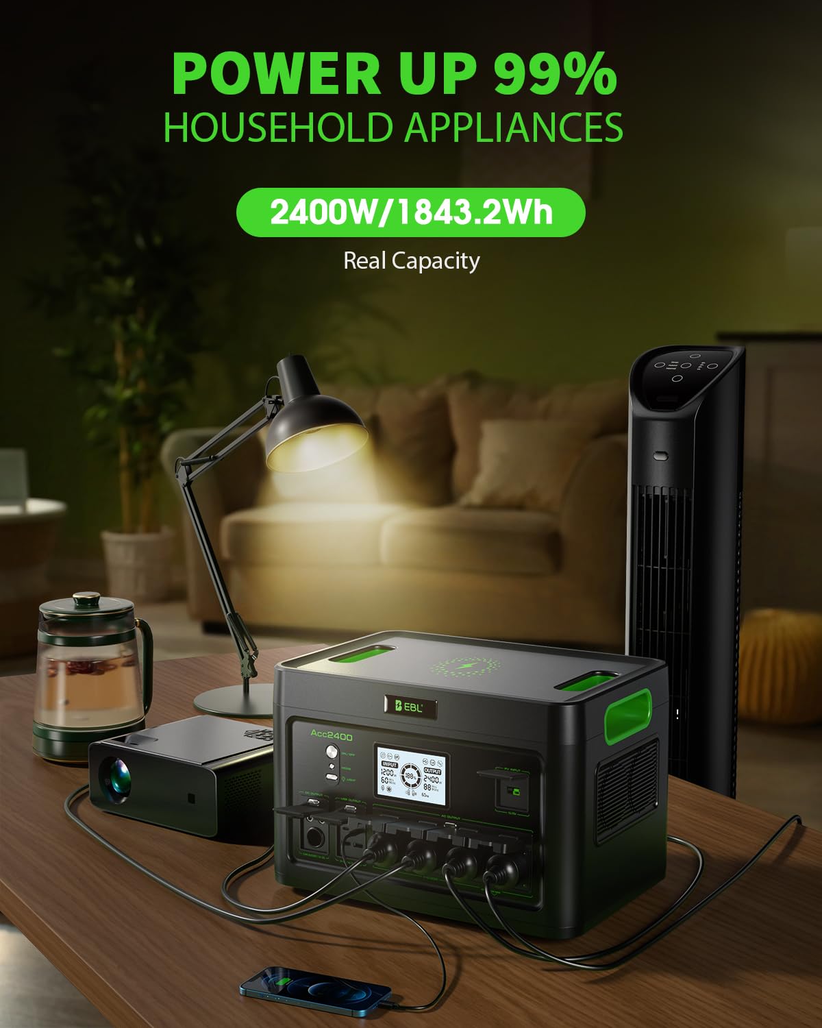 HUGE CAPACITY POWER BEAST - Our portable power station is equipped with a 1843.2Wh/576000mAh LiFePO4 battery, 2400W gigantic capacity, compatible with more than 99% of electric devices, even heavy load devices, such as air conditioners, microwaves. It will serve as your backup power supply or power bank, power your home emergency and RV camping necessities well, and all you need to do is enjoy the good times.
