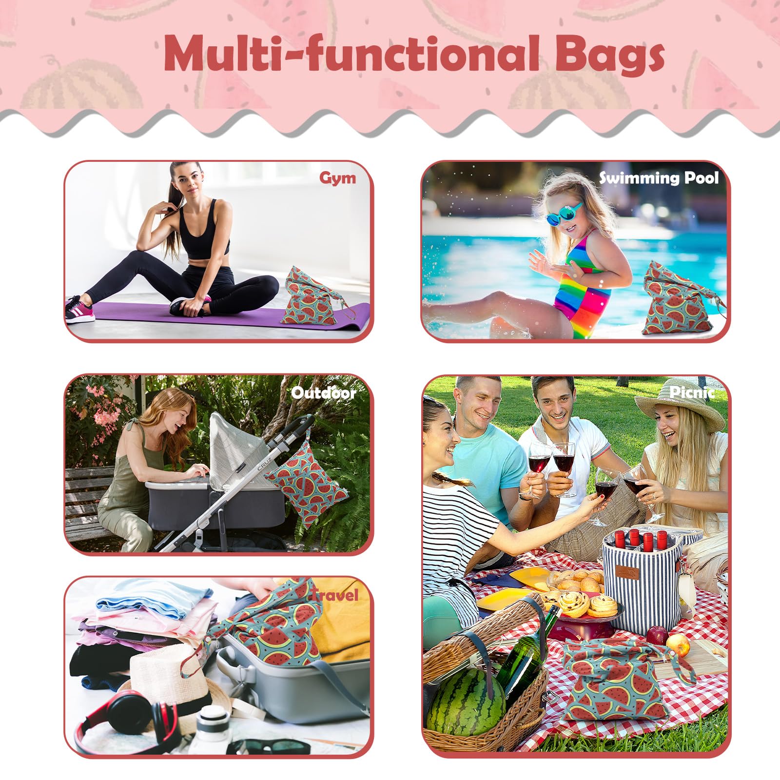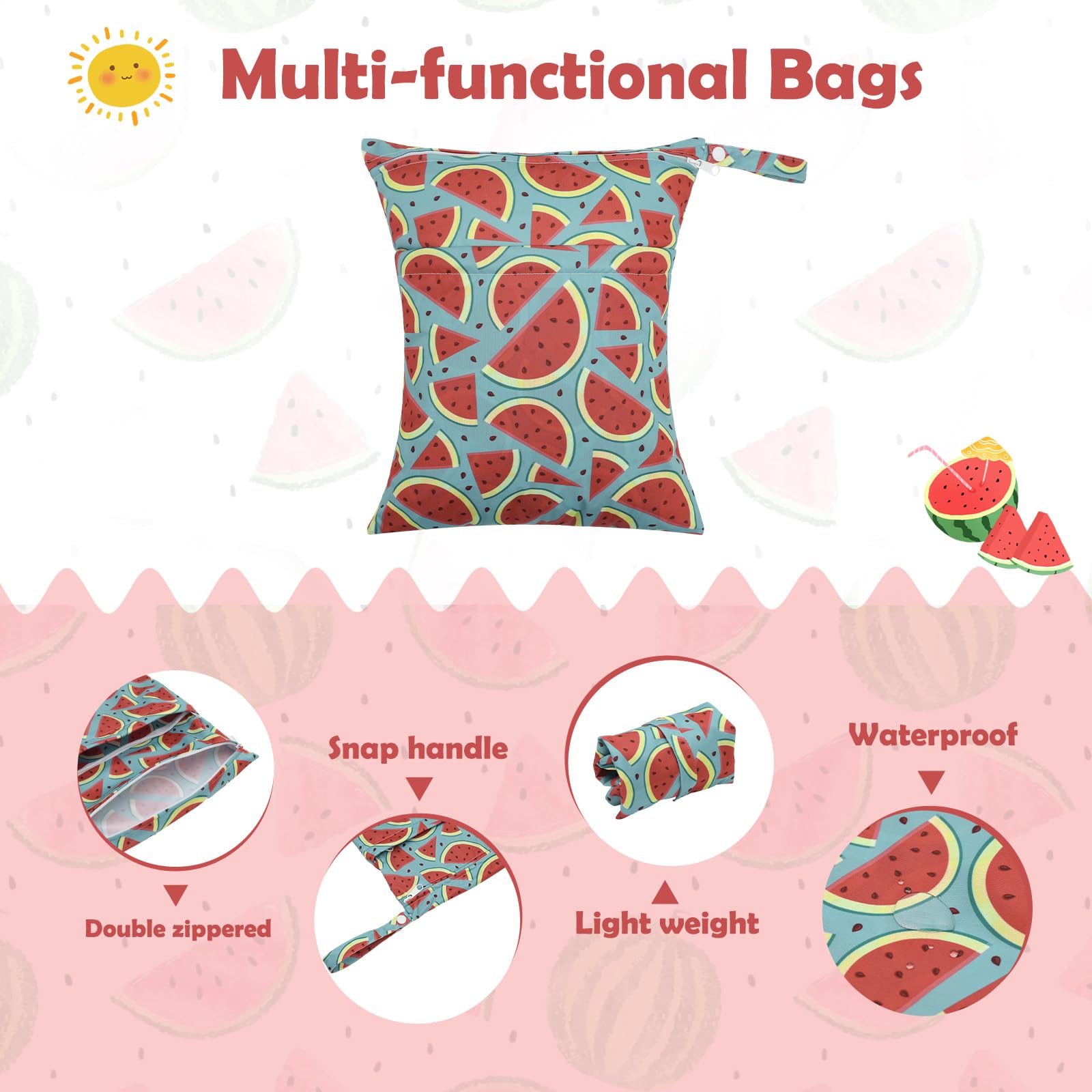 Multi-functional Bags-A truly wonderful bag that allows you to carry your wet and dry items in the same bag. Carry all your items in one bag while keeping your dry items dry and your wet or soiled items separate. Truly an all in one bag! They can be used as diaper wet dry bags,travel bags,storage bags,cosmetic bags,handbags,wash bag,organizer bags.