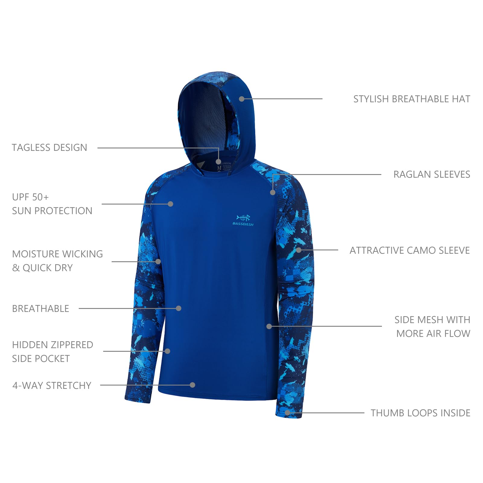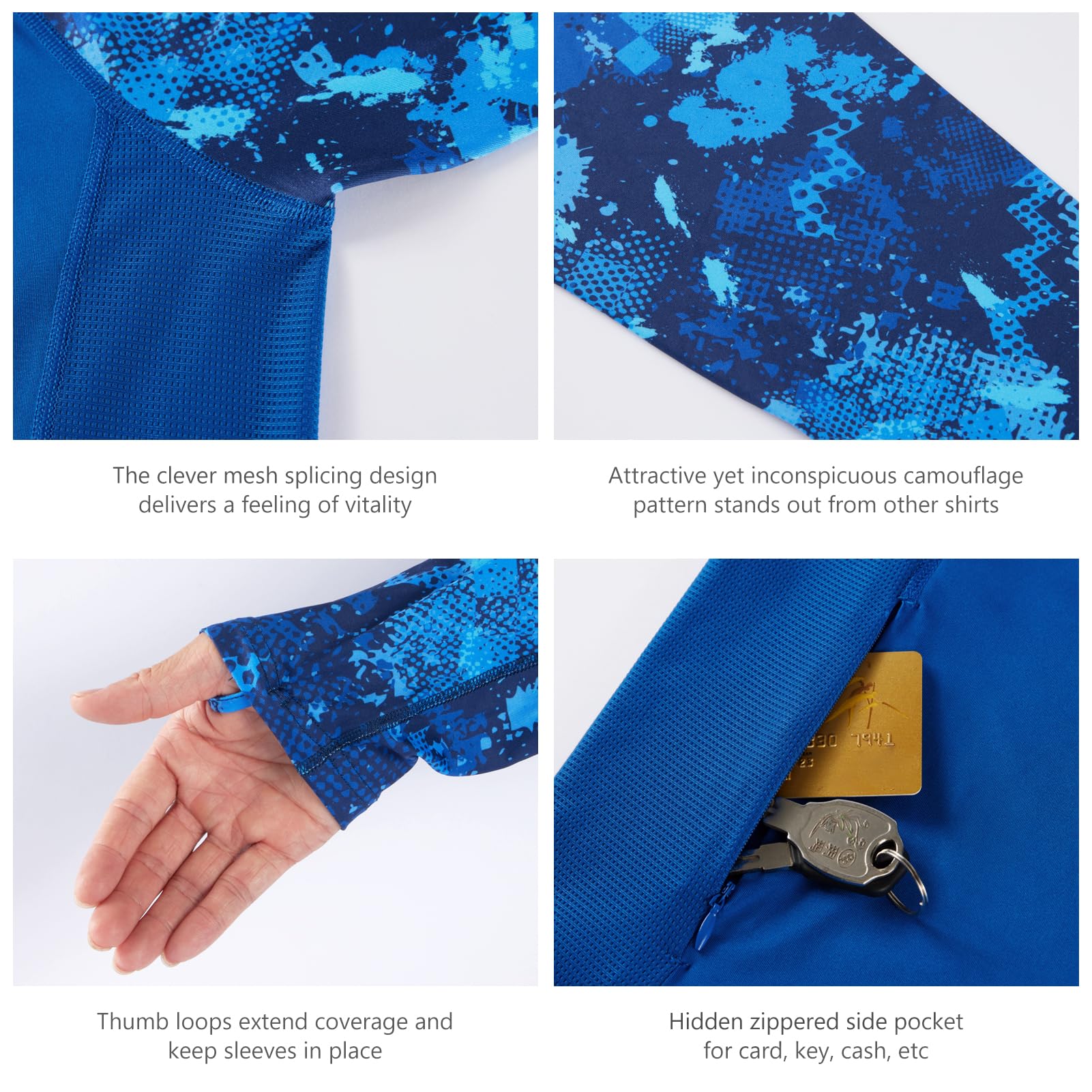The streamlined hood provides greater sun protection over your neck and ears; The built-in thumbholes are designed to keep the sleeves in place; Hidden zippered side pocket for keeping your personal belongings like card, key, cash, etc