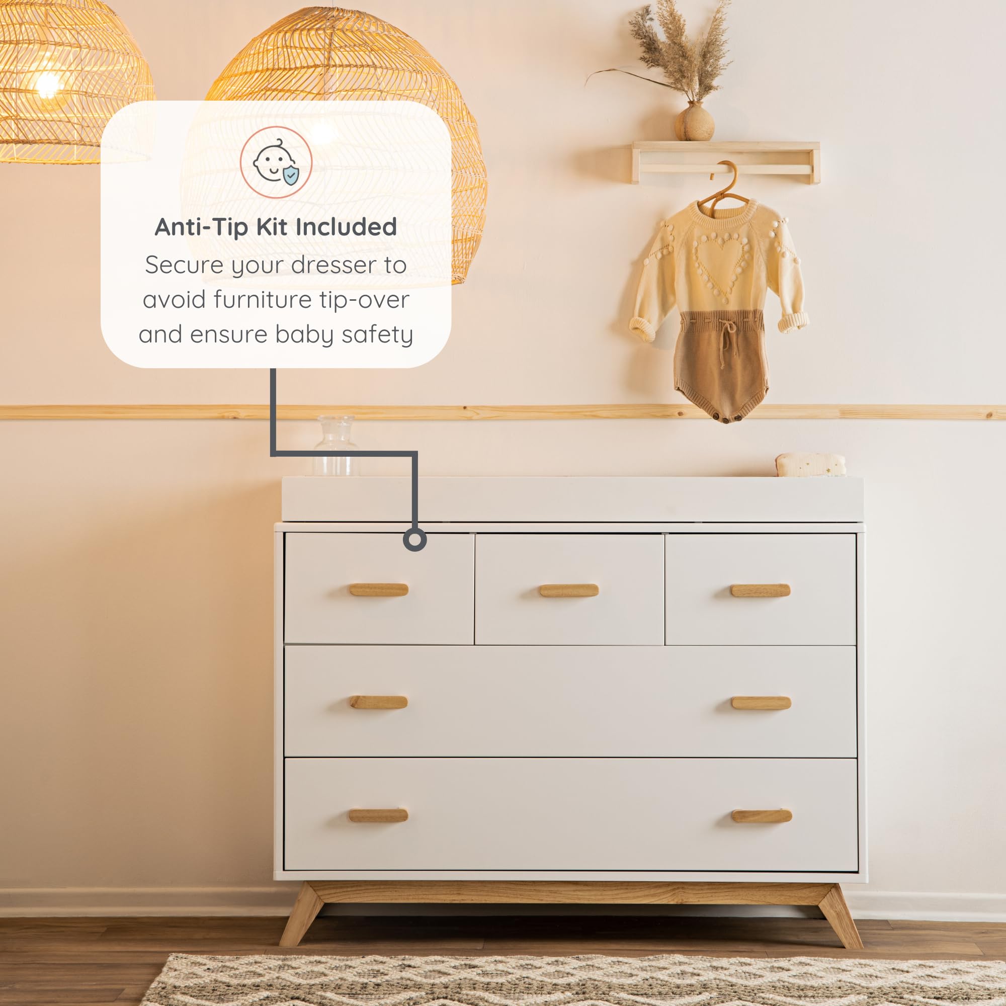 Stylish 5-Drawer White Dresser for Any Room: This versatile white dresser pairs perfectly with the Soho 3-in-1 Crib or stands alone, adding a touch of mid-century style to your bedroom or nursery. Ideal as a baby dresser, this piece offers both beauty and functionality for kids' bedrooms and nurseries. Ships in 2 separate boxes.