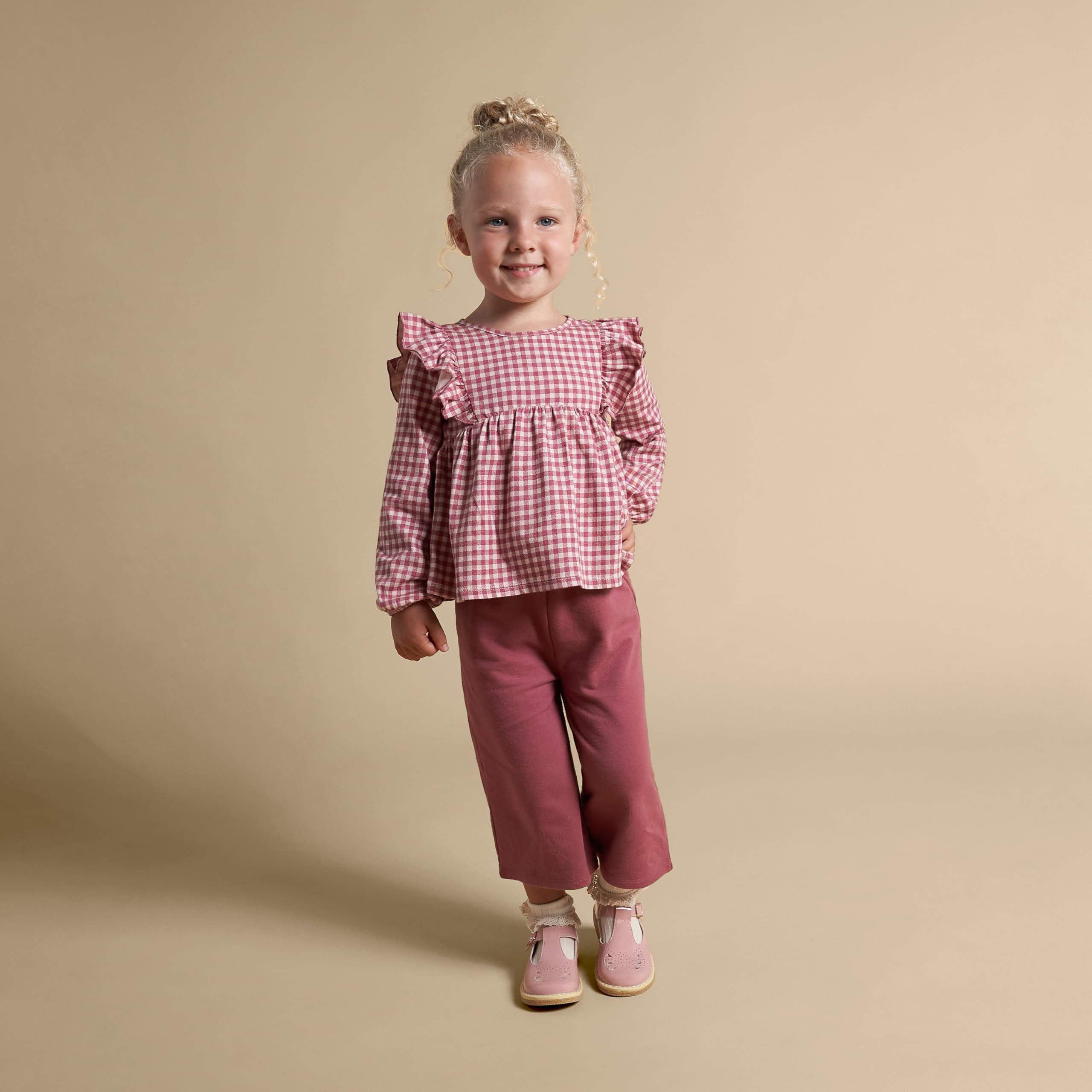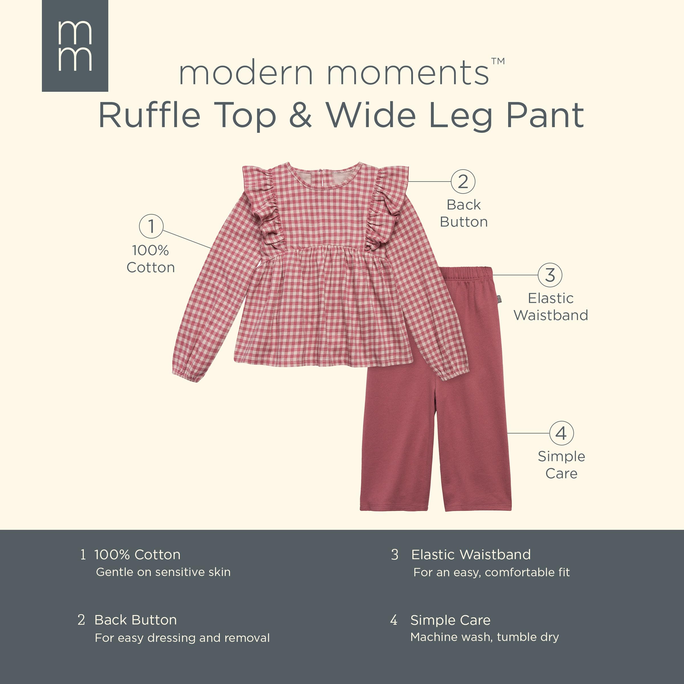Description Elevate your little one's style with our adorable baby or toddler top and pants set, made from 100% cotton for a gentle feel on sensitive skin! Perfect for cooler weather, this set features long sleeves and pants to keep your child warm and cozy. Elastic at the sleeve cuffs and pants' waistband provides a comfortable fit that moves with your little one as they play or go about the day. And with faux wood buttons on the back of the shirt to secure the top and stylish shoulder ruffles adding a touch of charm, this set is sure to become a wardrobe favorite.