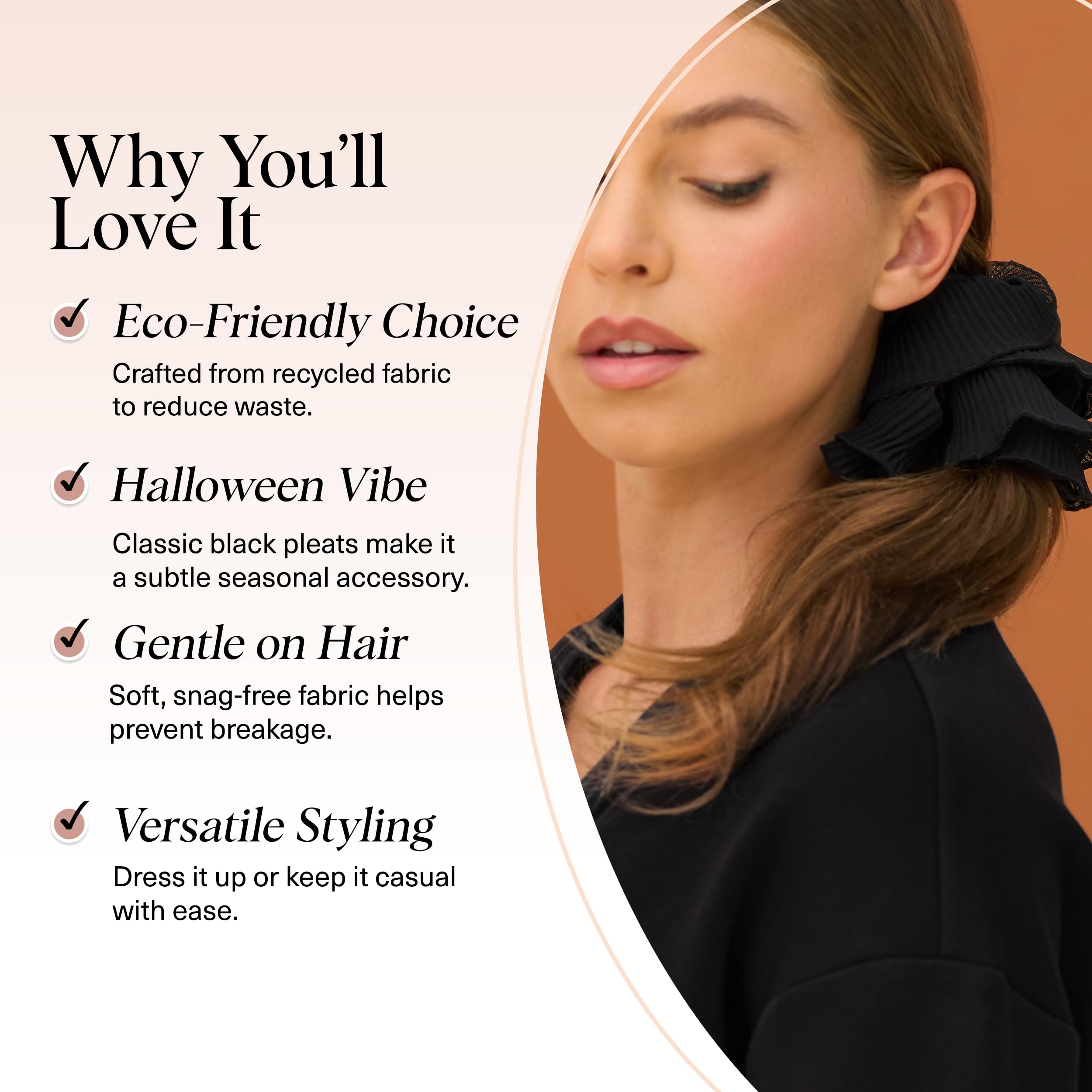 DRAMATIC HALLOWEEN STYLE: Make a bold seasonal statement with this pleated black hair scrunchie, a standout among hair accessories for women. Its striking texture and deep color add spooky elegance to ponytail holders or buns. Perfect for festive hair care routines, this scrunchie delivers Halloween charm while pairing effortlessly with everyday outfits and other scrunchies for women for a polished, playful finish.