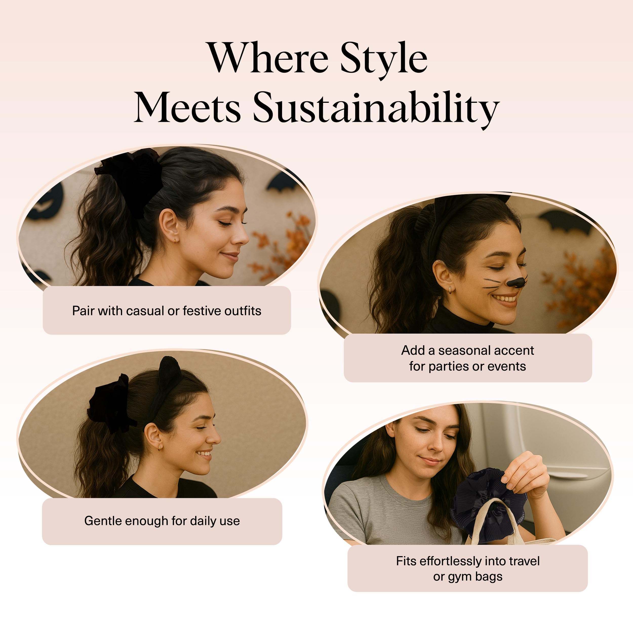EASY HAIR TIE FOR ALL STYLES: Designed for quick styling, this black scrunchie doubles as a practical hair tie for ponytails, messy buns, or elegant updos. Use it like your go-to elastic hair ties when creating everyday looks or spooky-season hairstyles. A must-have among scrunchies for women, it blends durable construction with soft fabric for comfort and hair care without snagging or stress.