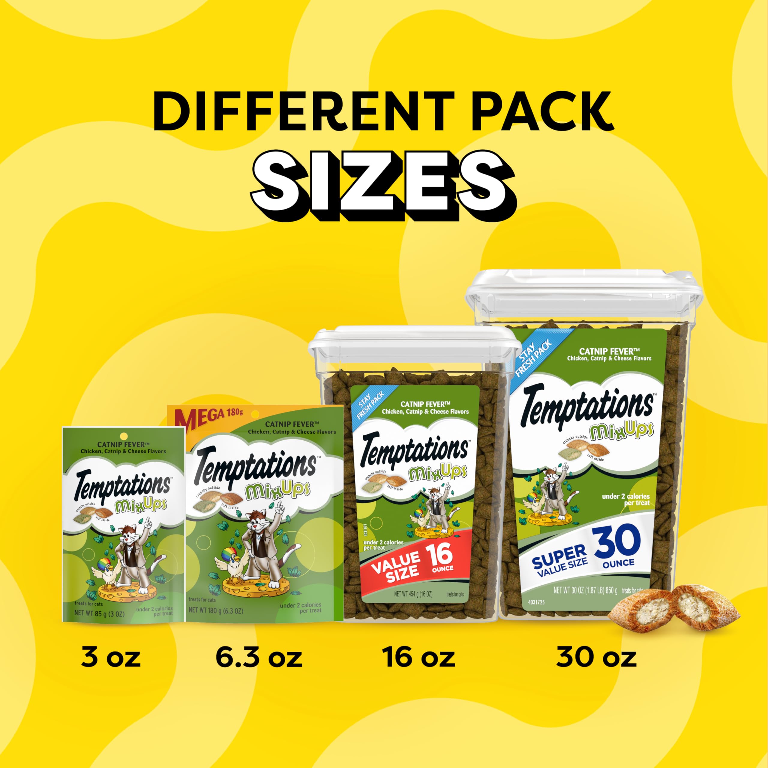 Cats love the delicious, crunchy taste of Temptations Catnip Fever Flavor treats, so give your feline the purr-worthy Temptations crunchy catnip treats, and they'll come running the moment you open the cat treats crunchy snack pack. Each bite has less than 2 calories and is an irresistible dual-texture treat that is crunchy on the outside and soft on the inside, ideal snack in a daily routine. The stay-fresh pouch lets pet parents and cat owners keep the chewy cat treats ready when it's feeding time and sealed tight when it's not. Temptations treats for cats slide naturally into a regular routine: serve as a reward, a meal, or sprinkle as a cat food topper. Temptations Cat Treats remain the perfect way to show your feline friend just how much you care while giving them nutritious rewards.
