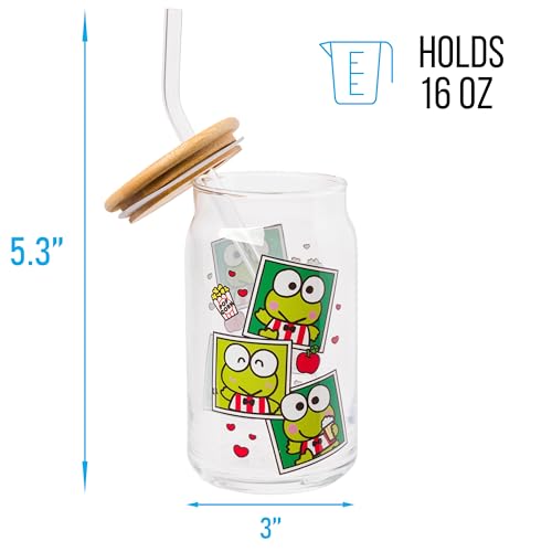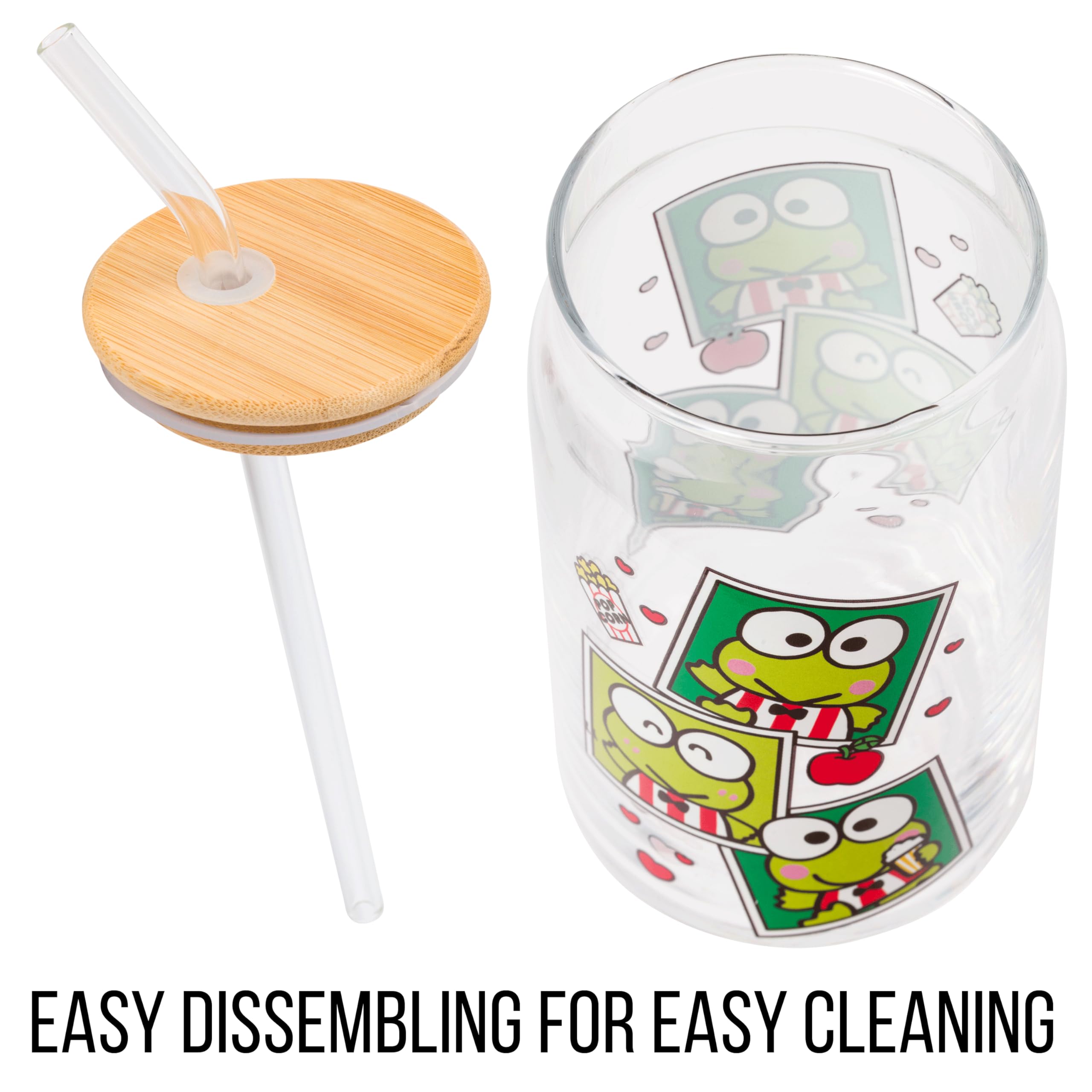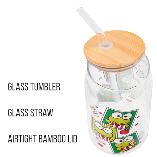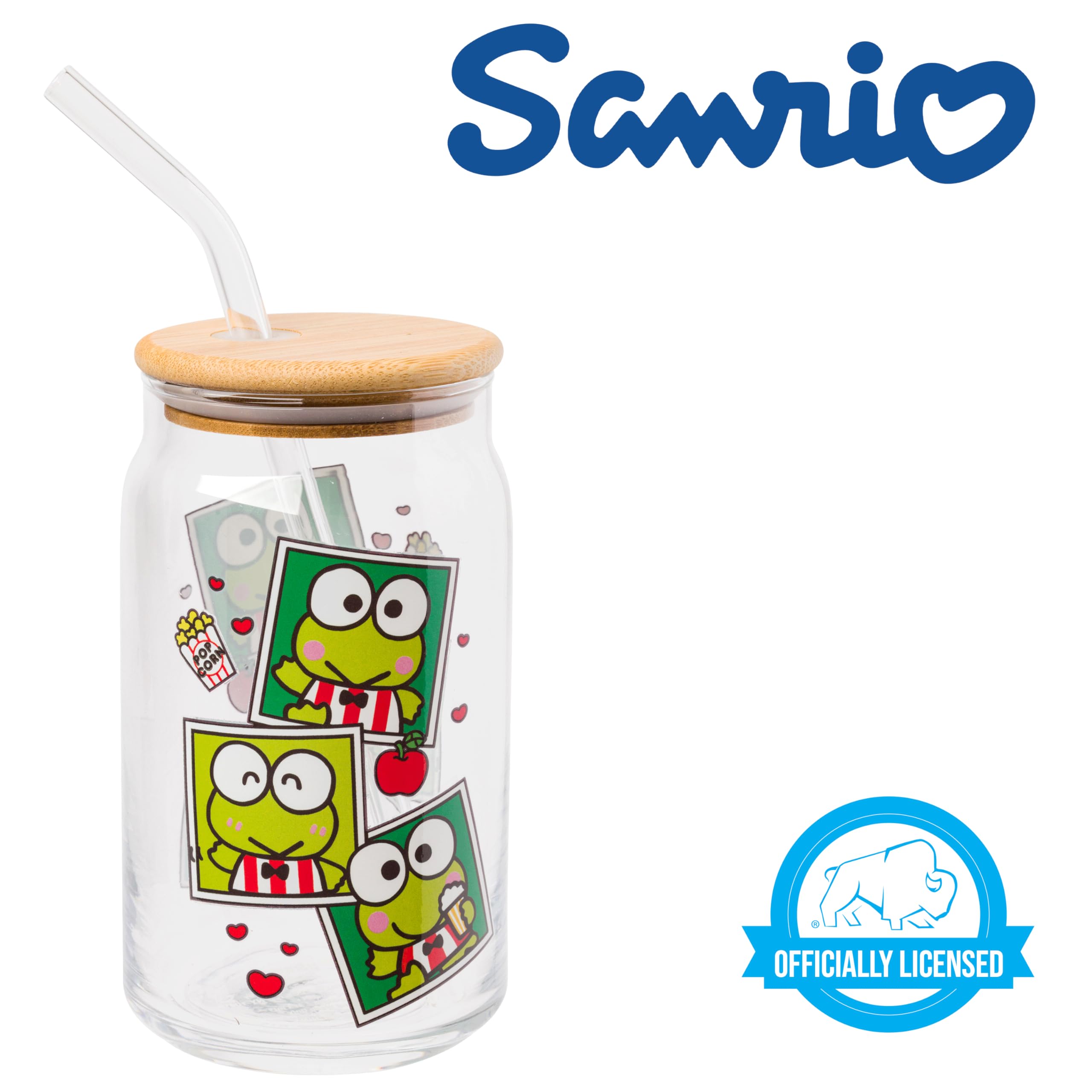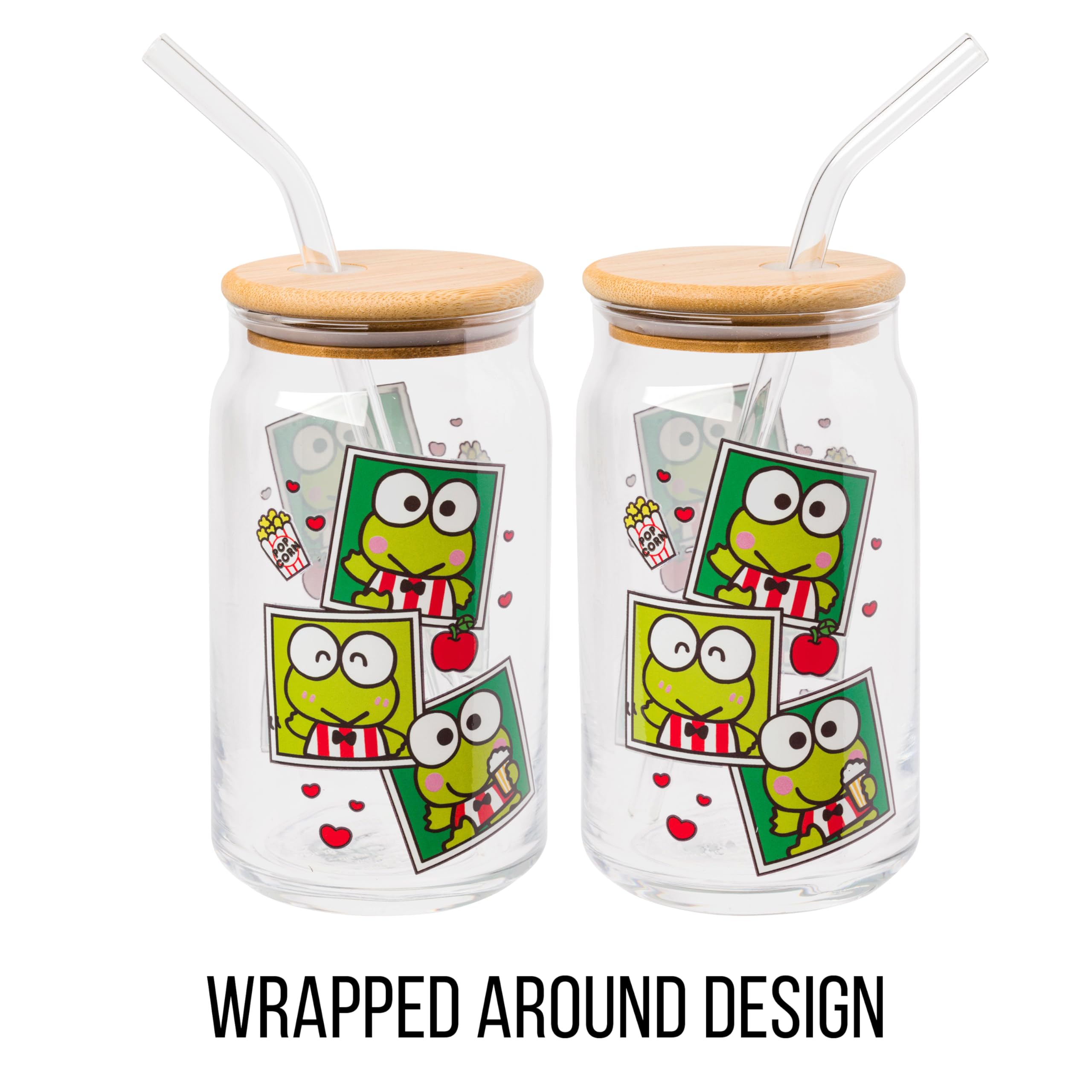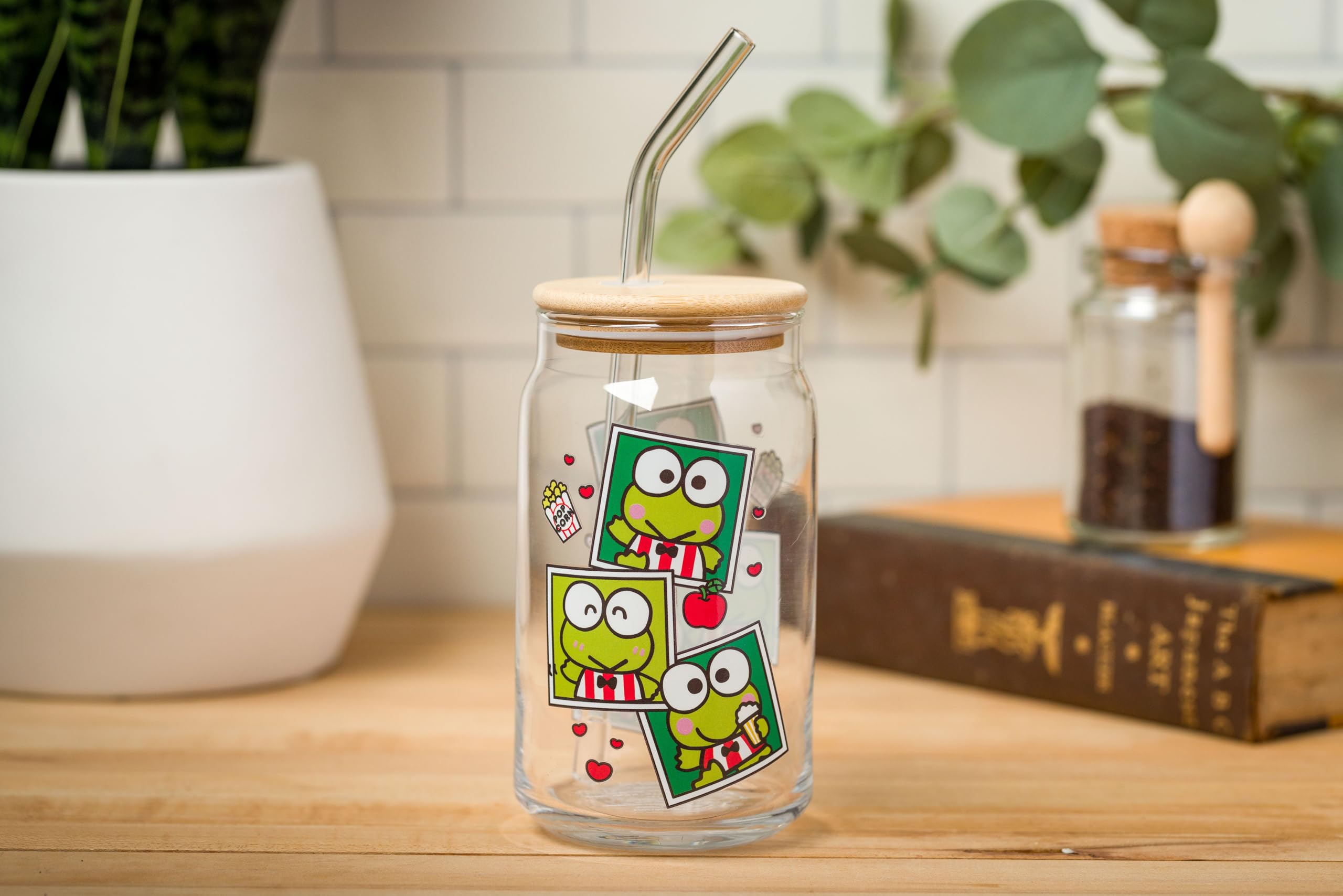 KEROPPI GLASS TUMBLER: Adorable 16 oz glass tumbler featuring a playful snapshot border design of Keroppi. Includes a bamboo lid and reusable glass straw, perfect for enjoying your favorite beverages in style
