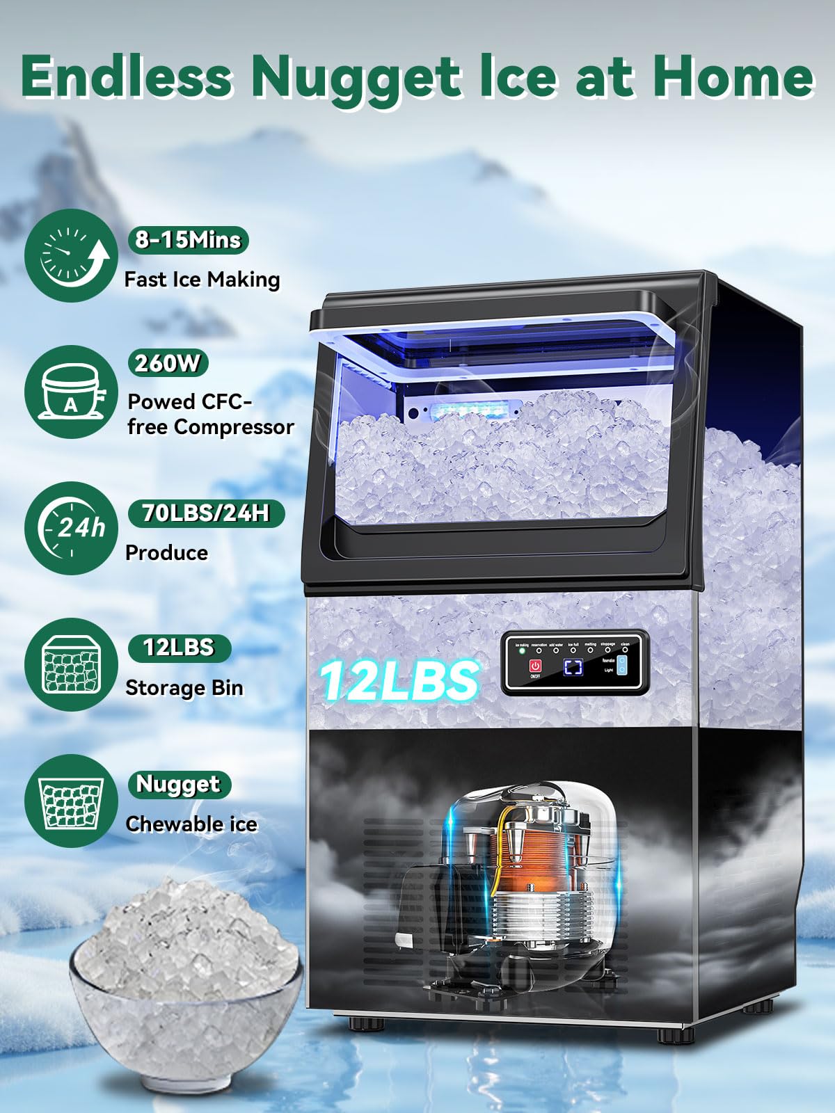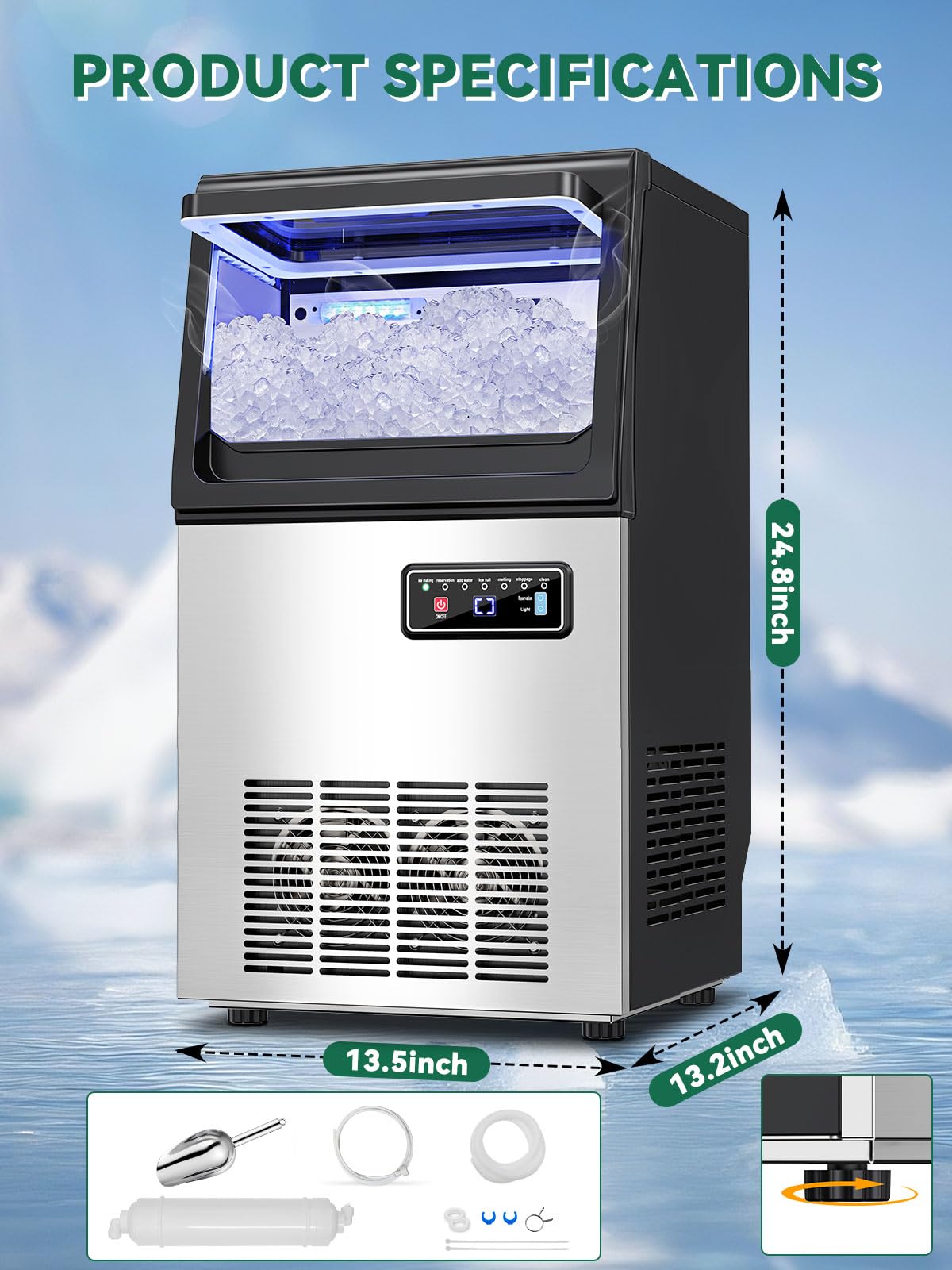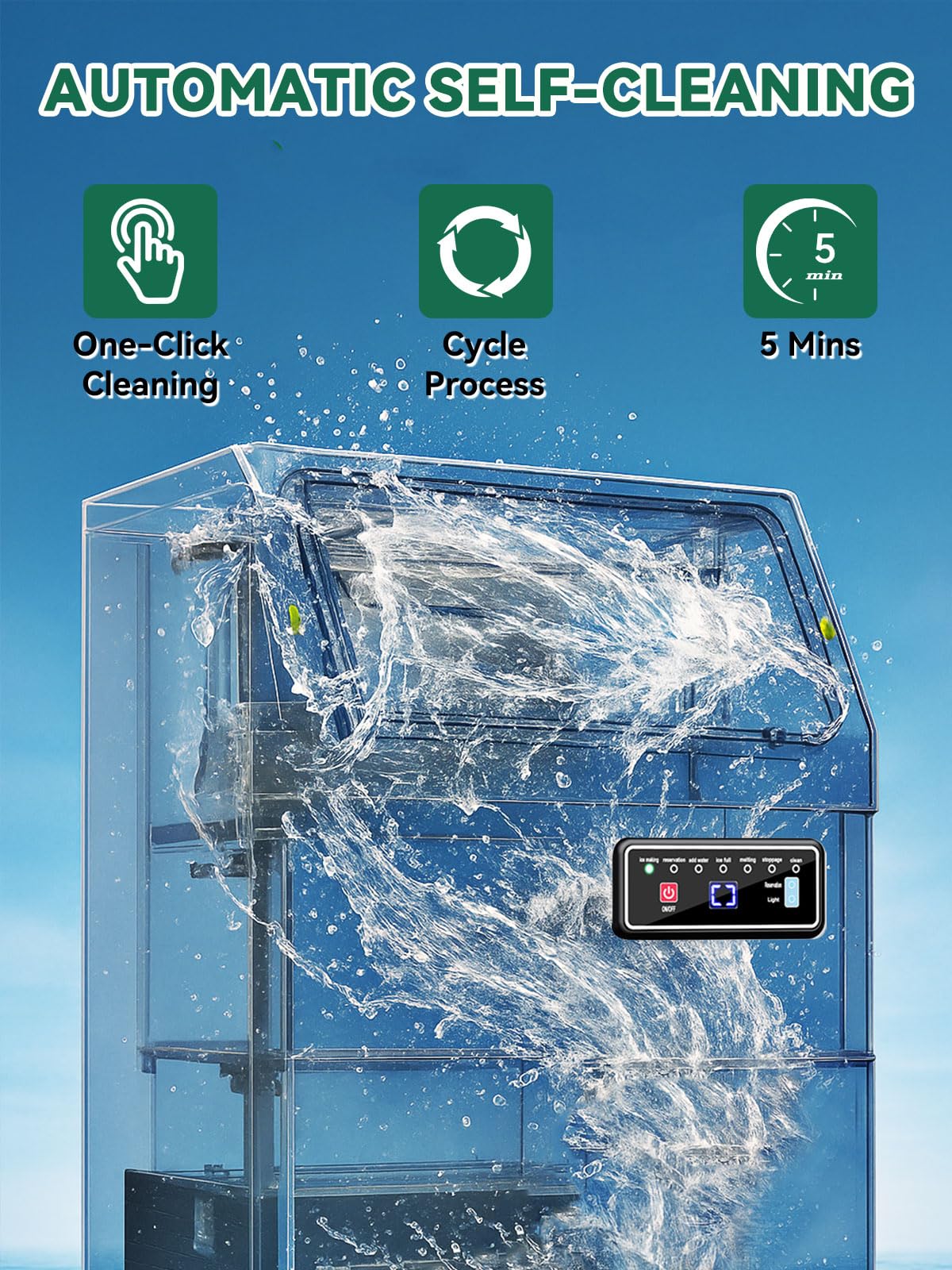 Smart Controls at Your Fingertips. Our freestanding nugget ice maker equipped with an intuitive LCD control panel, operation is simple and straightforward. Features include 24-hour programmable timer, one-touch self-cleaning, real-time error alerts, and soft blue LED lightingโmaking every use effortless and efficient.
