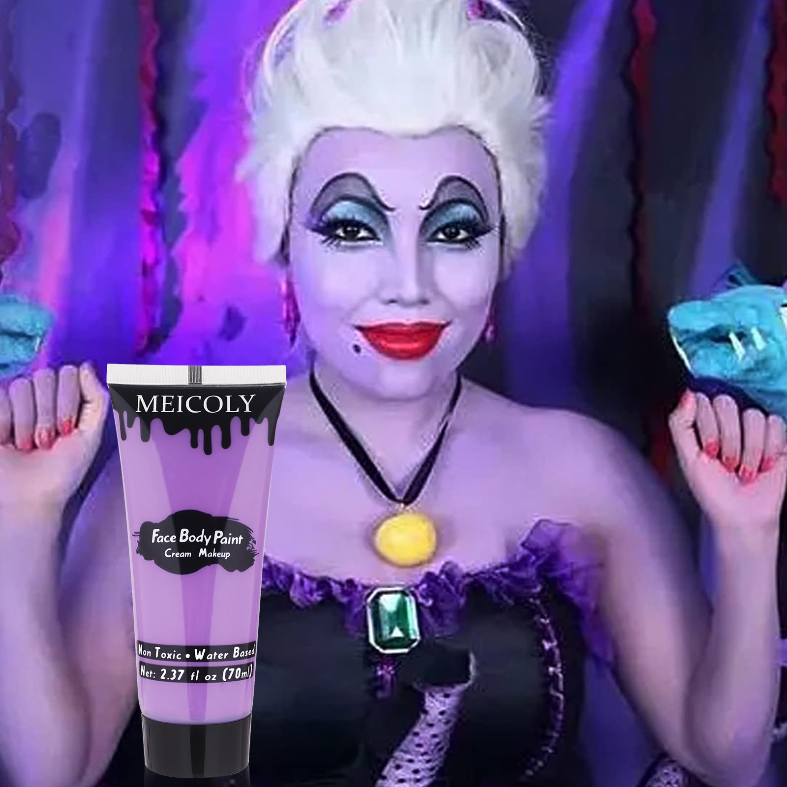 ✔Professional Halloween SFX Ursula Cosplay Makeup Face Paint --- 2.37Oz/70g for our purple face paint,meet your need for Halloween Ursula cosplay makeup with full coverage.Infused with special formula,no fading and no cracking when wearing it.The nice consistency makes it blend into the skin easily with a brush, sponge or finger.It may need some time to dry.To avoid smearing when put on,we advise use the setting powder or setting spray after applying the face body paint