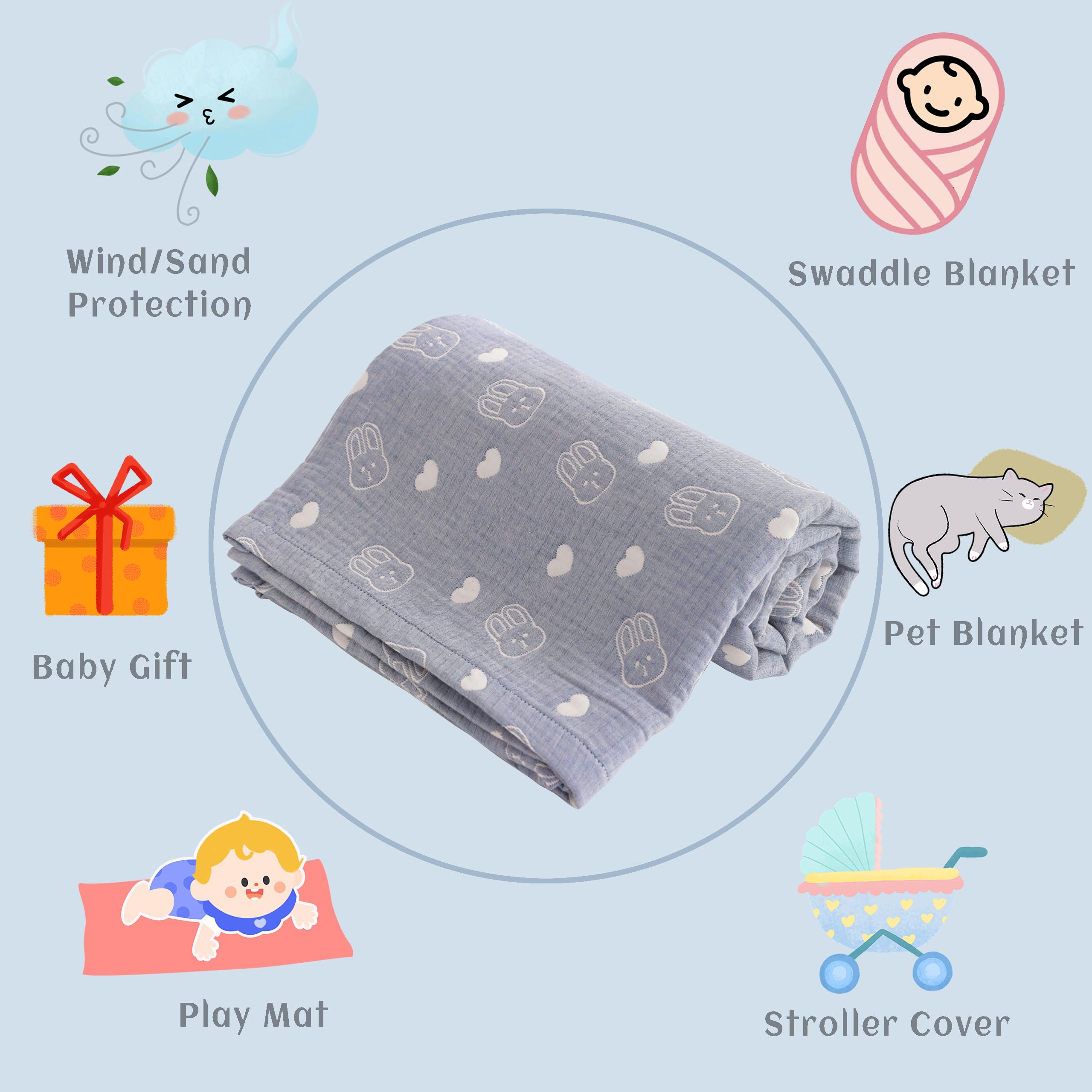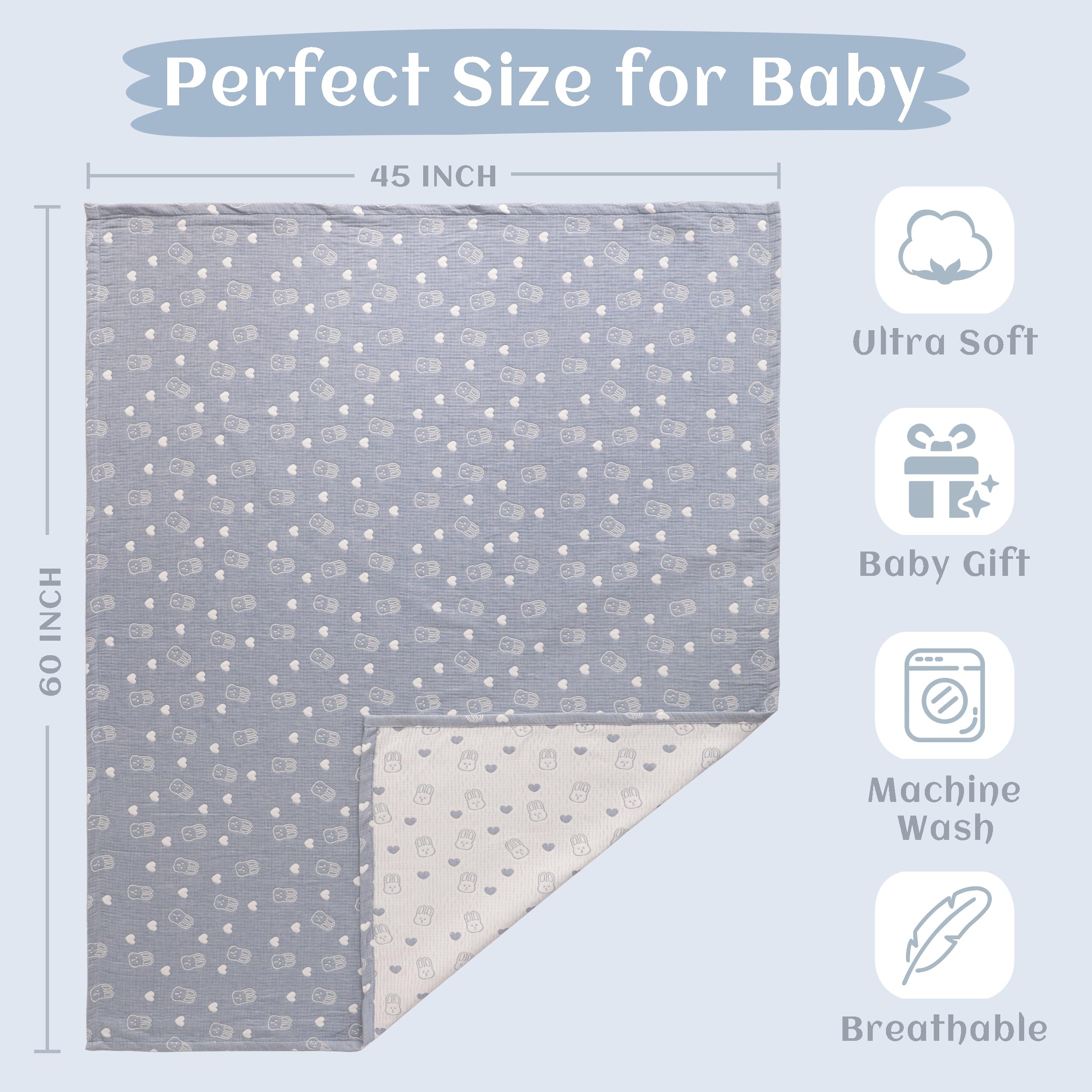 Multiple use: These muslin blankets can be used for tummy time, traveling, cuddling, stroller and car seat use, picnics, and even as a throw blanket.