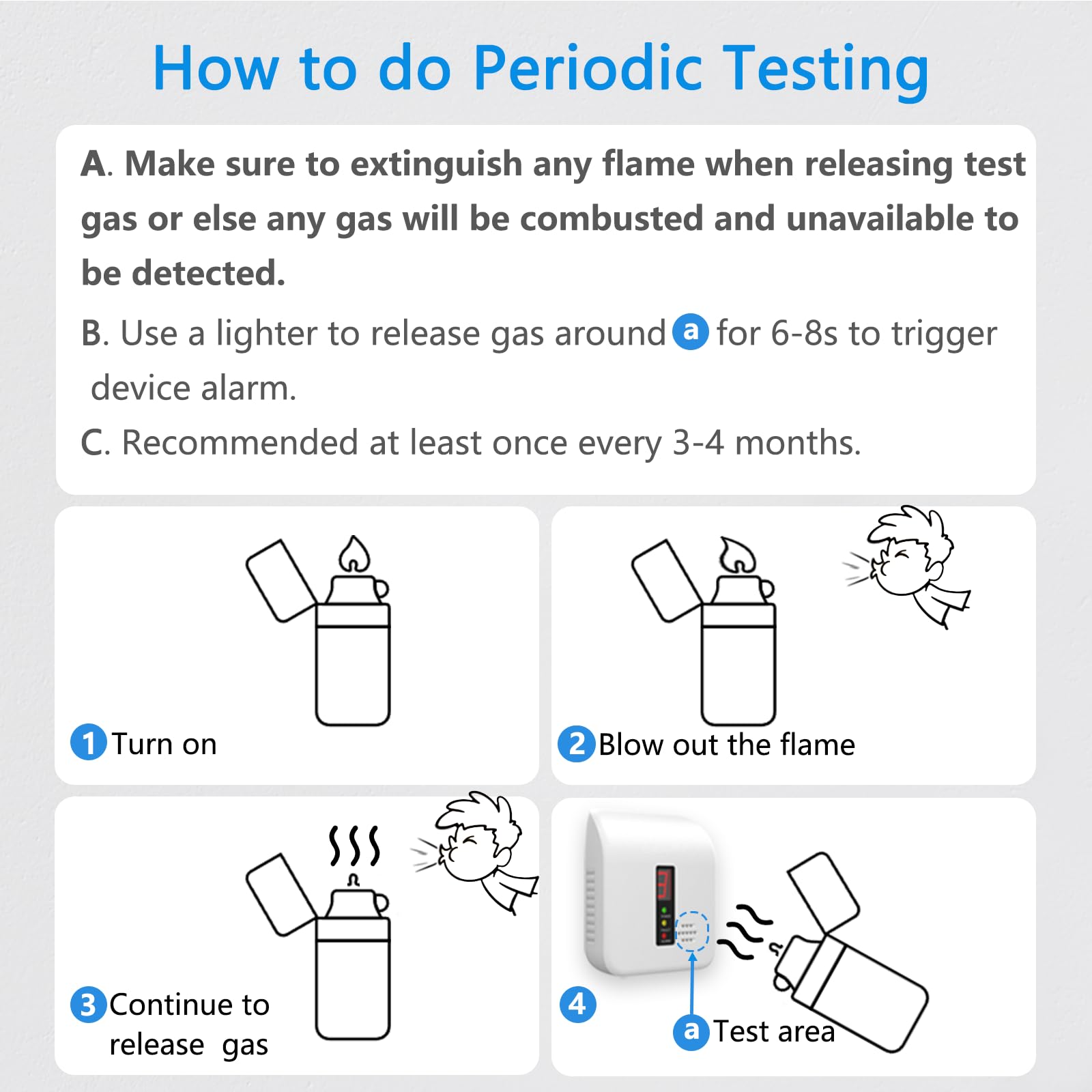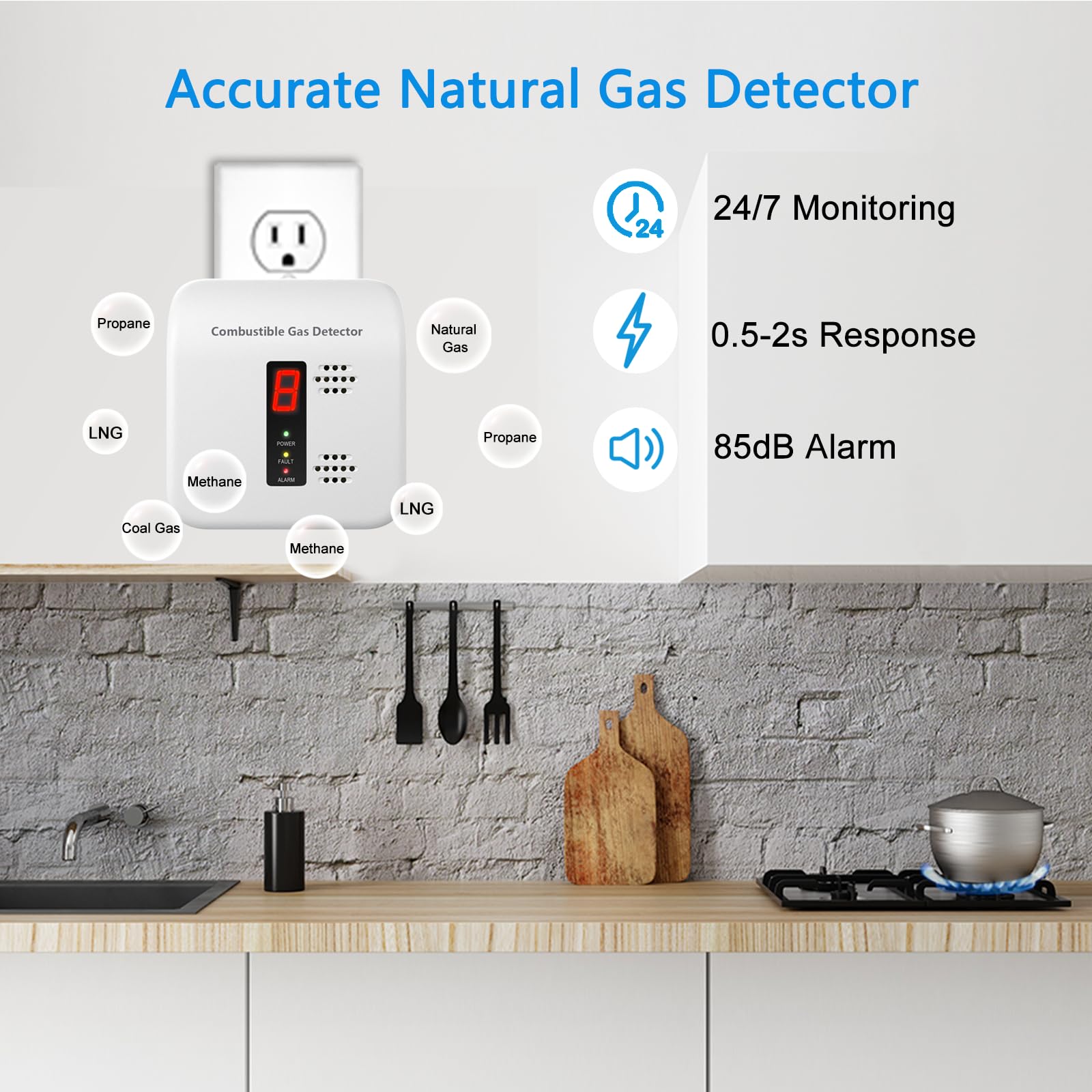 Visual & Audible Alarm: Digital LED display shows the level of natural gas the natural gas alarm is sensing. And emit an 85 decibel warning sound to remind people to stay away from danger