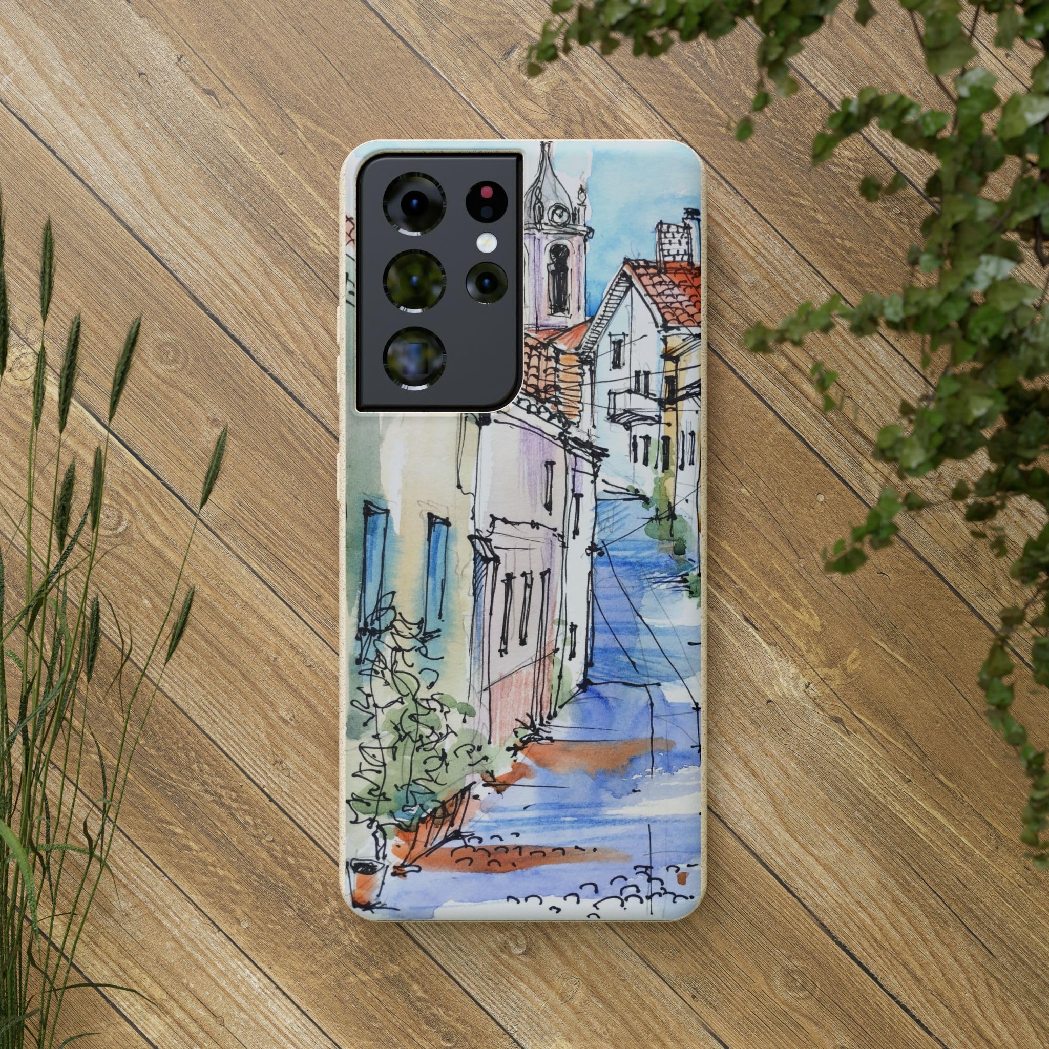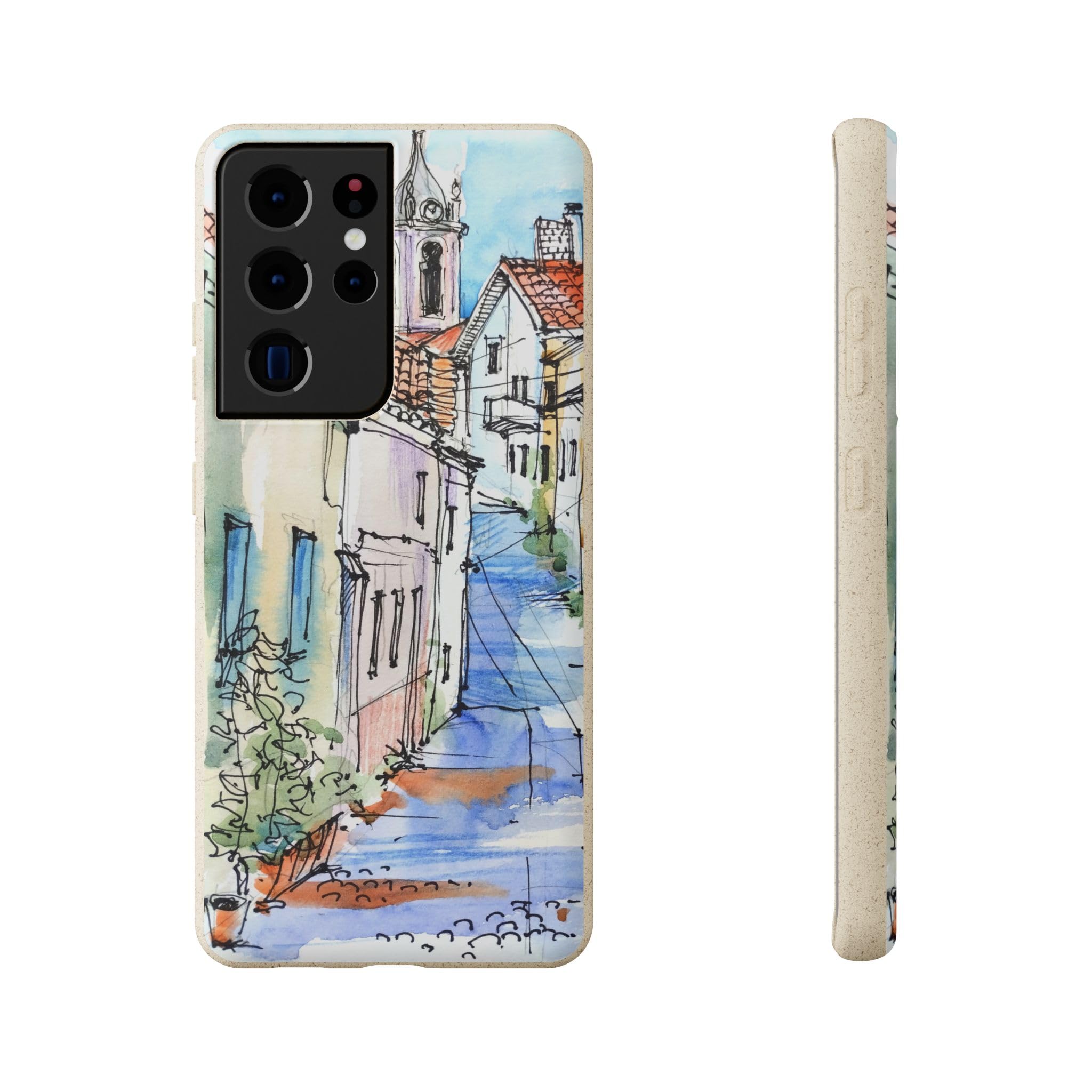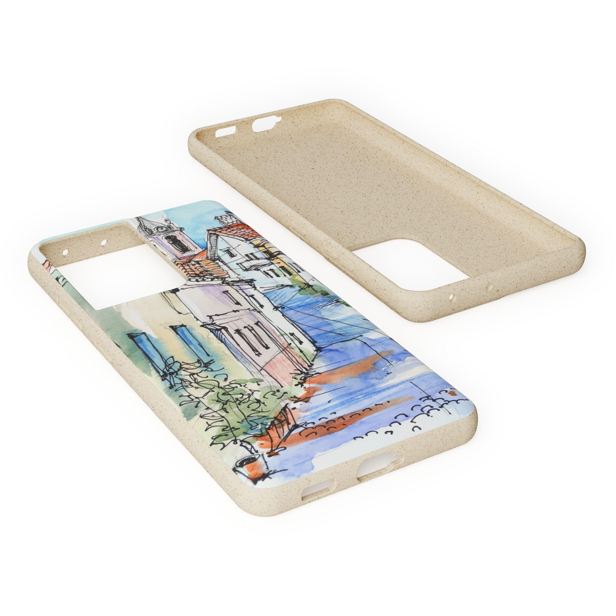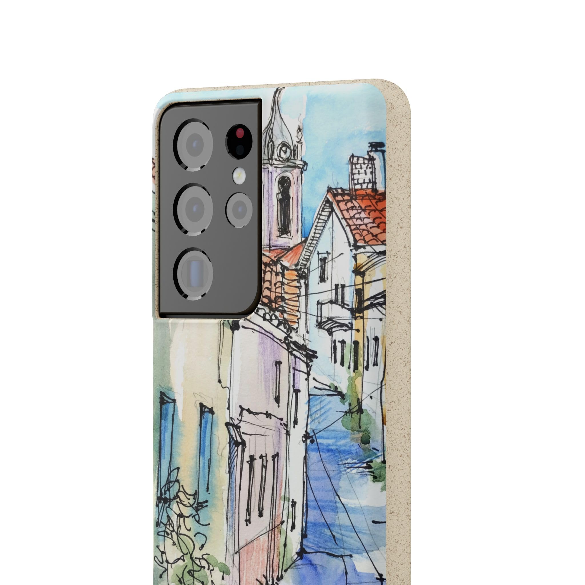 Protect your phone in style while protecting the planet! Embrace nature with our European Town Art Biodegradable Phone Case, featuring a charming illustration of a colorful European street scene. The design showcases quaint cobblestone roads, vibrant historic homes, and a picturesque chapel, all beautifully rendered in watercolor and fine pen detail. Perfect for lovers of travel-inspired art, European architecture, and the warm, nostalgic feel of hand-painted urban landscapes. Crafted from eco-friendly, compostable materials, this sustainable phone case not only protects your device but also supports a greener planet — naturally biodegrading within 160 days of disposal. It’s lightweight, durable, and fully supports wireless charging for effortless everyday use. Available for multiple phone models. Order yours today and carry the beauty of nature wherever you go! Details: .: Materials: PLA and PBAT polymers, bamboo fibre .: Matte finish .: Wireless charging compatible .: Precise cut outs for connectivity .: Might have a natural scent