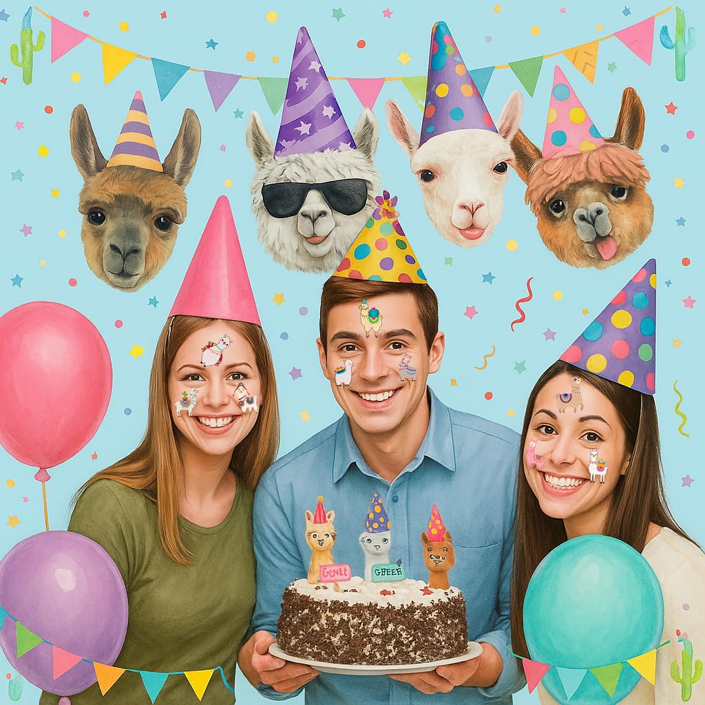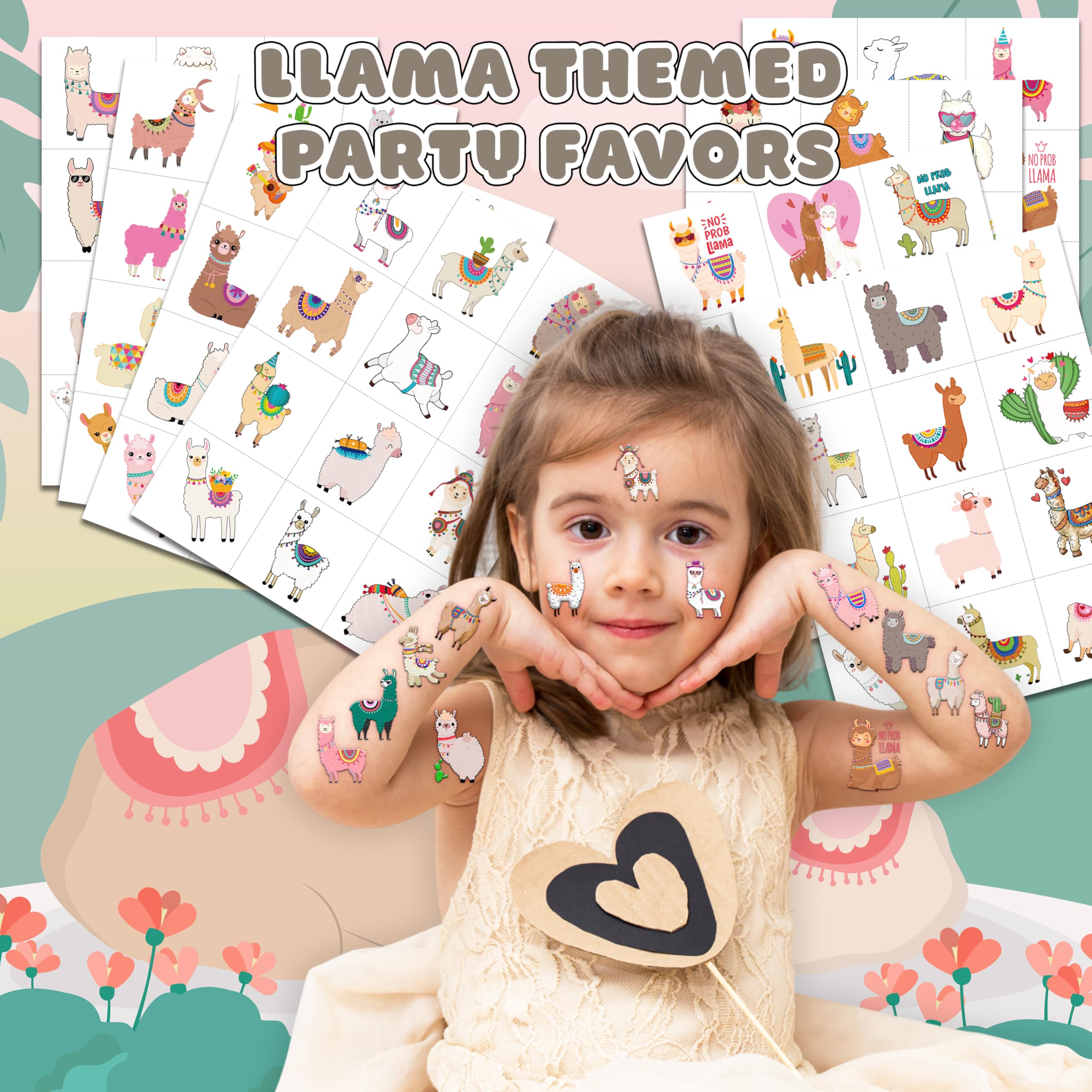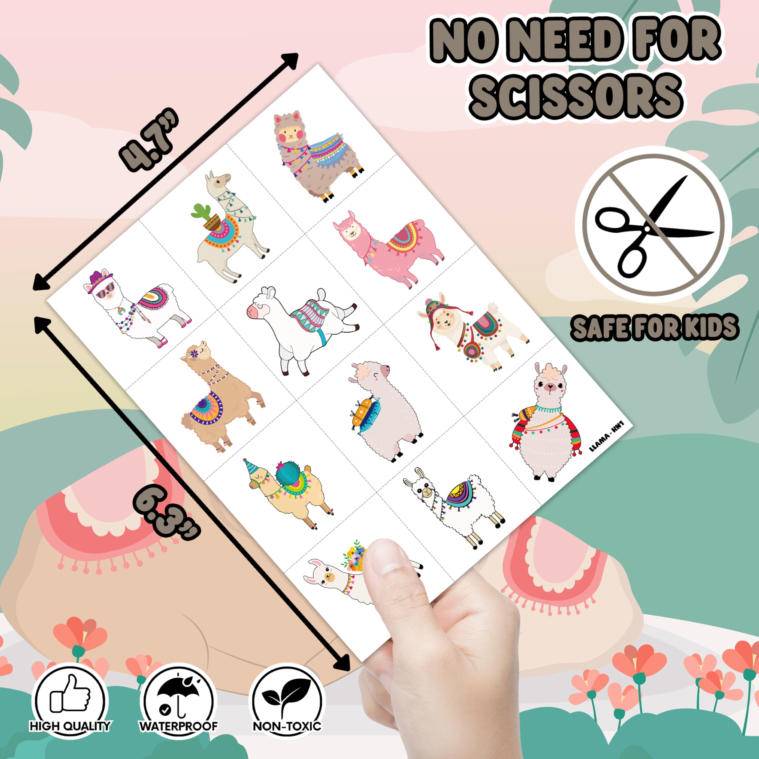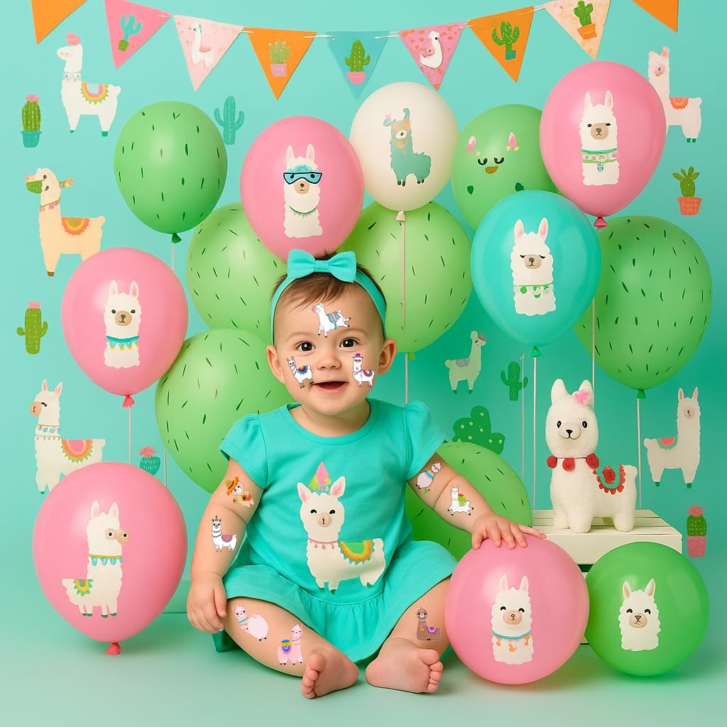 Pattern rich: Llama Cactus Cute Bolivian Peru Alpaca Temporary Tattoos for Kids include 10 Sheets 96 PCS, the size of each sheet is 6.1 * 3.1 inches. Having a variety of characteristics, shapes and vibrant colors can stimulate your children's imaginations and bring a creative atmosphere to your Llama Cactus Party. Widely used: These Llama Cactus Cute Bolivian Peru Alpaca Temporary Tattoos pieces are suitable for many occasions such as birthday parties, baby showers, birthday gifts, party decorations, gatherings and other special celebrations. It also can be applied on laptop, cup, luggage, phone case and so on which could make you look more impressive. How to use: Itβs very simple and easy to use. Cut your favorite tattoo from the sheet and stick it on your hands, arms, face or wherever you like then dip a small amount of water until itβs soaked, hold it in about 15 seconds and remove the white paper, itβs done. The tattoos usually fall off in a few days. Simply removed by baby oil or soap to wipe it back and forth. Safety Material: Our products mainly use environmental protection ink, waterproof and environmentally friendly glue which is reliable and friendly to your skin. Note: We all recommend using a small part to use the test first, and if there is no problem, it can be used normally. Not recommended for kids under 3 years old, people with a history of sensitive skin, if symptoms appear, stop using immediately.