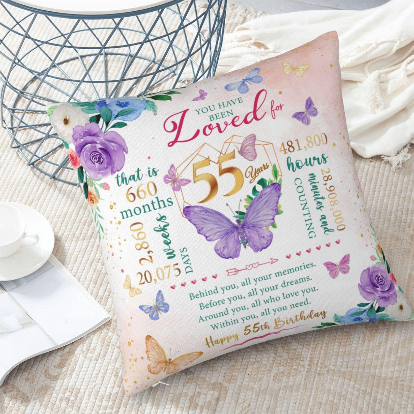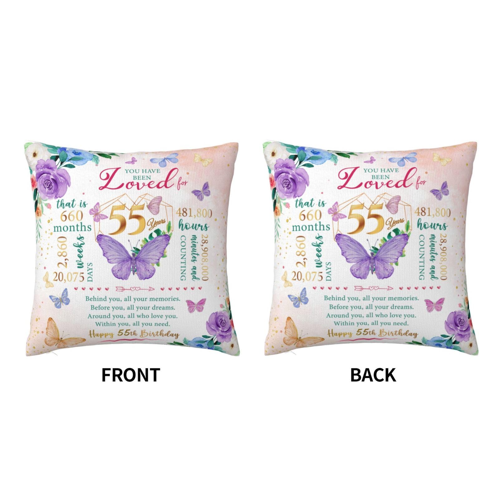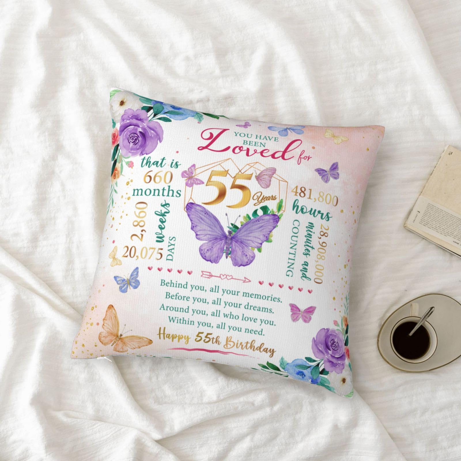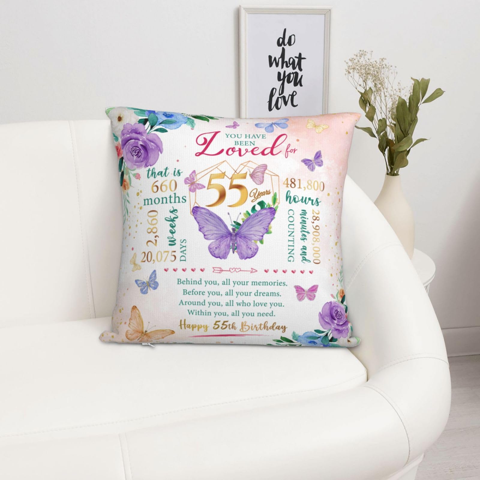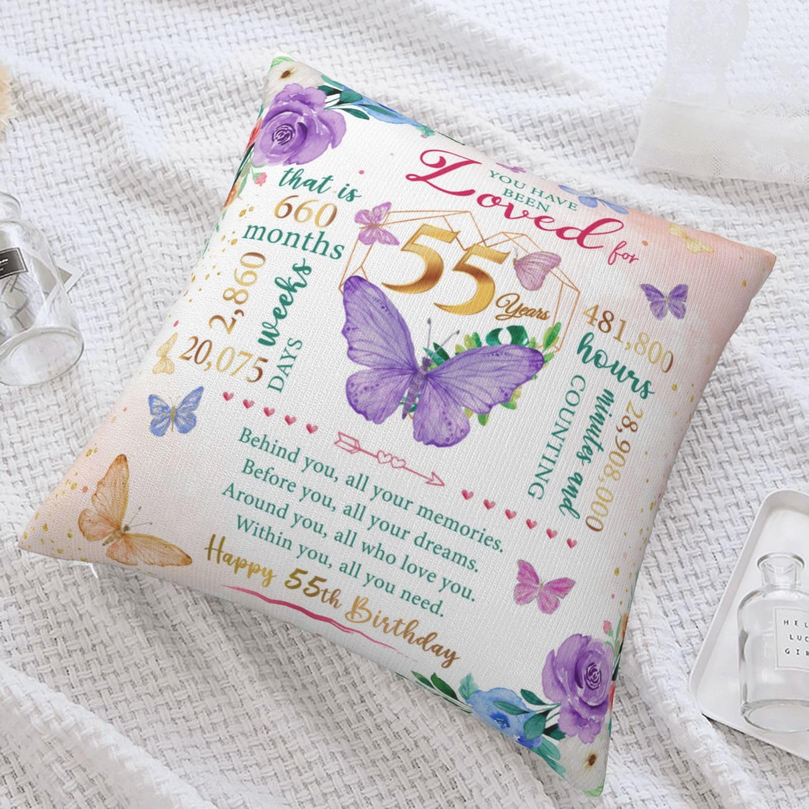 Happy 55th birthday! When that day comes, it means that exactly 55 years, 660 months, 2,860 weeks, 20,075 days, and 481,800 hours have passed since we landed on this earth. Birthday gifts carry our love and enthusiasm for the birthday person, everyone needs to be remembered and blessed, love her, you must speak out! This is a 55th birthday gift, 55th birthday decoration & gift for women, birthday gift 55 year old woman, 55 year old birthday gift women, 1970 birthday gift for women。 This pillow case is suitable for dear her who is about to celebrate her 55 year old birthday, and can be given to a variety of identities and professions, such as wives, mothers, friends, teachers, colleagues, etc. Applicable scenarios include bedroom, study, living room, office, car, etc. This pillow case can also play the role of embellishing space and beautifying the scene. Is the ideal interior decoration, can be used in the bedroom, living room, study, balcony and other scenes. Similarly, the function can also extend to the outdoors, whether it is in outdoor venues such as picnics, camping, or concerts. Note: The pillow case is made of polyester fabric, can be directly machine washed;The pillowcase does not include the insert .