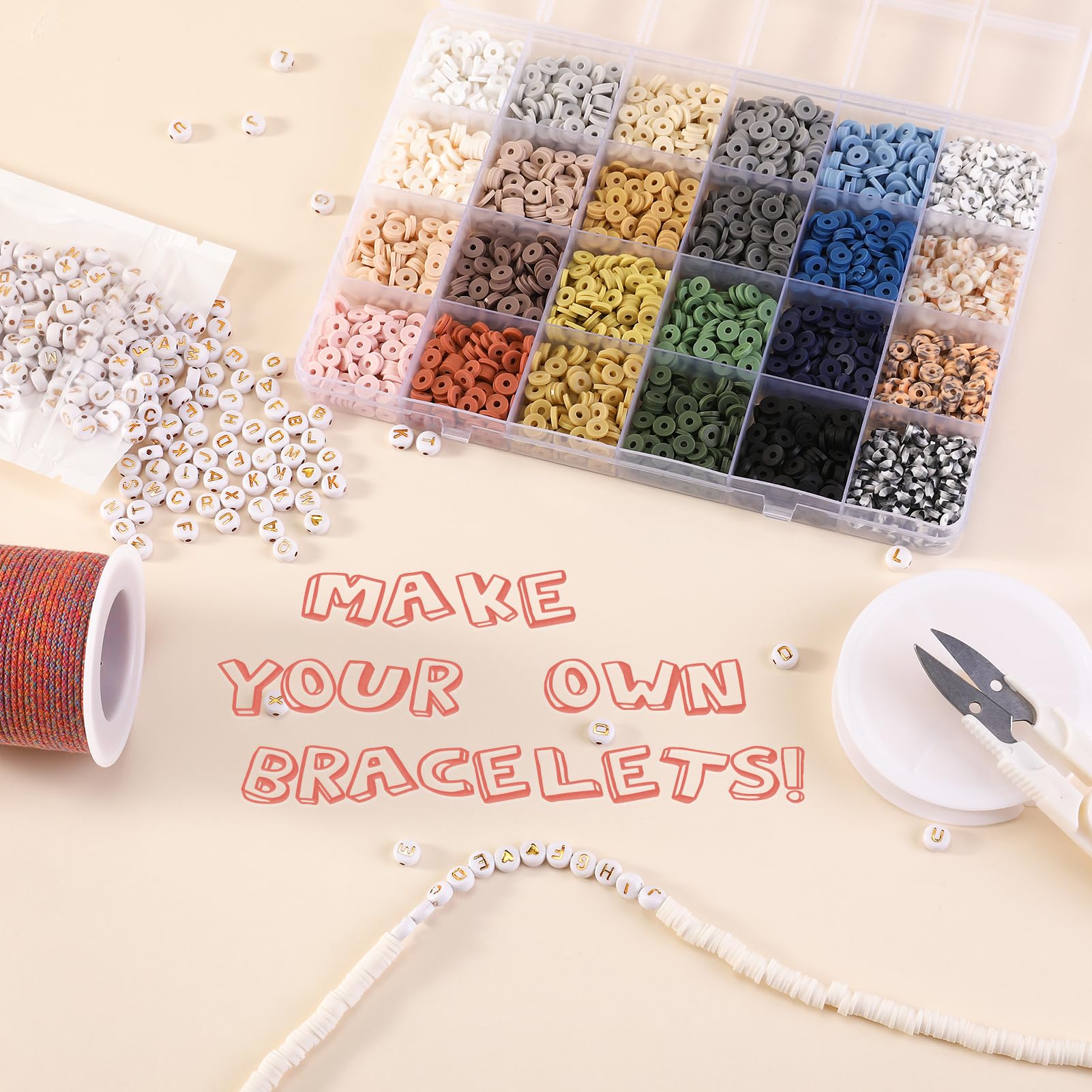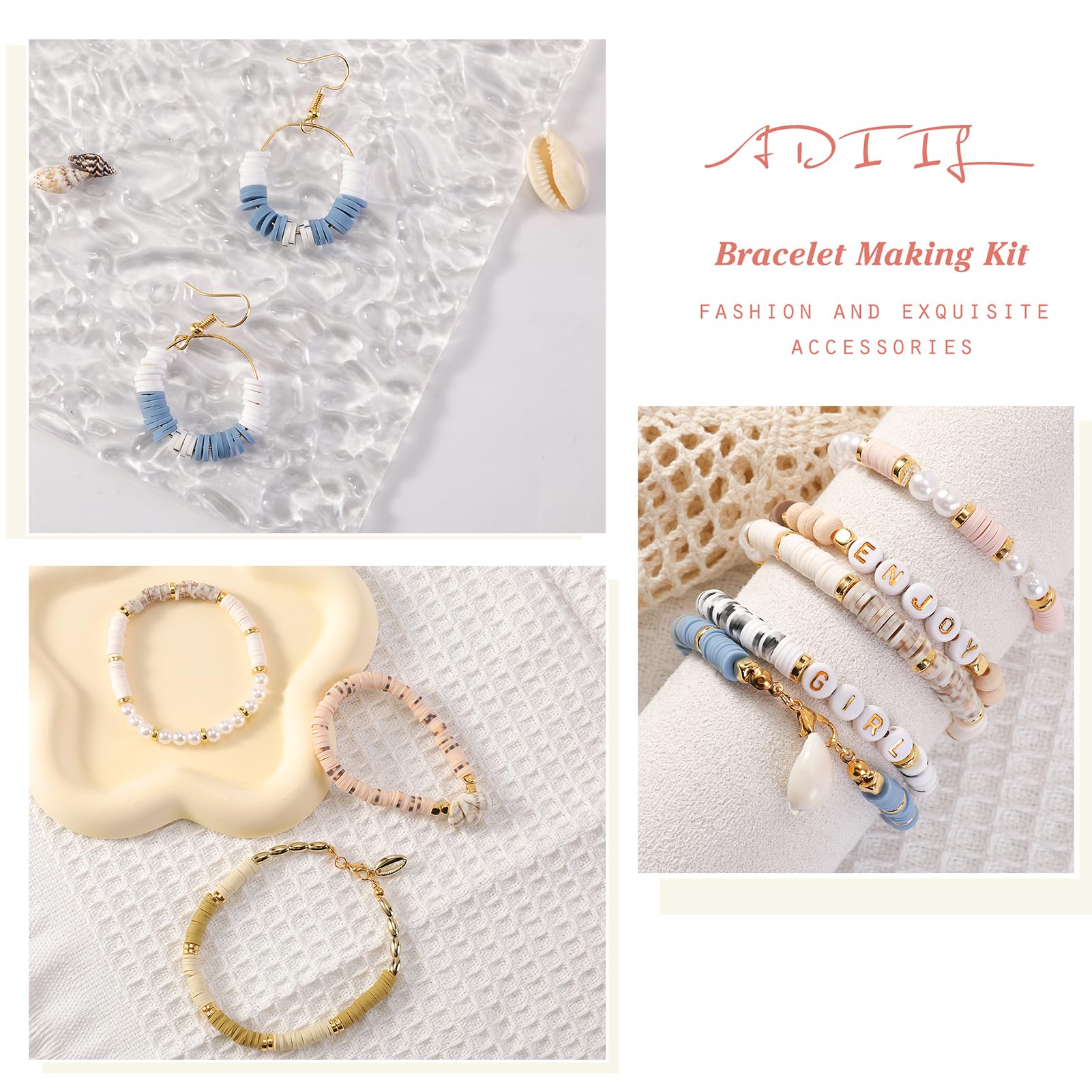 Great Value Bead Bracelet Making Kit: This bracelet making kit includes 6000pcs heishi beads in 24 neutral colors, 450pcs Alphabet beads full sets of A to Z, 2 rolls of elastic string, 1 scissors, 50 white pearl beads, 50 wooden beads, 80 gold flat beads, 20 conch shells, 10 clasps, 40 heart beads, 100 rice spacer beads, 10 starfishes, etc. All you need are included