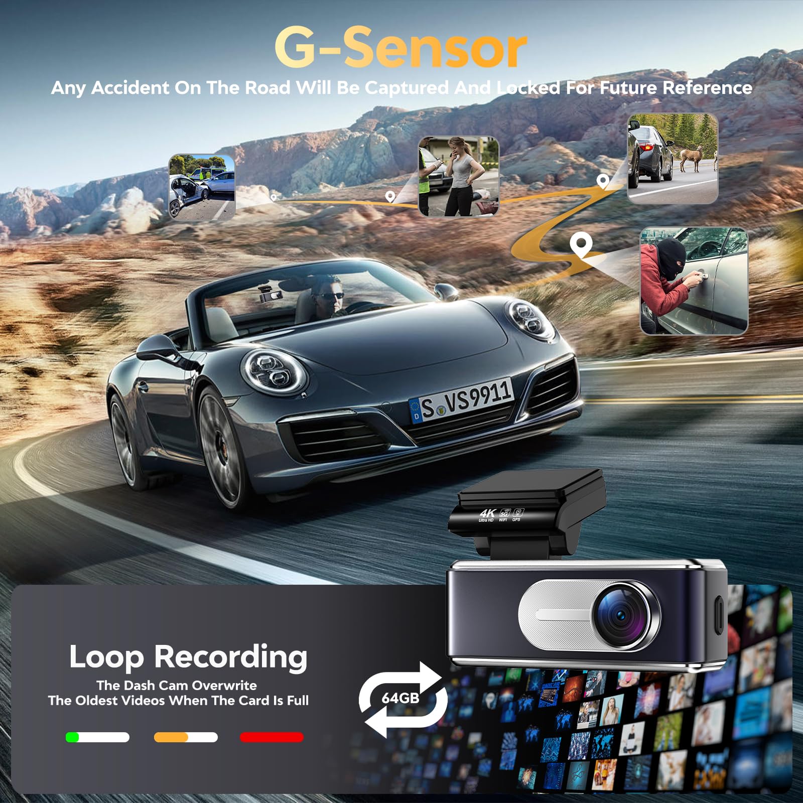 【G-Sensor】Csyibeielec dash camera has a built-in g-sensor to detect sudden movement or impact. When an event is detected on the road, it automatically locks and protects the relevant footage, ensuring it will not be overwritten during loop recording