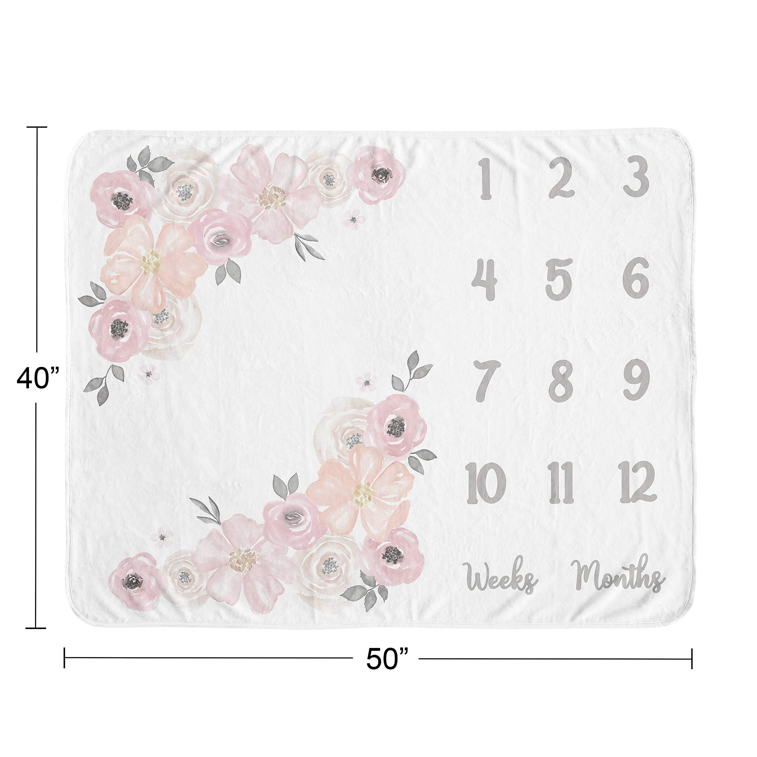 BABY MILESTONE BLANKET INCLUDES: Blanket (40in. x 50in.), Round Marker Week/Month Frame (7in. x 7in.) and Rectangle Marker Week/Month Frame (9.5in. x 5.5in.). Designed in the USA with super soft 100% plush minky fleece fabric. Machine washable, tumble dry low. This vibrant baby milestone monthly blanket would pair perfectly with coordinating bedding sets and match with the Blush Pink and Grey Watercolor Rose Floral Collection accessories to complete your nursery or toddler bedroom themed look.