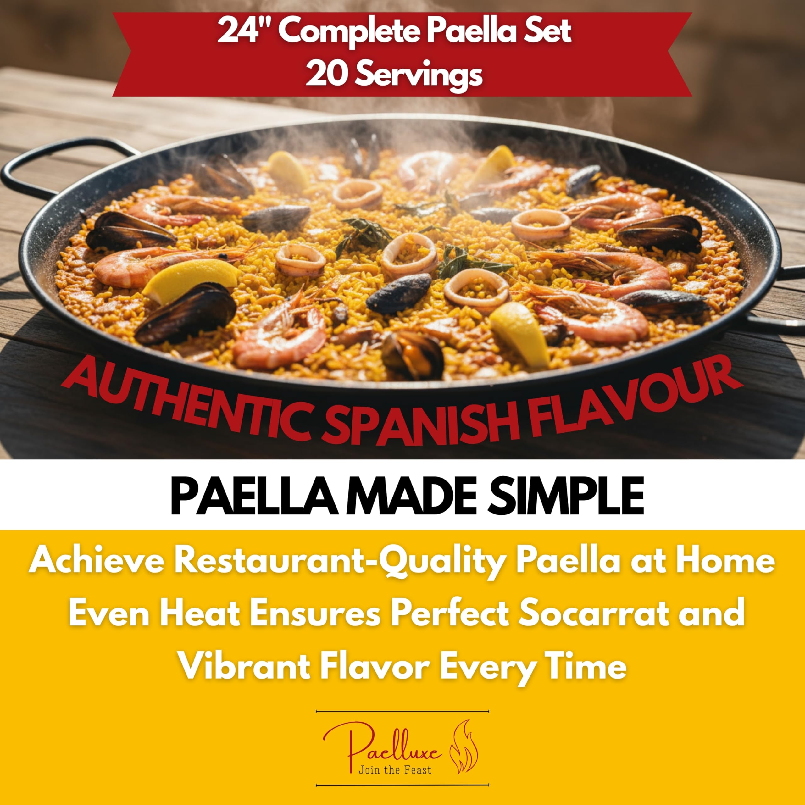 FULLY-EQUIPPED OUTDOOR COOKING PACKAGE: Paelluxe proudly offers a comprehensive Paella Burner and Stand Set, featuring a 24-inch anti-rust enamelled paella pan, a high-performance burner, a durable stand, gas hose with regulator, weather-resistant outdoor cover, and a wind-resistant windshield. Ready to use straight out of the box, no extra accessories required. (Propane Gas Tank Not Included)