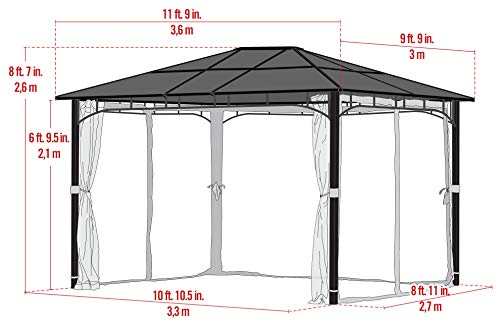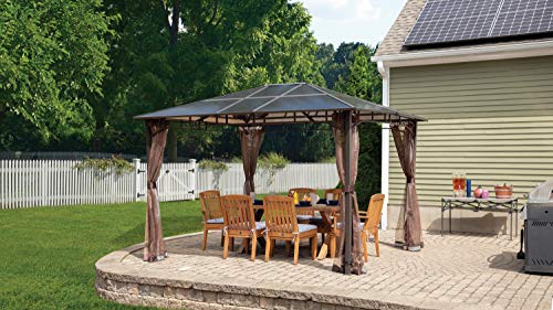 A great alternative to traditional gazebos, the freestanding Sycamore Gazebo from ShelterLogic is a versatile solution for virtually any deck or backyard. The shade structure is made of durable and tough premium powder-coated steel that resists chipping, peeling, rust and corrosion. For added durability and security, the strong steel frame boasts 2.5" x 2.5" square tube legs and .9" square steel truss supports, which help provide a solid and sturdy gazebo frame. The sun shelter includes a tough polycarbonate hardtop roof that protects against harmful UVA and UVB rays to help keep you and your family protected and shaded. The included mosquito nets are CPAI-84 fire-rated and certified and provide natural lighting to your enclosed patio while protecting you from pesky outdoor bugs. The mosquito netting zips together to convert your gazebo into a screenhouse instantly, or use the included ties to convert them to attractive valances. It also creates an intimate and luxurious space that shelters you and your loved ones from the sometimes harsh and unpredictable elements. Enjoy outdoor entertaining in your sunroom while staying cool and dry. Keep your outdoor furniture, grill, and other outdoor items stored and dry when the weather gets rough. The Sycamore gazebo provides 120 sq. ft. of outdoor entertaining space. This freestanding shade structure will last you for years, adding an elegant outdoor living space and a pleasing aesthetic to backyards, decks, patios, gardens, and much more. Assembly is required and 3 people are recommended for assembly. The ShelterLogic Sycamore Outdoor Gazebo exterior measures 106.3" W x 145.67" D x 102.36" H. The gazebo kit includes a 1 year limited warranty. Purchase includes: Frame, Polycarbonate Top, Mosquito Netting, Temporary Anchors