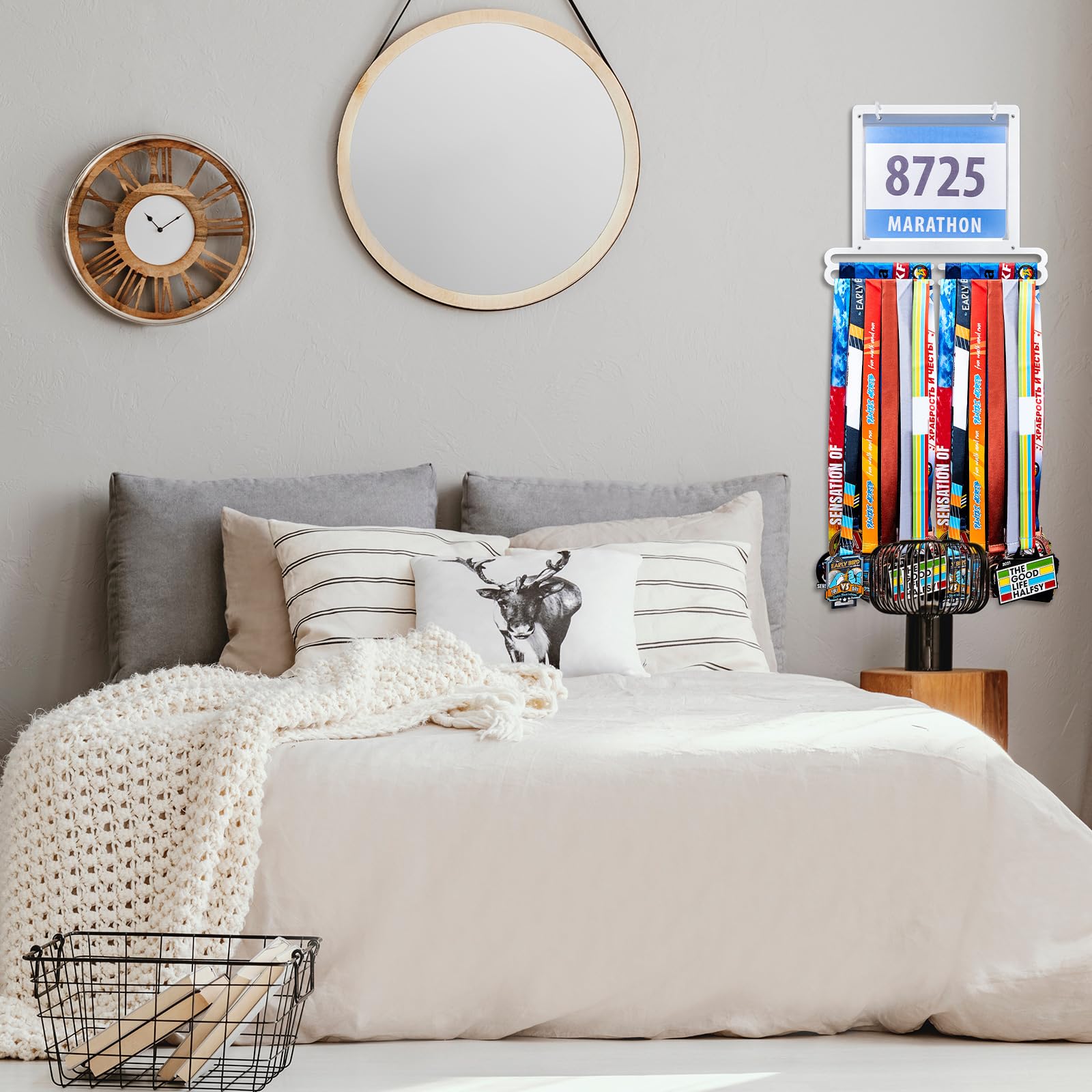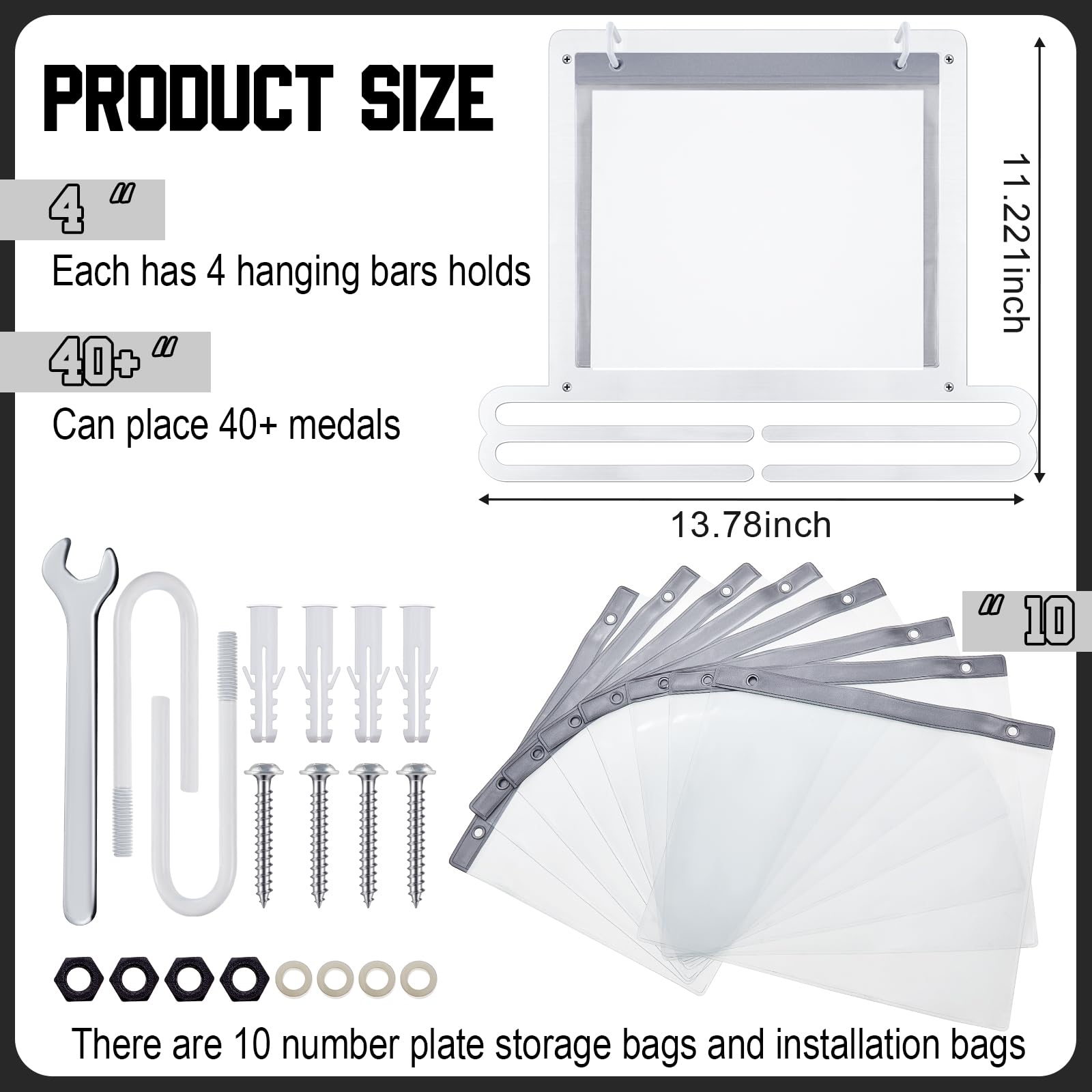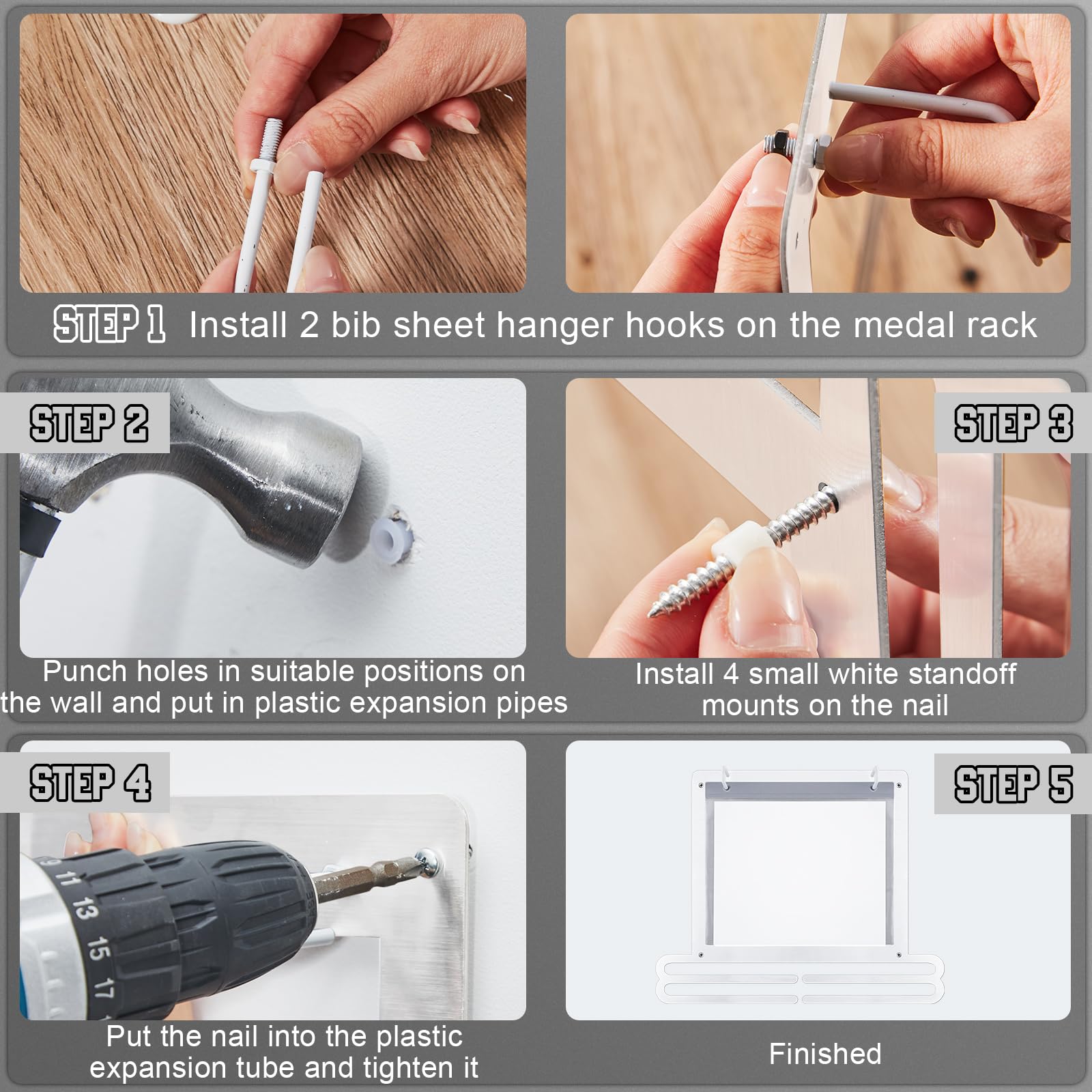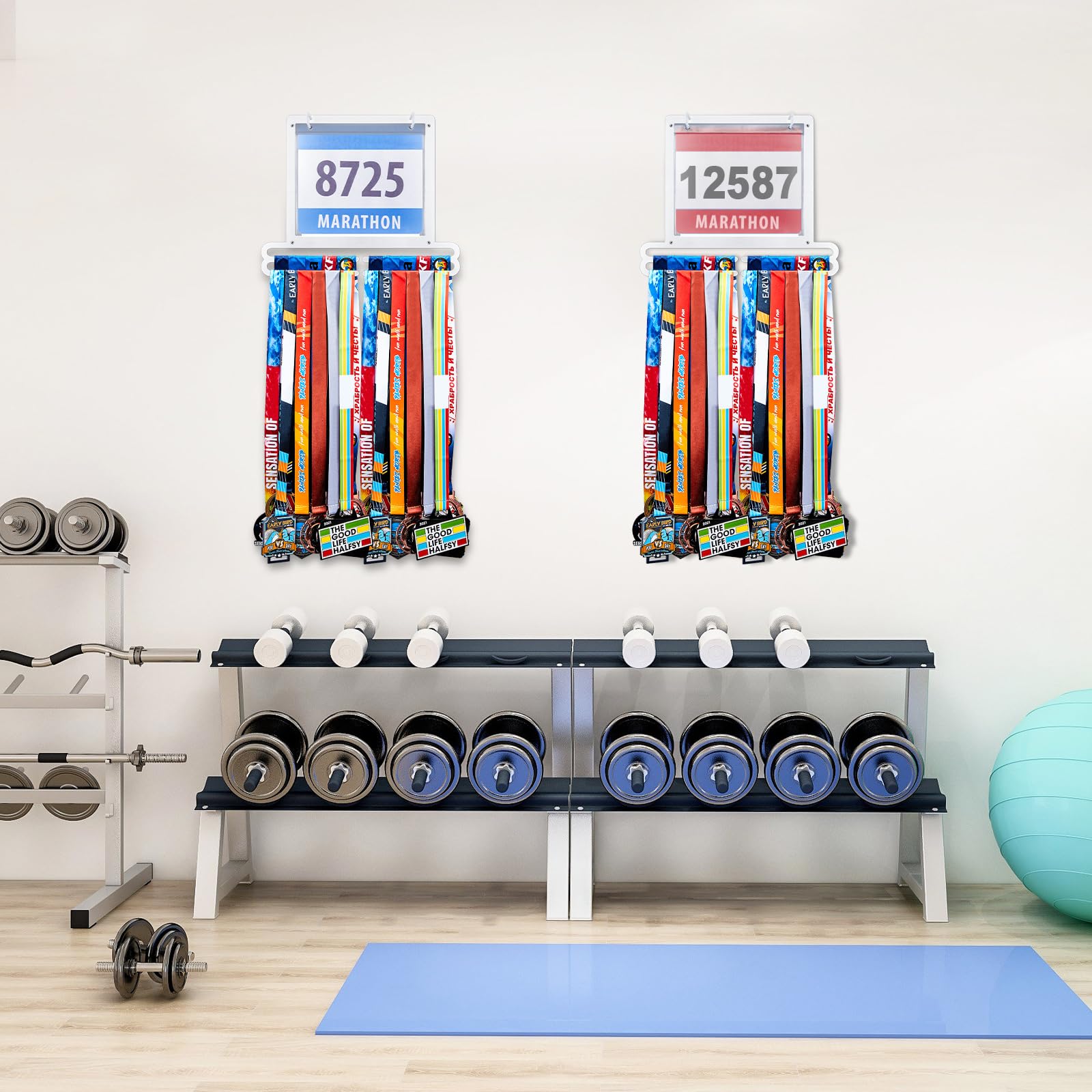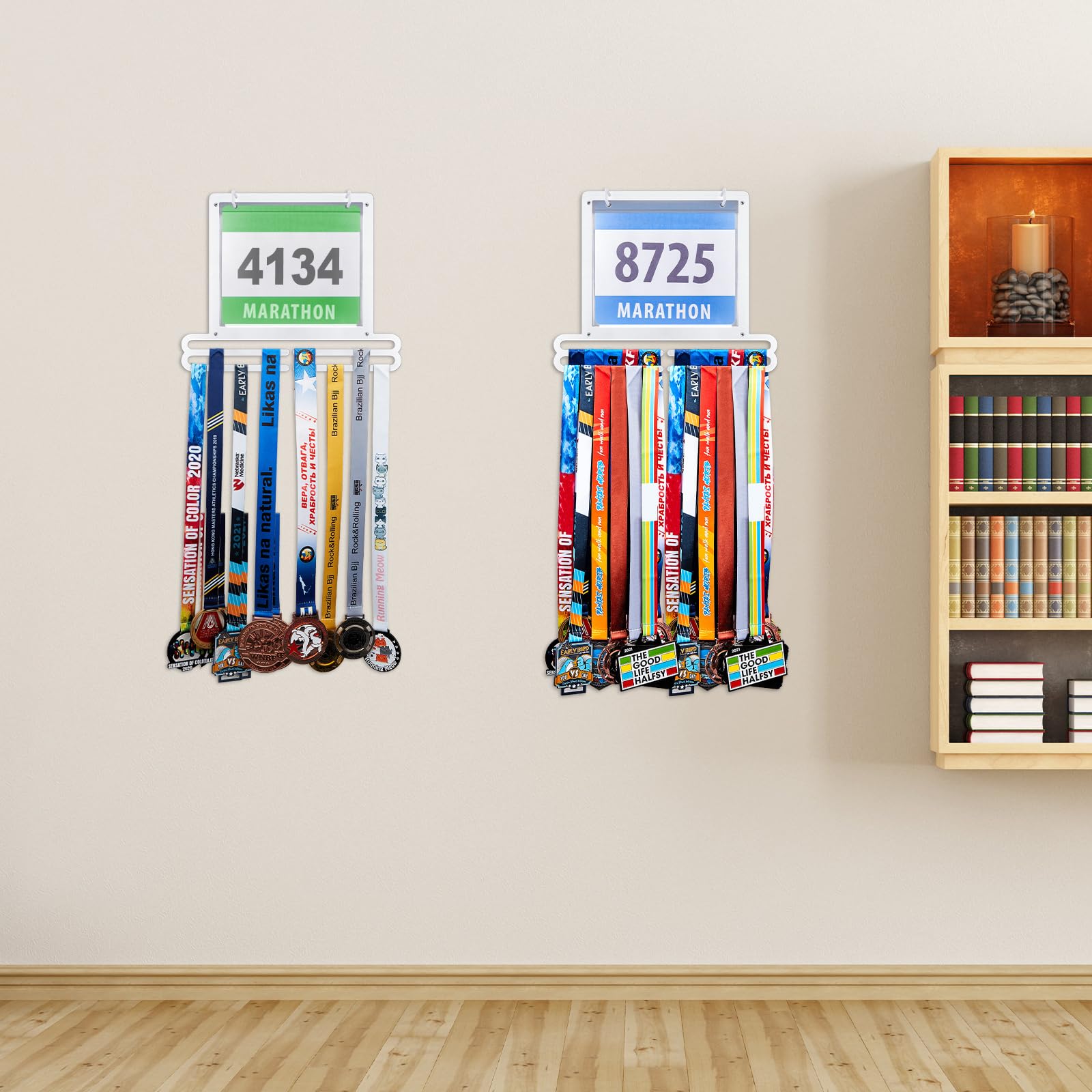 Convenient to install: the race medal display rack is designed for wall mounting to maximize space and keep your medals and bibs organized, the package comes with the appropriate mounting kit, you simply attach the rack and screws to the wall, then place the medals in the plastic bibs and hang them on the hooks, slide your medals onto the bars