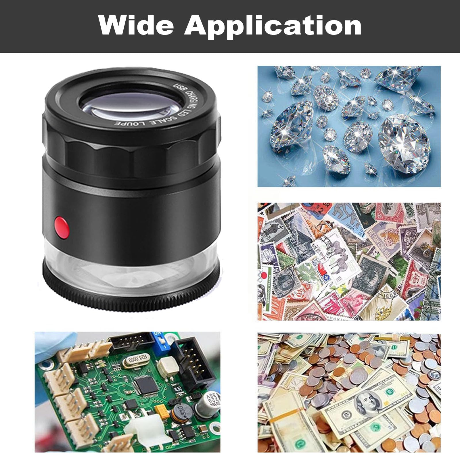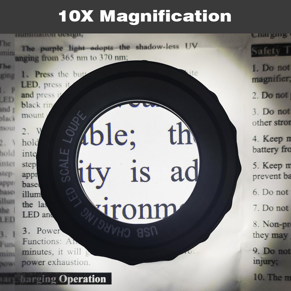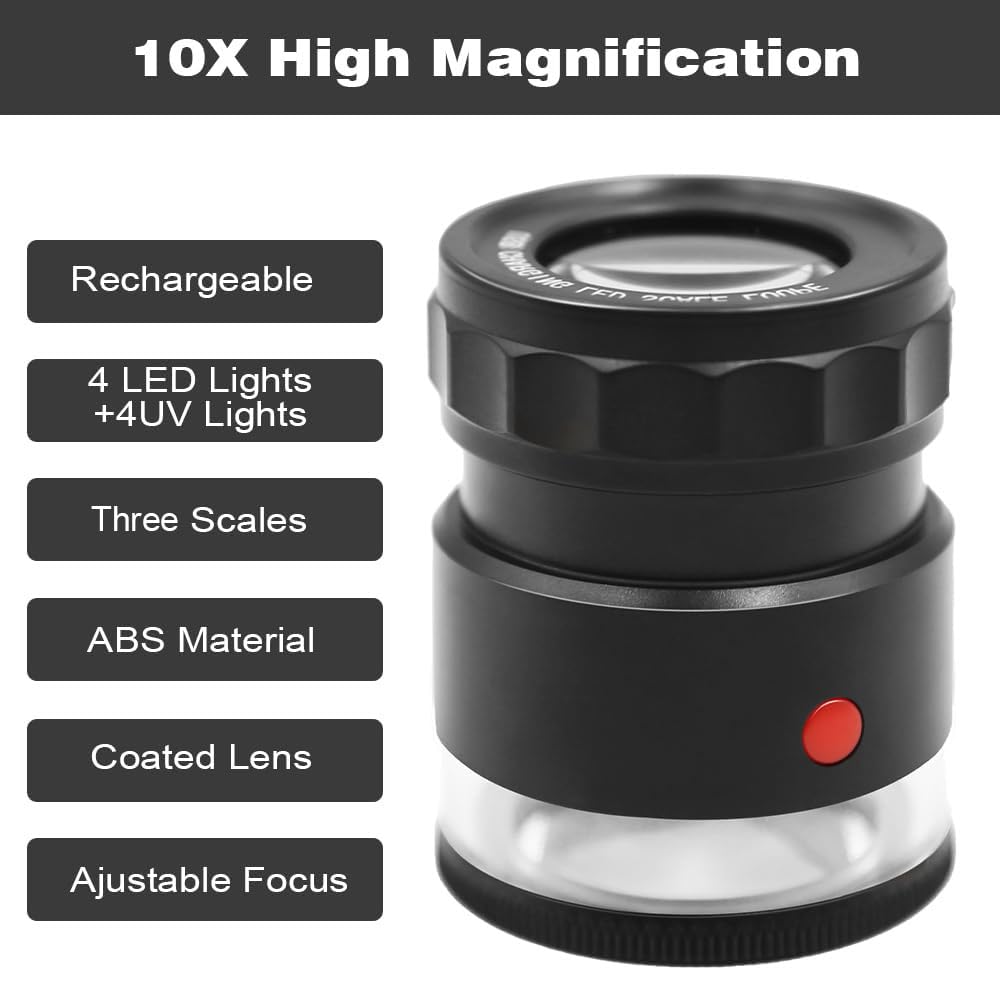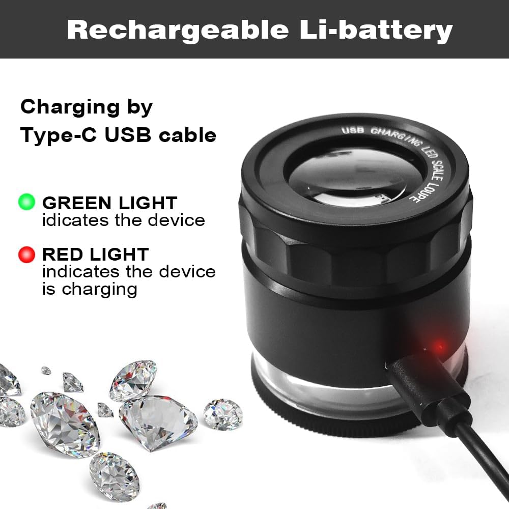【10X Rechargeable Jewelers Loupe 】This rechargeable 10x loupe means you'll never need to change the batteries again! This jeweller's loupe has a built-in lithium battery that charges via a Type-C USB cable, making it more convenient to power. It is great for use in the field and allows you to view the tiny world at any time and in any place.
