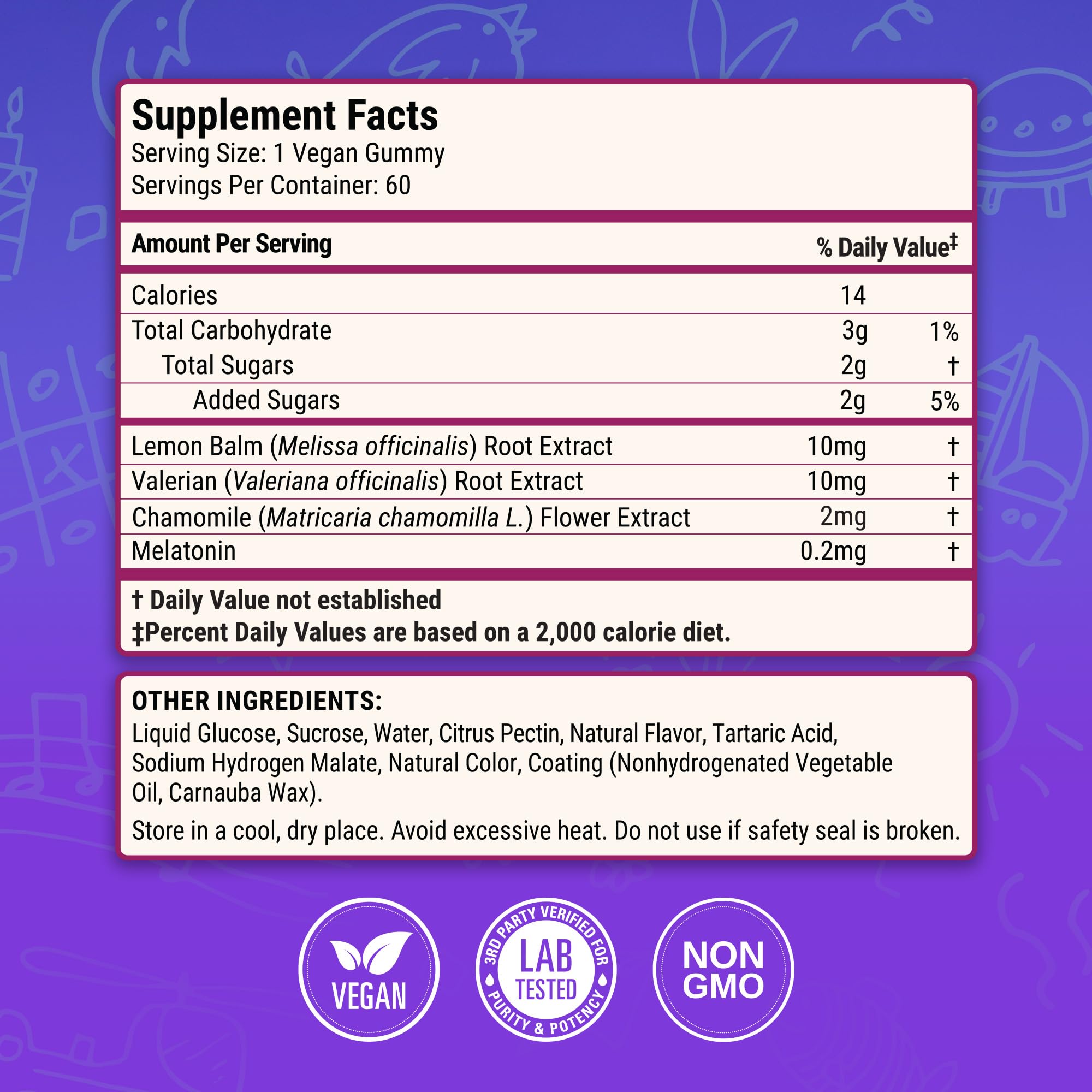 Relaxation and Calming Support: The combination of Valerian Root Extract, Lemon Balm Extract, and Chamomile Flower Extract promotes relaxation and tranquility, allowing kids to unwind and prepare for a peaceful night's sleep.
