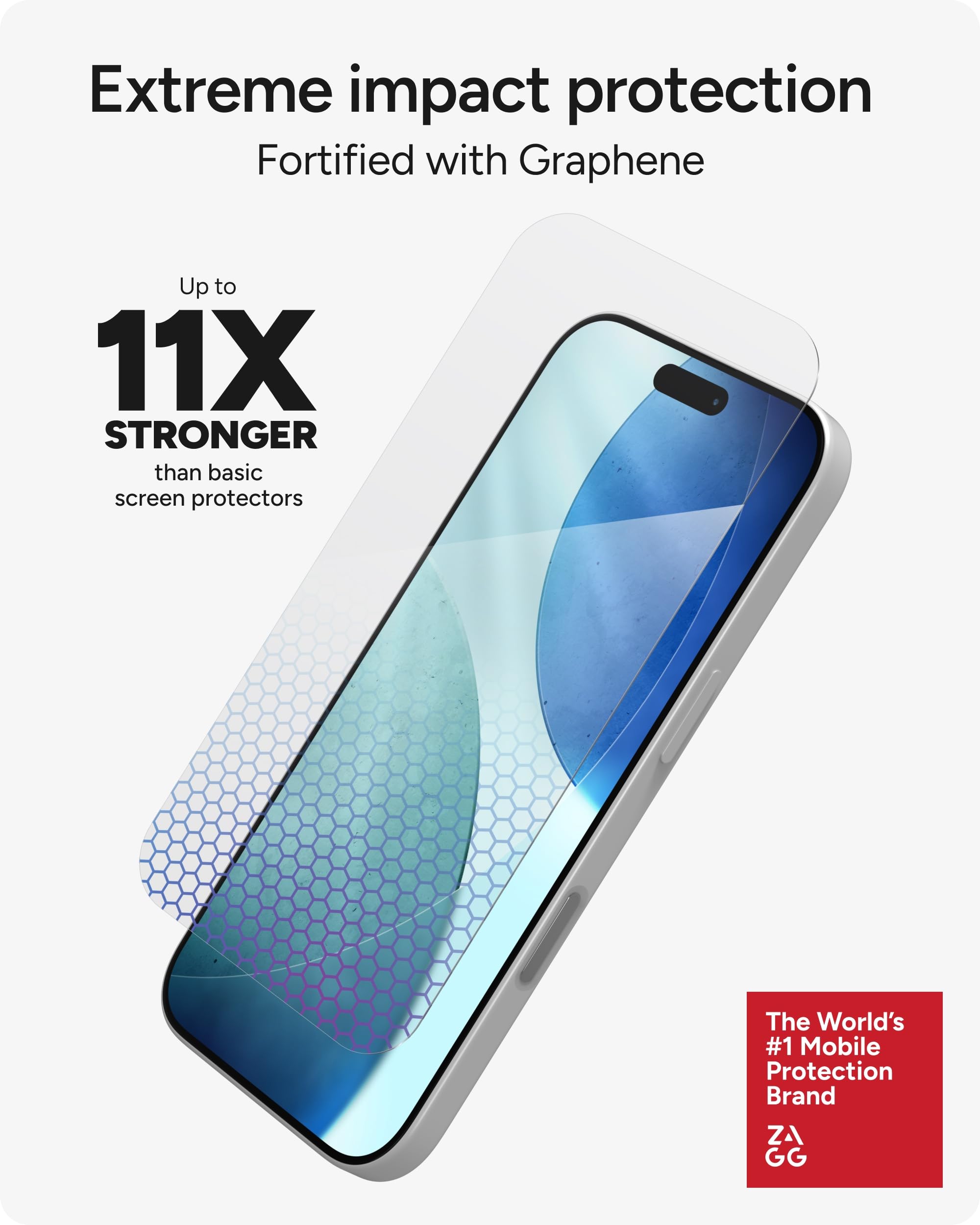 11X STRONGER, GRAPHENE FORTIFIED SCREEN PROTECTION - ZAGG Glass Elite XTR5 iPhone 17 screen protector is reinforced with Graphene, tested to be 11X stronger than basic iPhone tempered glass, and offers advanced scratch and impact protection