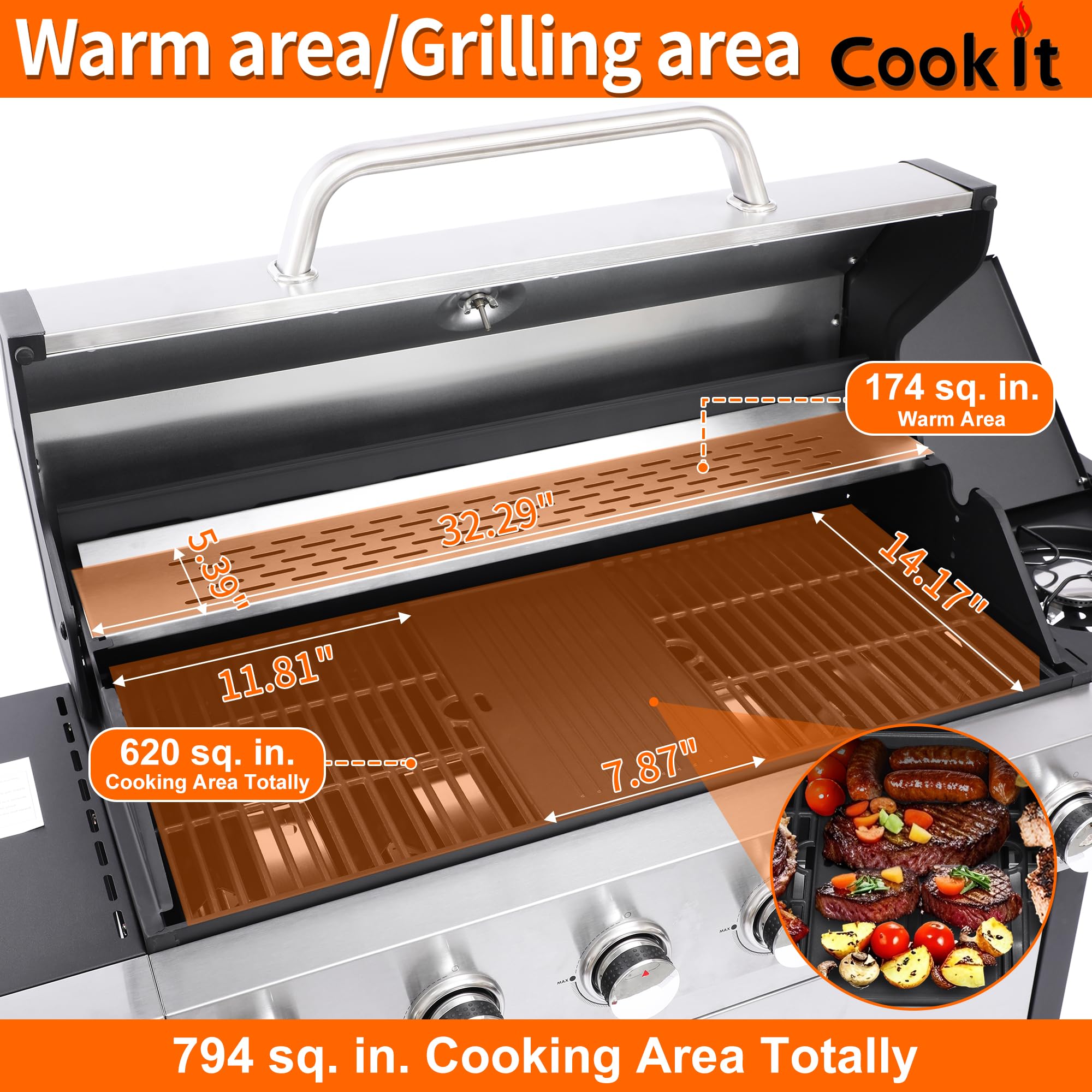 69,000 BTU Smart Cooking Zones - Four 10K BTU main burners with instant-start ignition give you serious firepower, while the 9K BTU sidekick burner handles your sauces and sides. The porcelain flame tamers are like having a personal heat conductor - no more hot spots, just perfectly cooked meals every time.