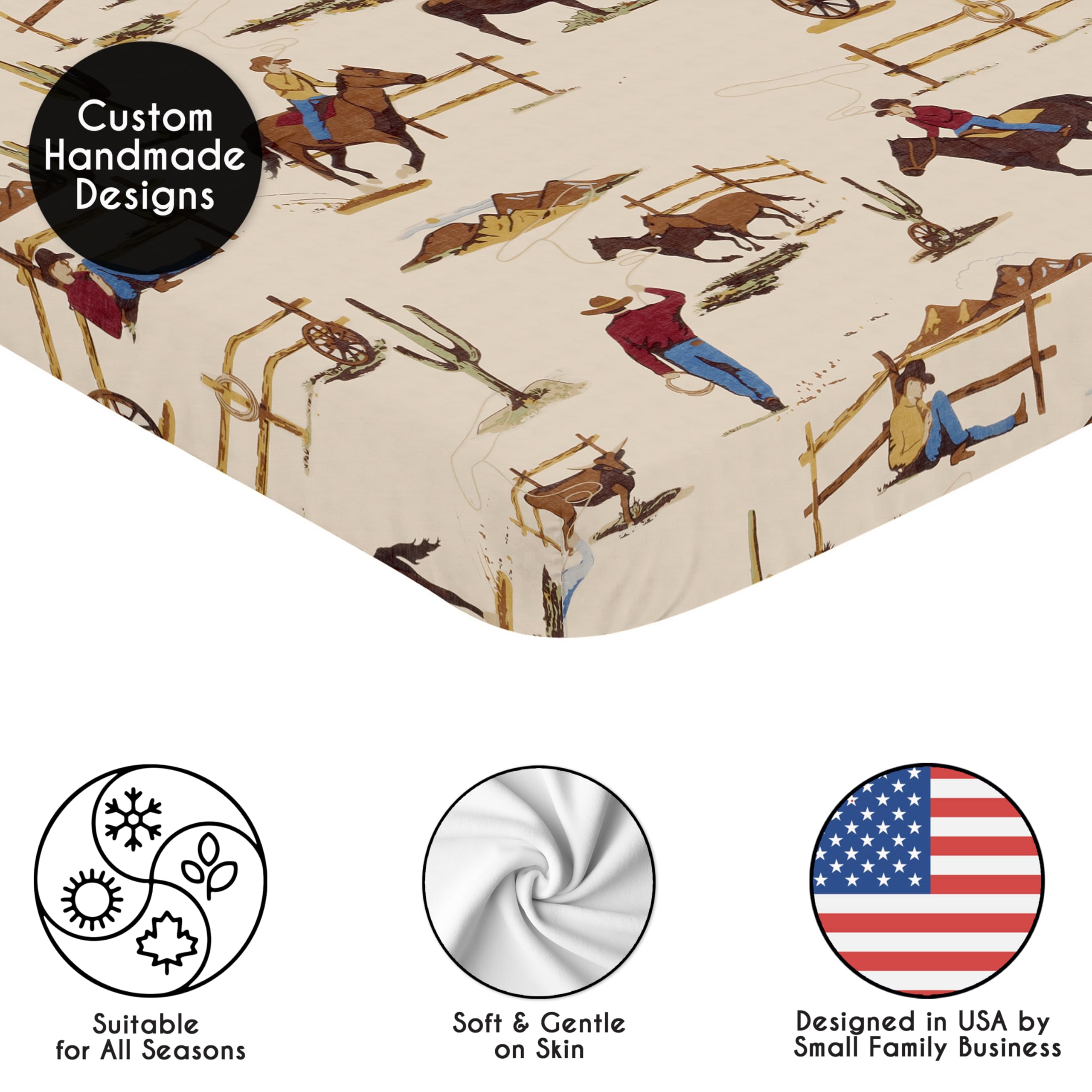 SNUG FIT: Includes (1) Mini Crib Mattress Sheet 24in. x 38in. x 5in. Our newborn mini crib sheets fit snugly, with premium elastic sewn around the entire bottom edge for a secure fit on most smaller size cribs, play yards, & portable cribs to reduce shifting & bunching. This brushed microfiber pack and play sheet features an exclusive design of beige, brown & neutral taupe illustrations of wild western cowboys animals & horses print & is gentle on delicate skin. WILL NOT FIT STANDARD SIZE CRIBS.