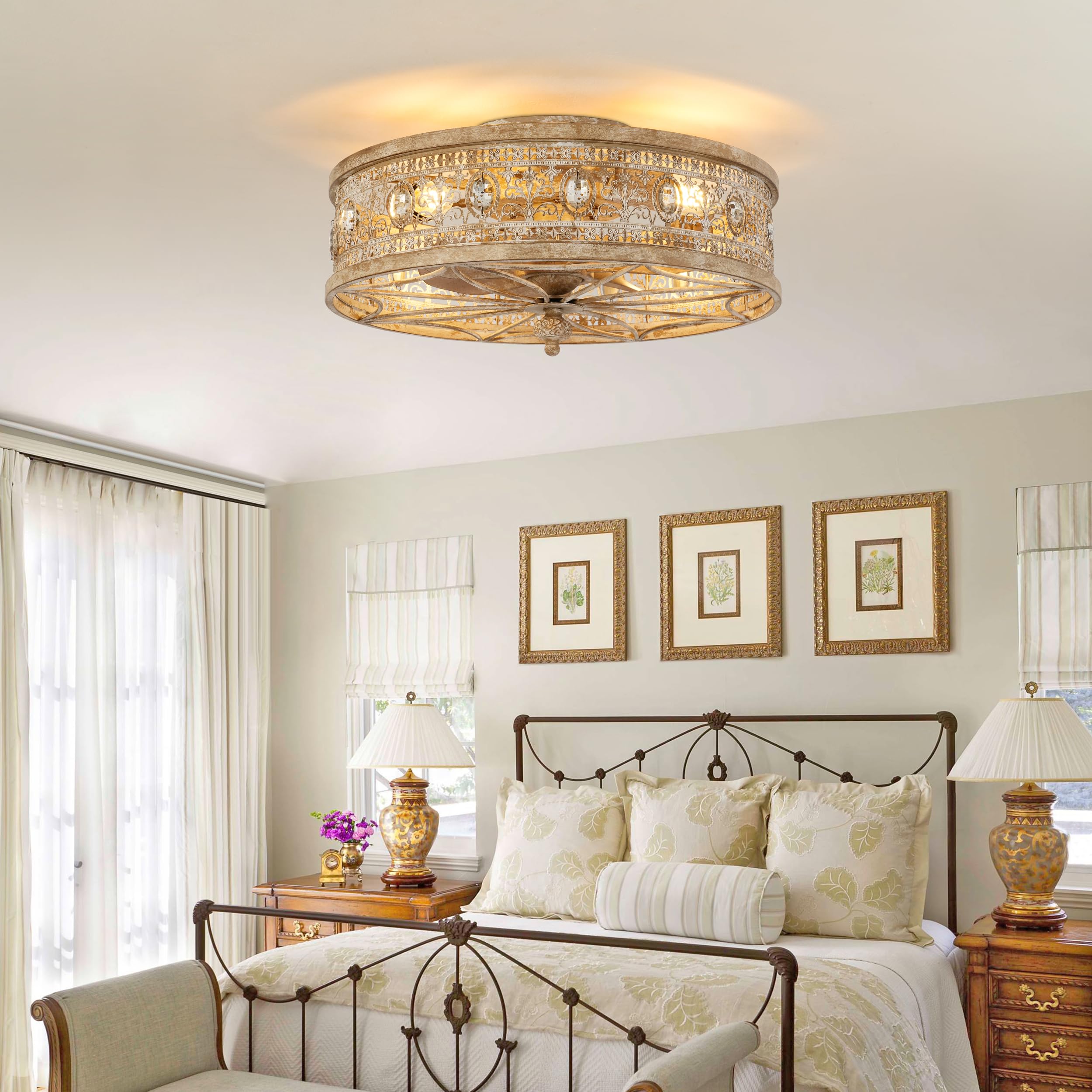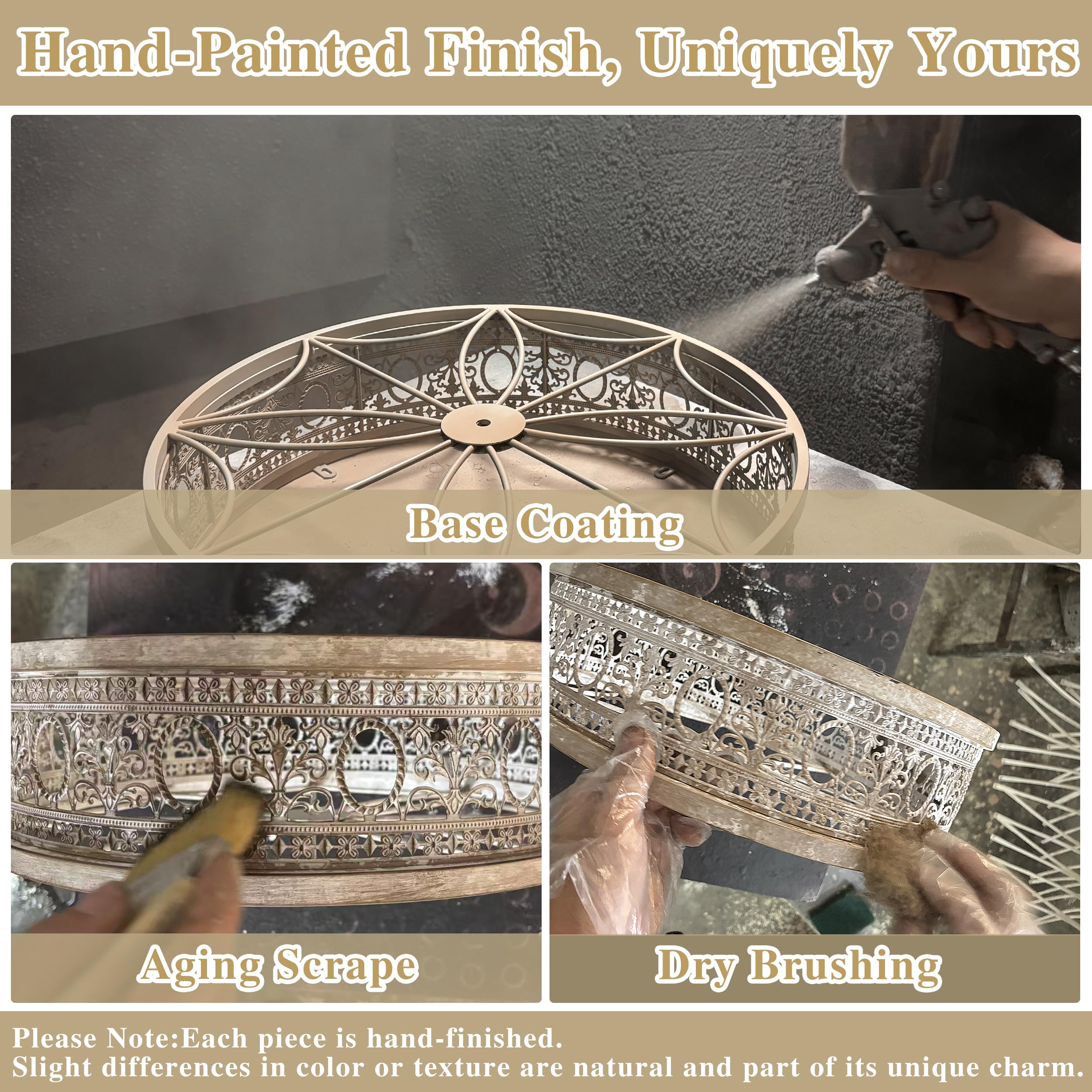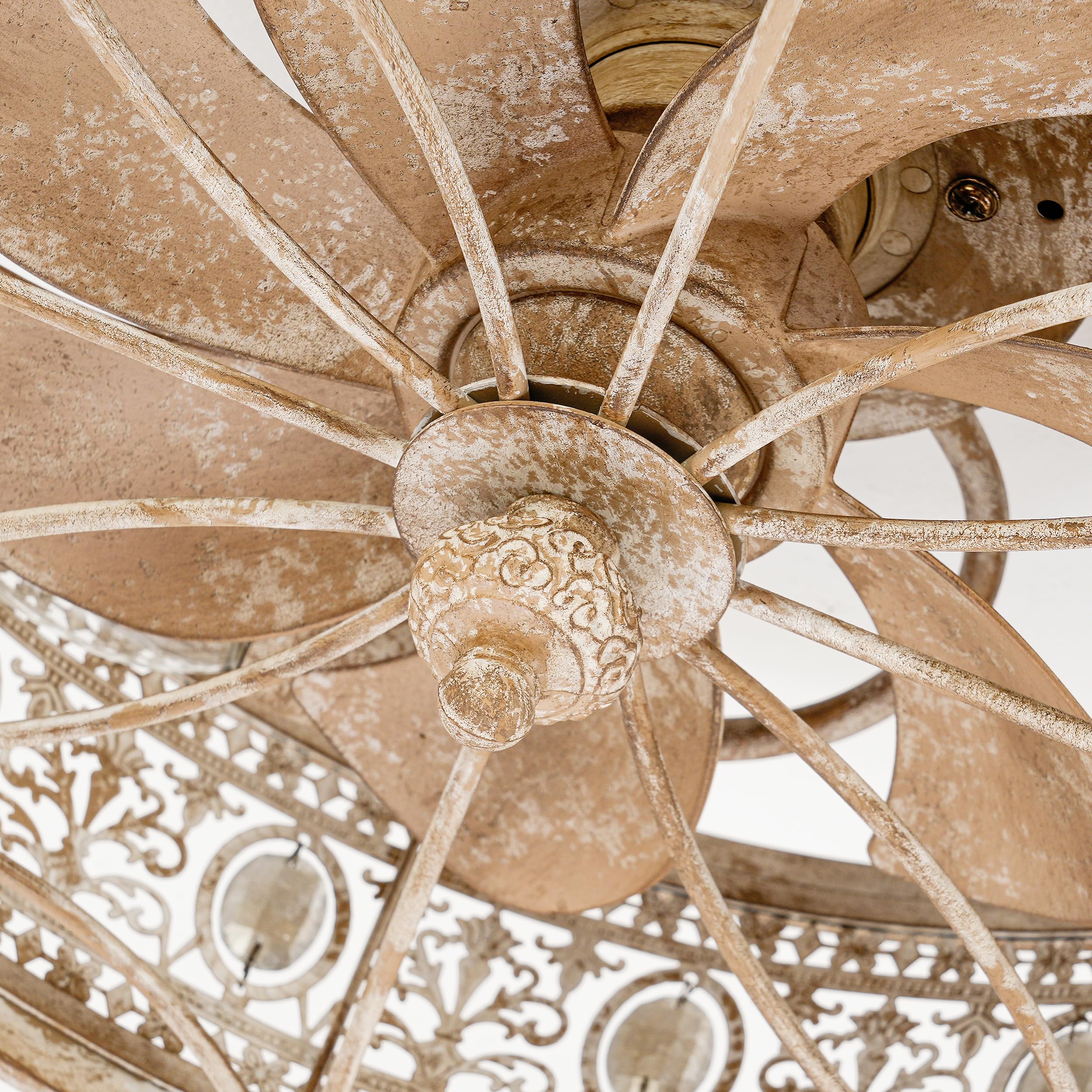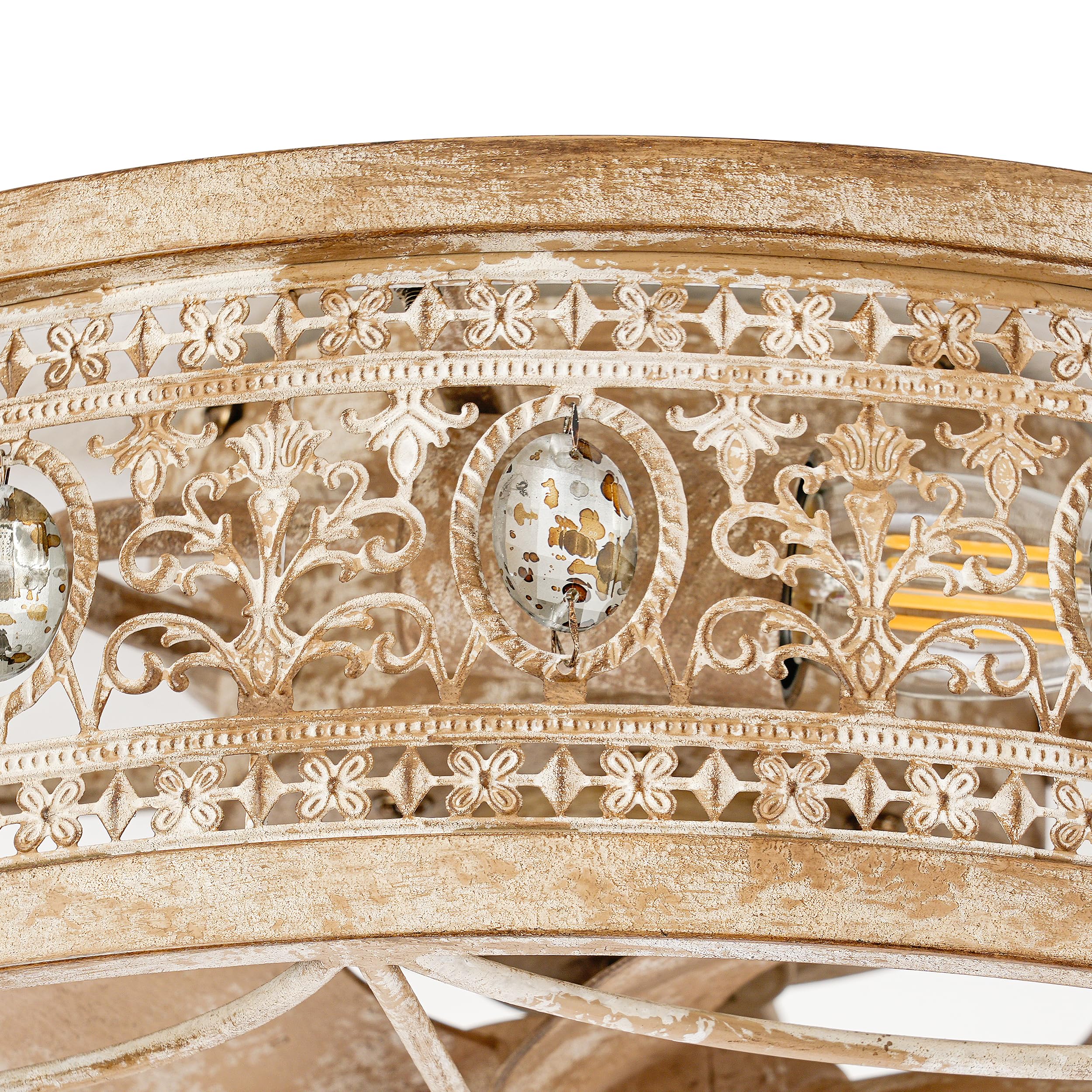 ๐๐๐ง๐๐๐ซ๐๐๐ญ๐๐ ๐๐๐ญ๐ญ๐ข๐๐๐ฐ๐จ๐ซ๐ค ๐ฐ๐ข๐ญ๐ก ๐๐ง๐ญ๐ข๐ช๐ฎ๐๐ ๐๐ซ๐ฒ๐ฌ๐ญ๐๐ฅ ๐๐๐๐๐ง๐ญ๐ฌ:The aged metal cage, wood-inspired textures, and hand-antiqued crystals produce a reclaimed vintage farmhouse aesthetic.