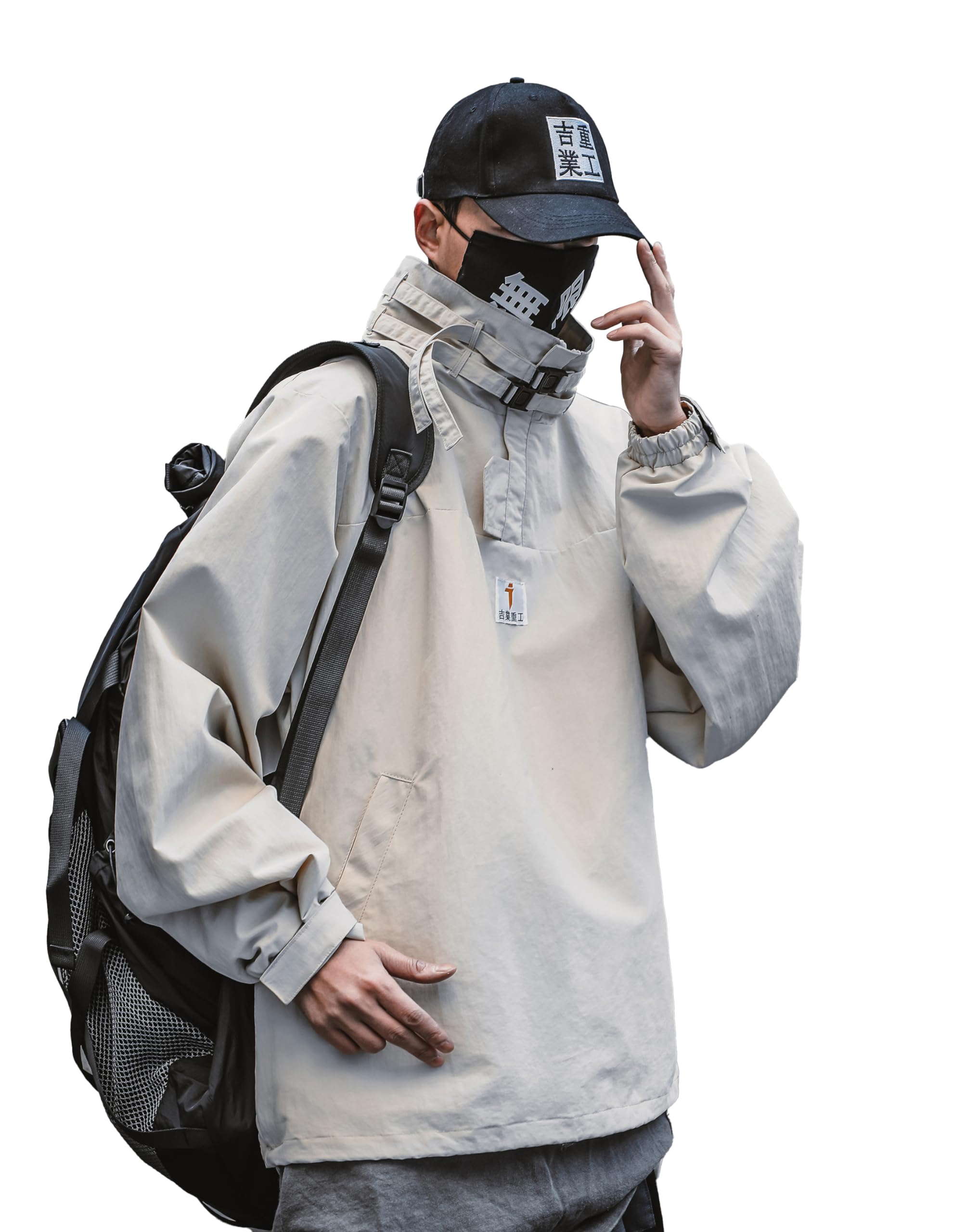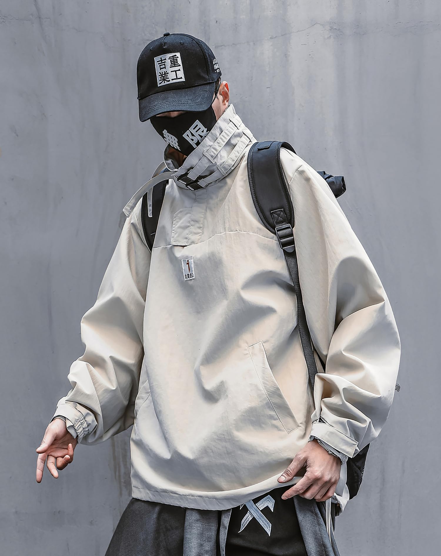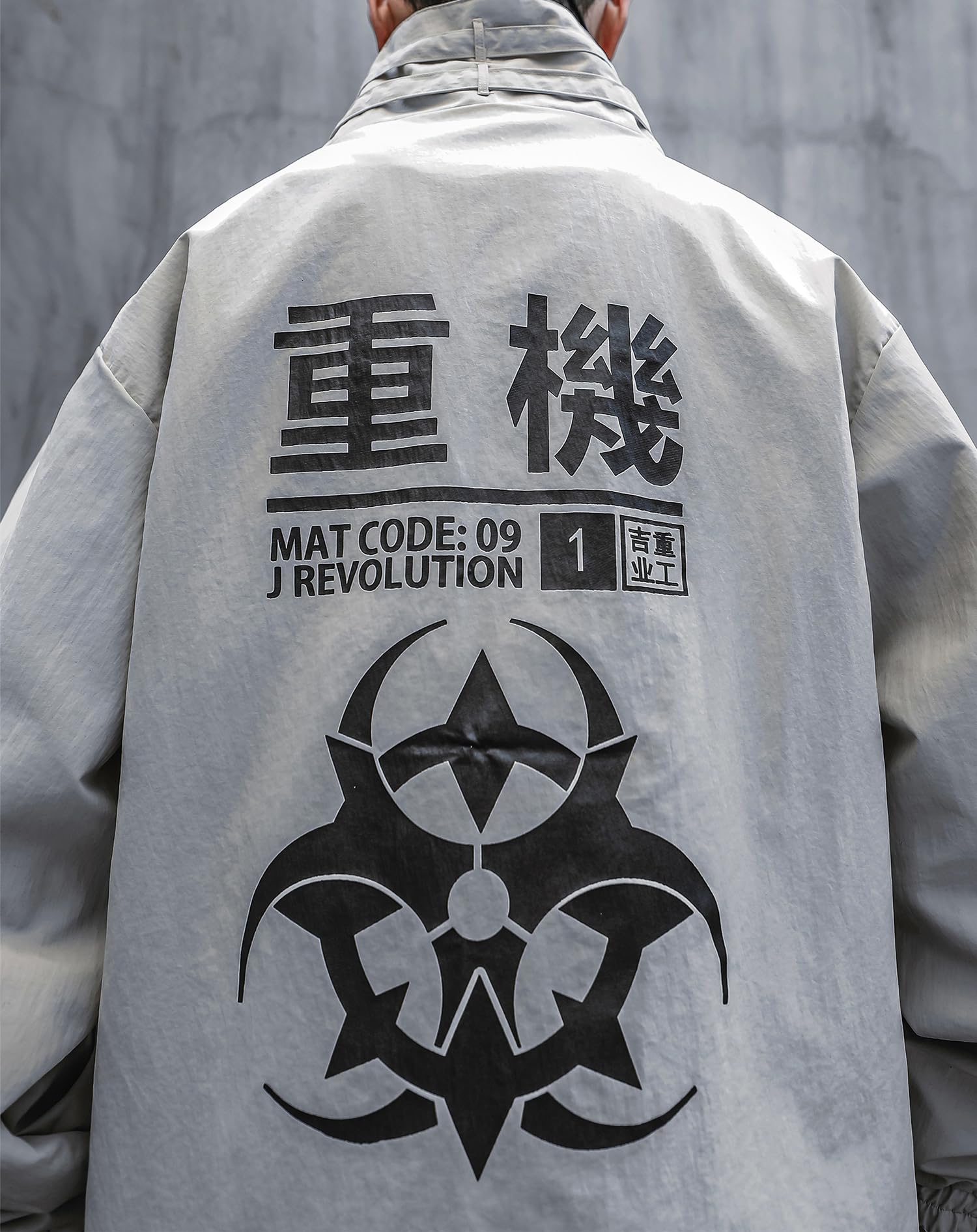 Printed with japanese kanji and unique graphic on the back, this windbreaker jacket embodies the techwear aesthetics, adding a distinctive touch to your outfit.