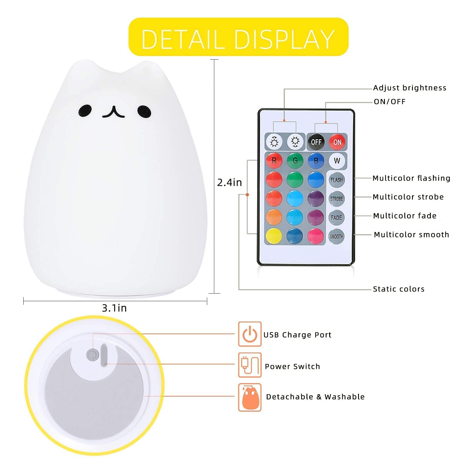 【TAP TO CONTROL CAT LAMP】 REMOTE CONTROL. Tap to swicth warm light, 7 colorful lights, and 3 brightness adjustable. Kids easy to light up cat lamp.