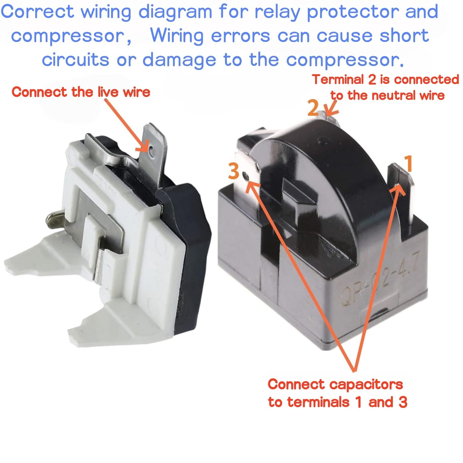 ✅Please note that this product is only compatible with QP-02-4.7 relay with 3 terminals. Not compatible with relays of other pin numbers. This kit is not suitable for all refrigerator compressors, only applicable to 110V compressors.