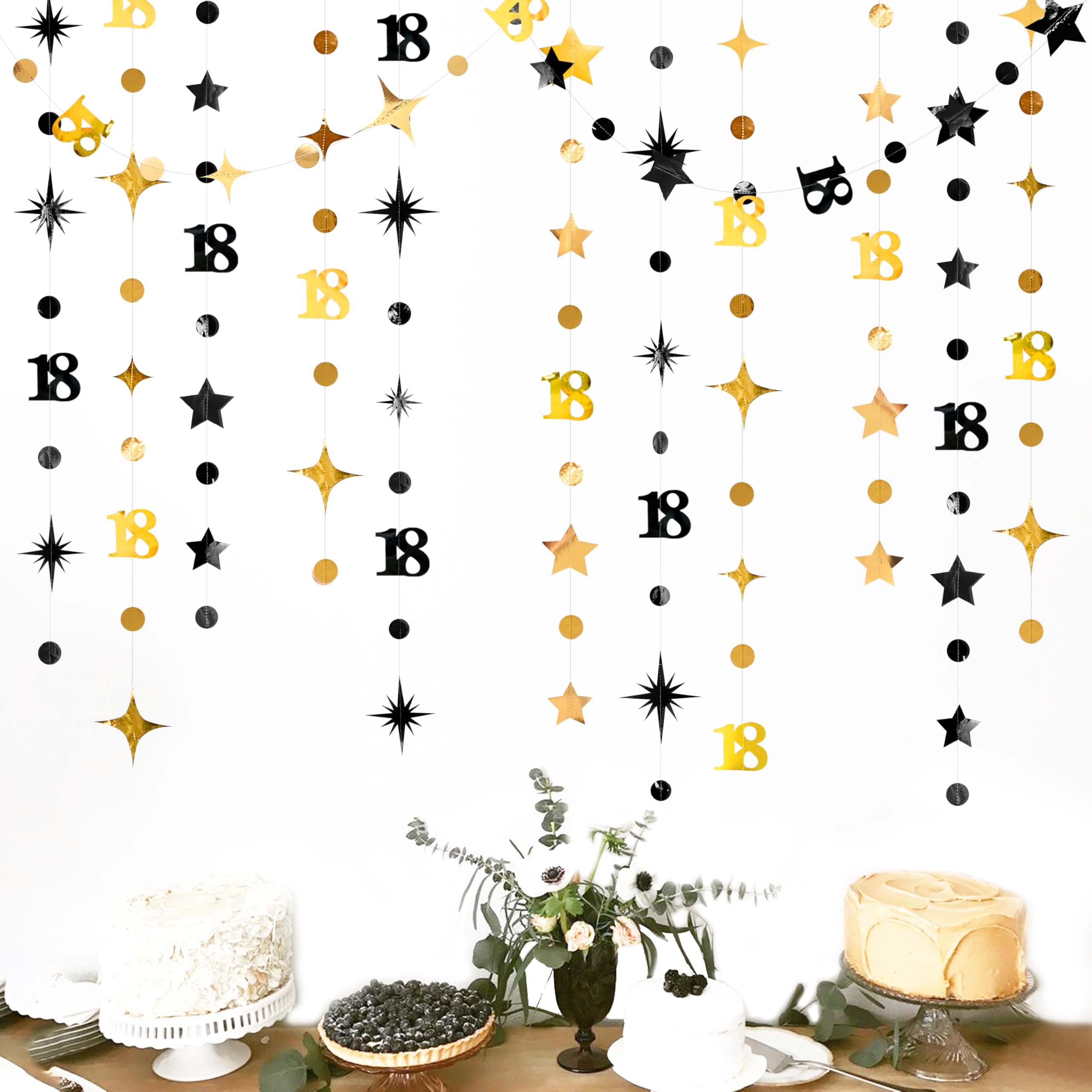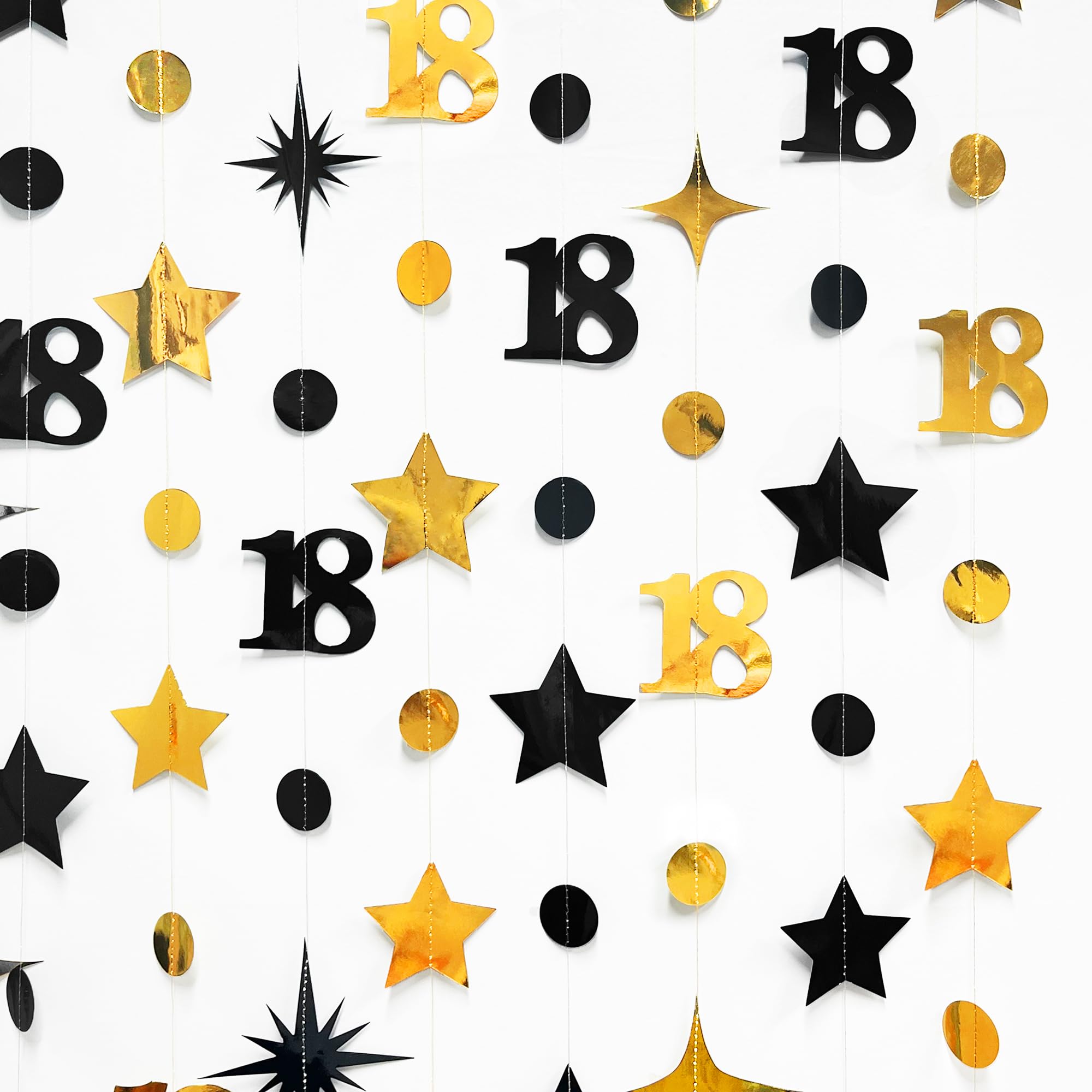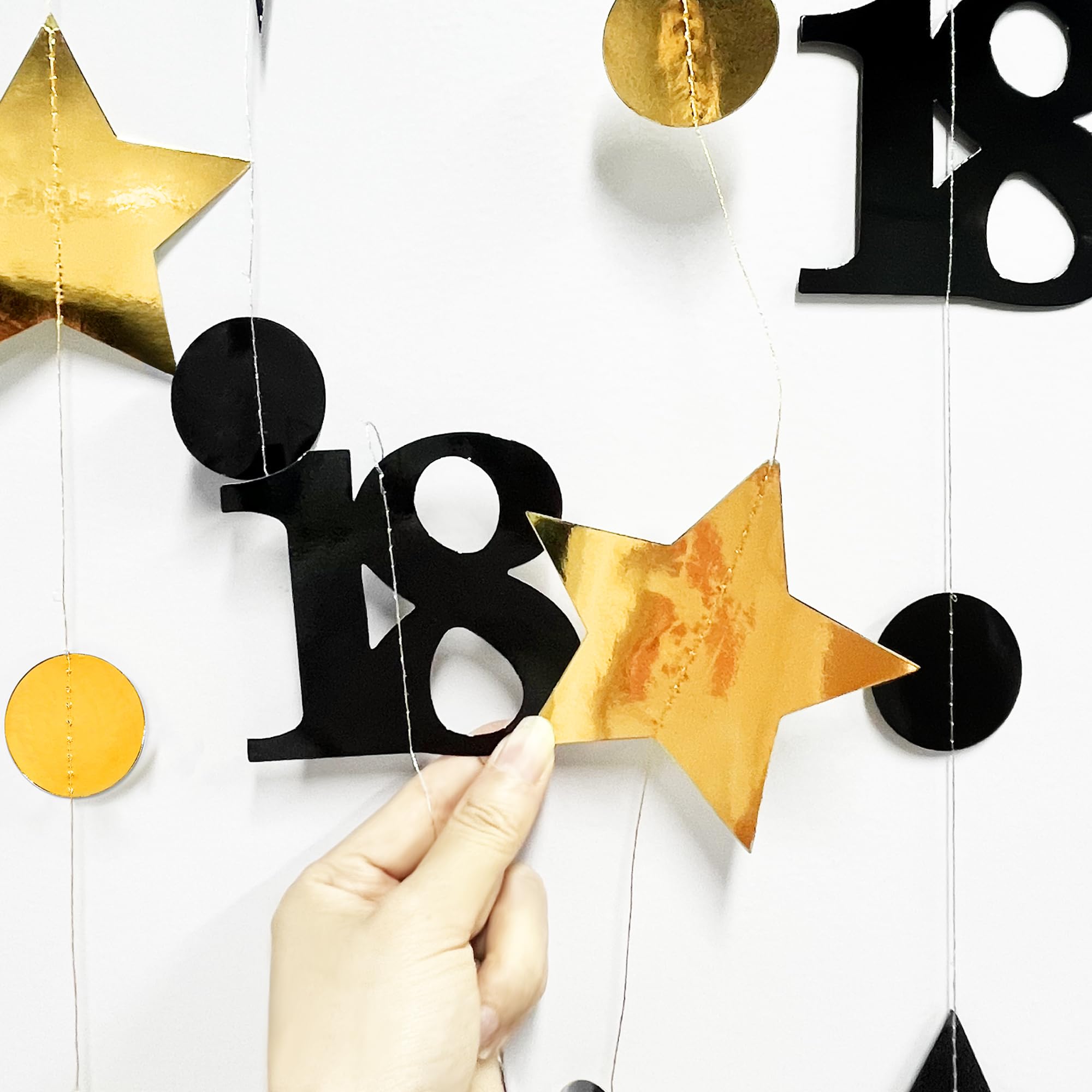👍 Package includes - 4 strings of 11.5 feet/3.5 meters black gold number 18 sparkling twinkle star and circle dots garlands , totally is 46 feet/14 meters