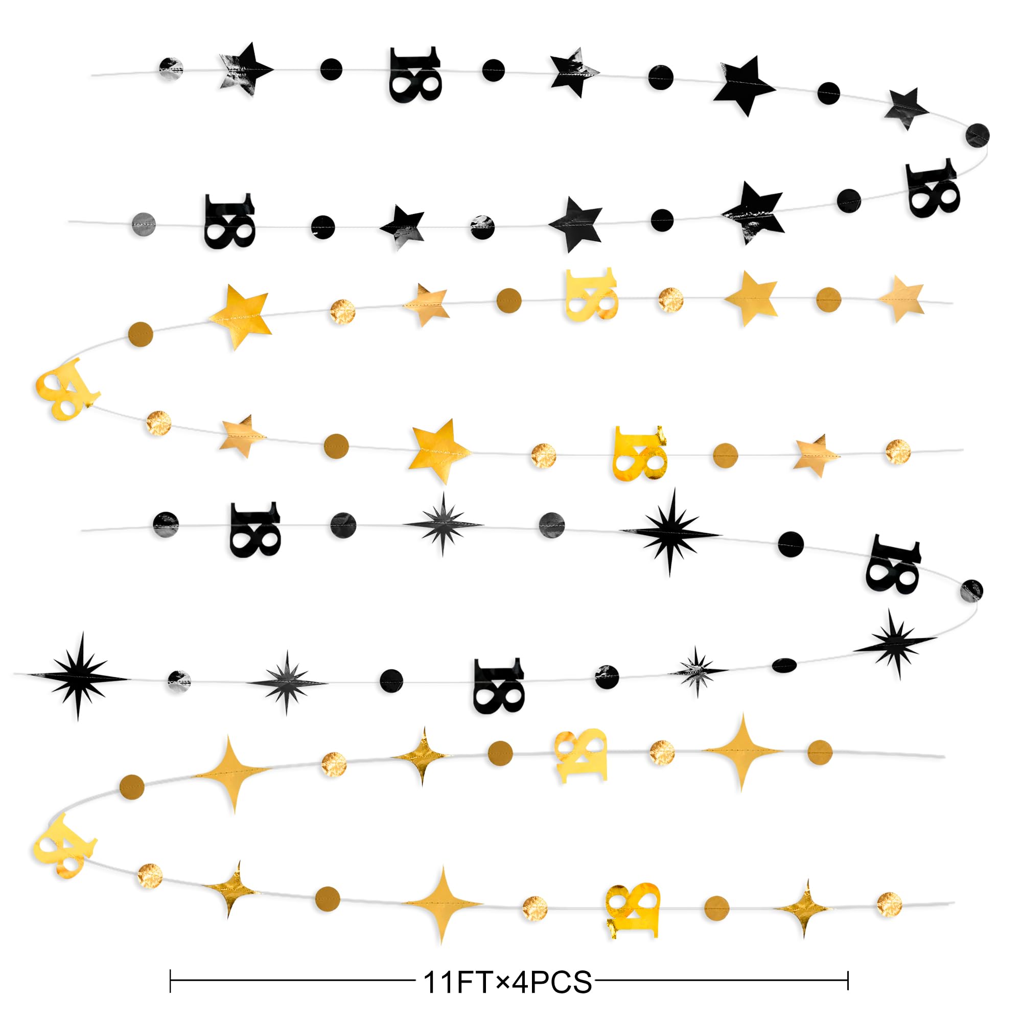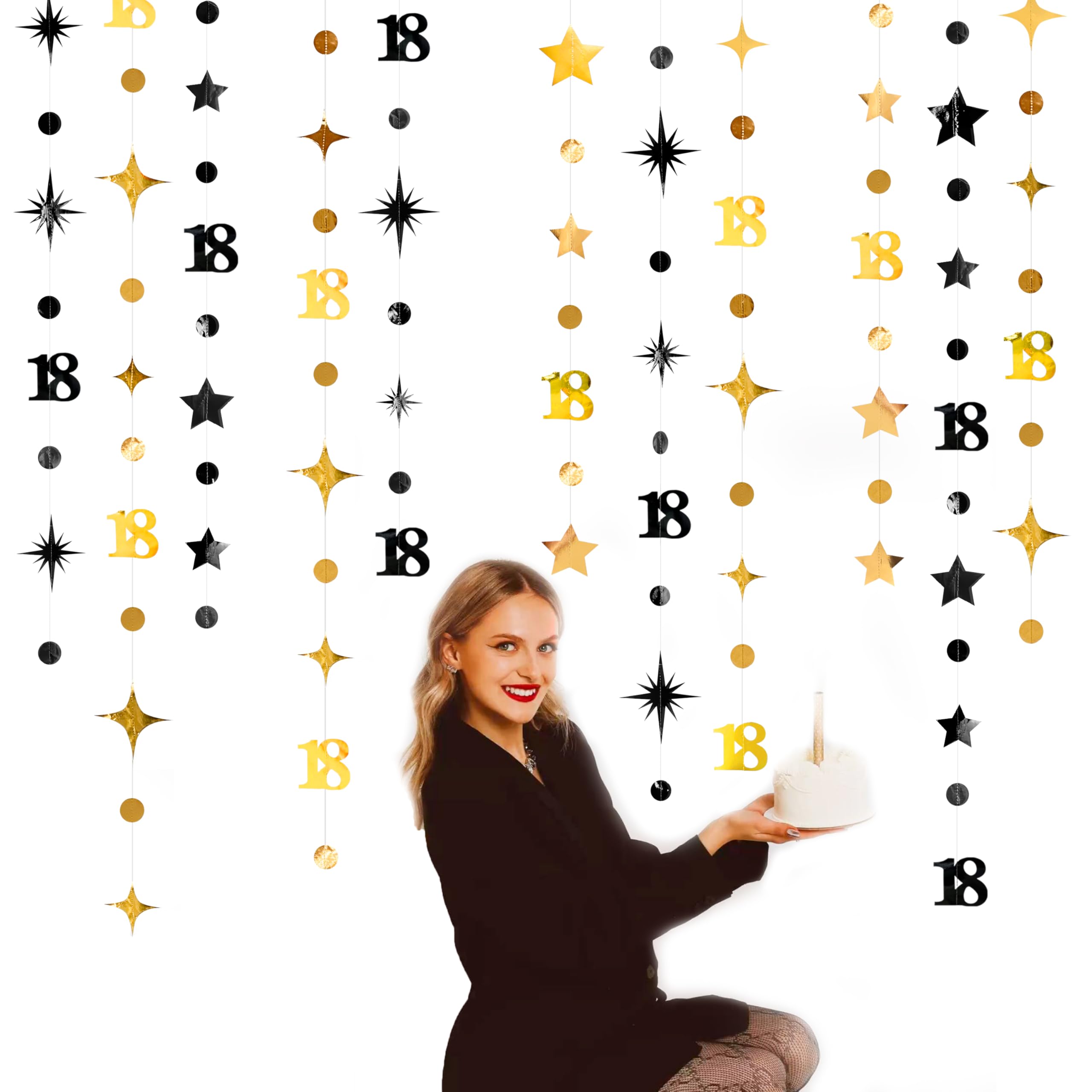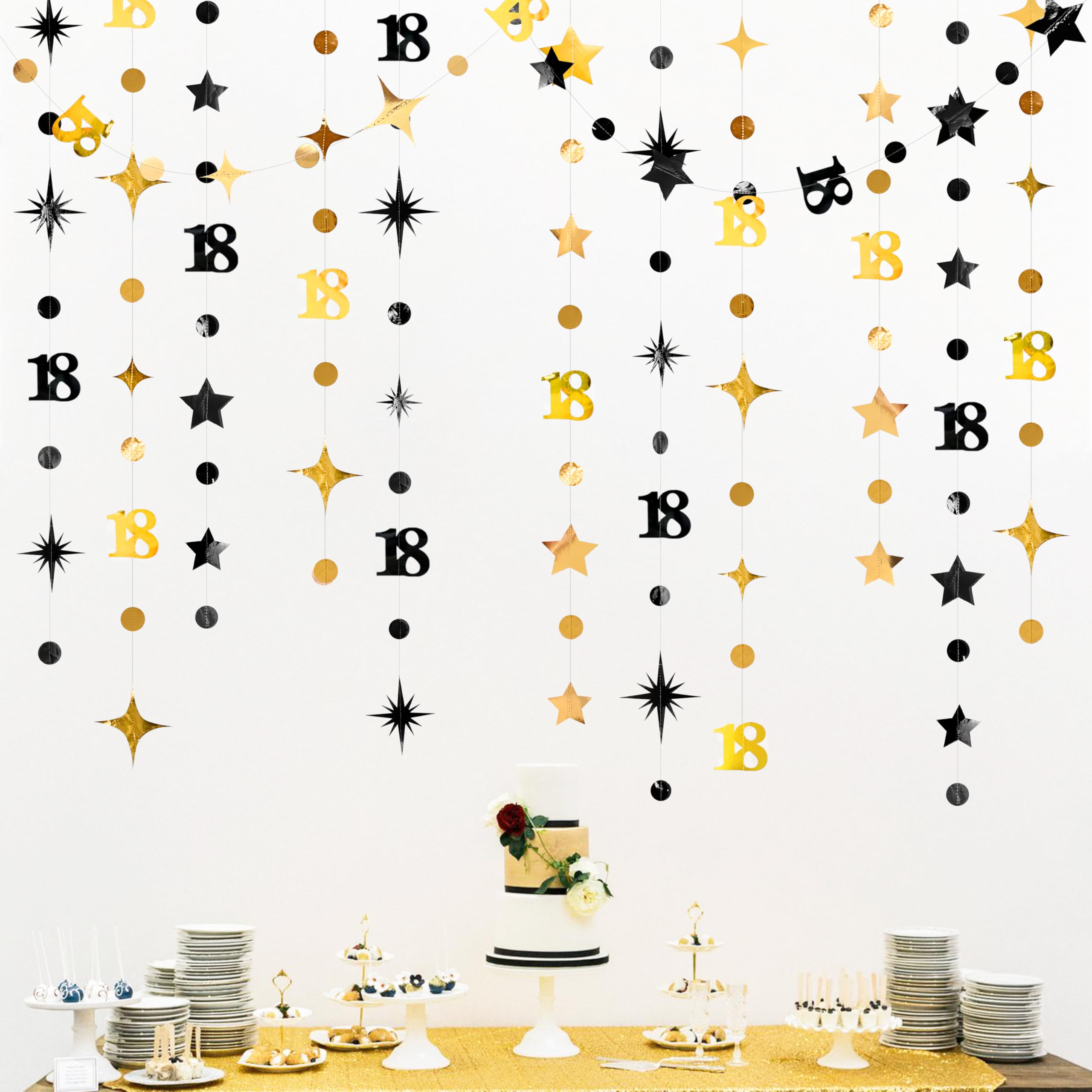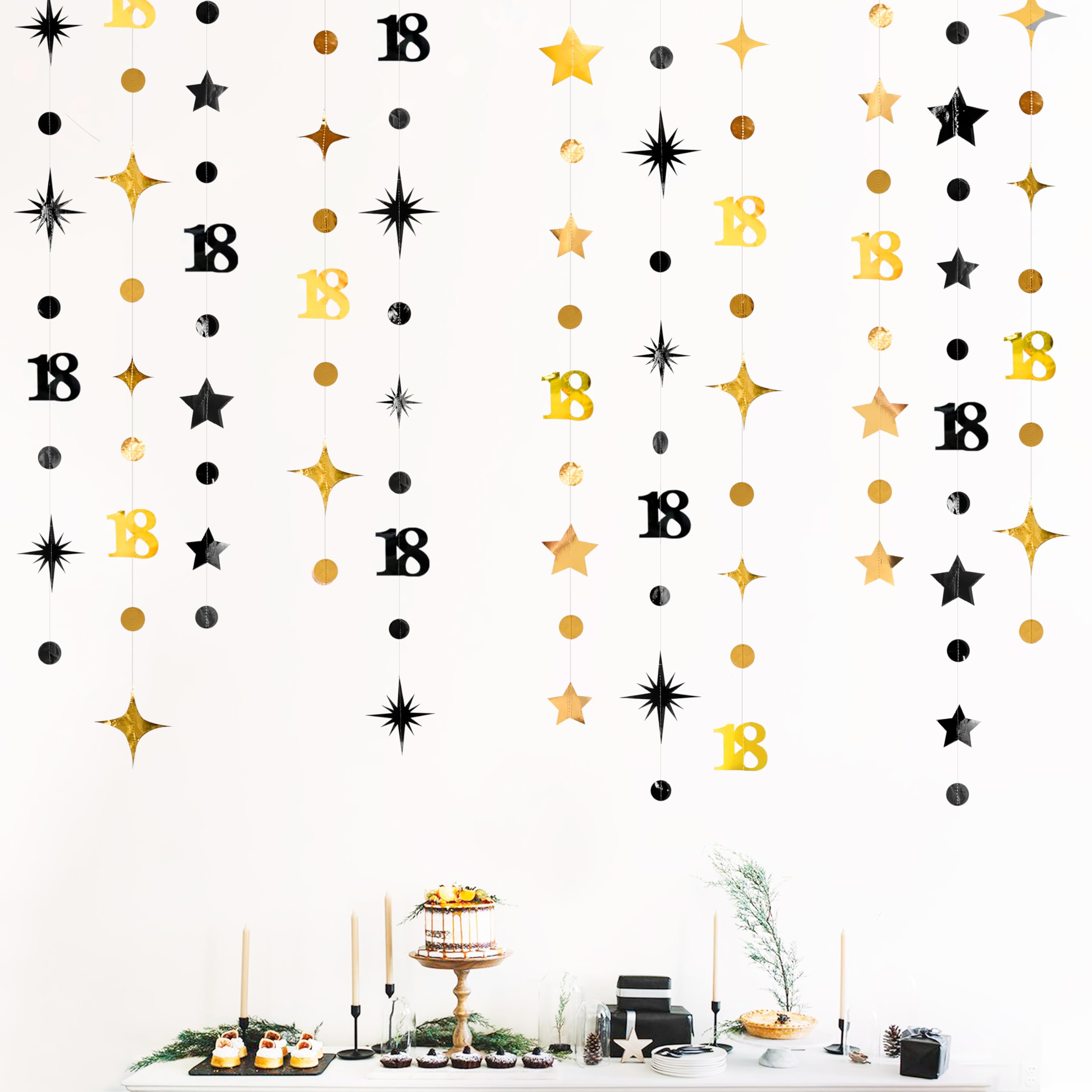 👍 Package includes - 4 strings of 11.5 feet/3.5 meters black gold number 18 sparkling twinkle star and circle dots garlands , totally is 46 feet/14 meters