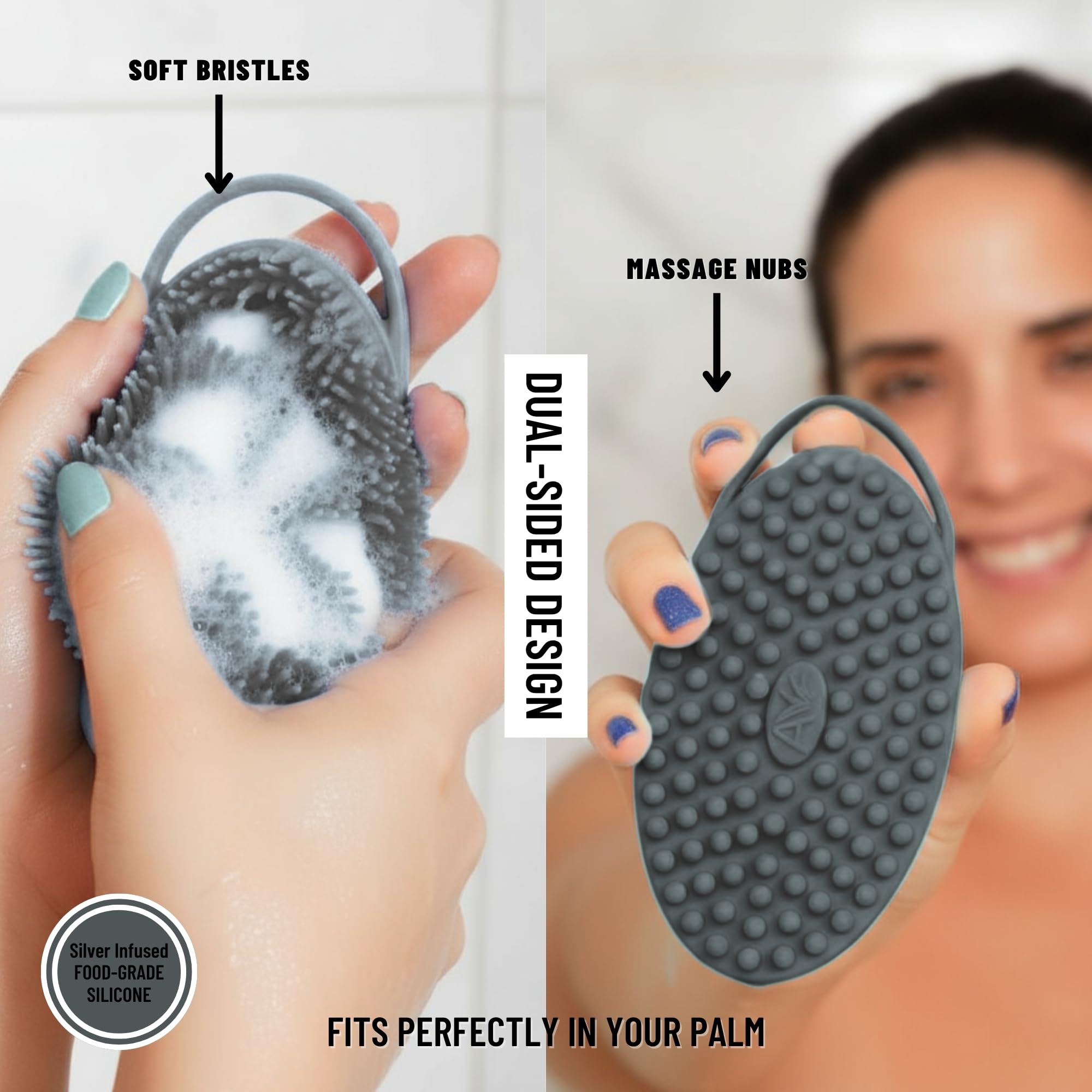★ SILVER-INFUSED PREMIUM SILICONE - Advanced material technology combines food-grade silicone with silver particles for enhanced freshness maintenance. Dual-sided design features massage nodules for relaxation and soft long bristles for thorough cleansing. Perfect for sensitive skin