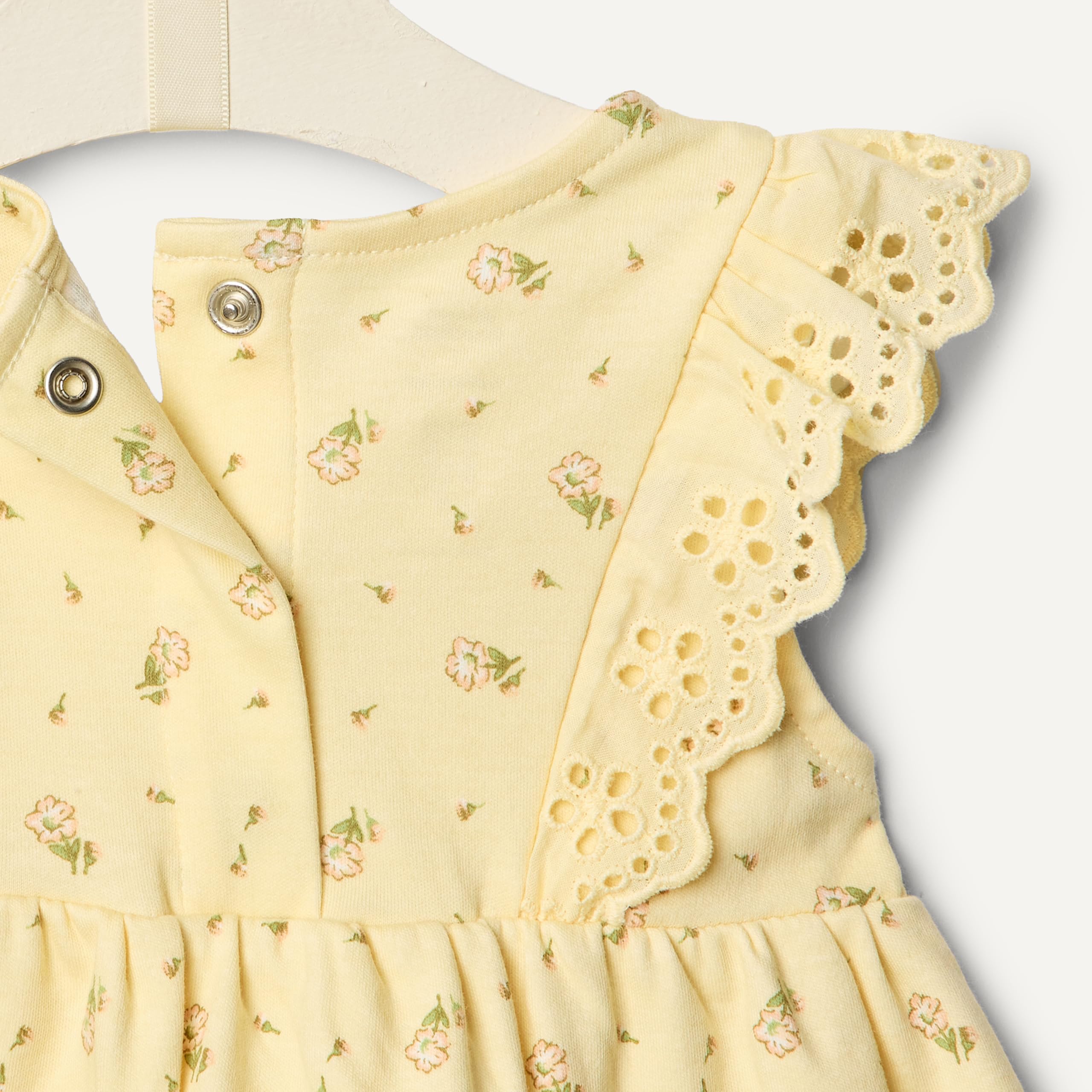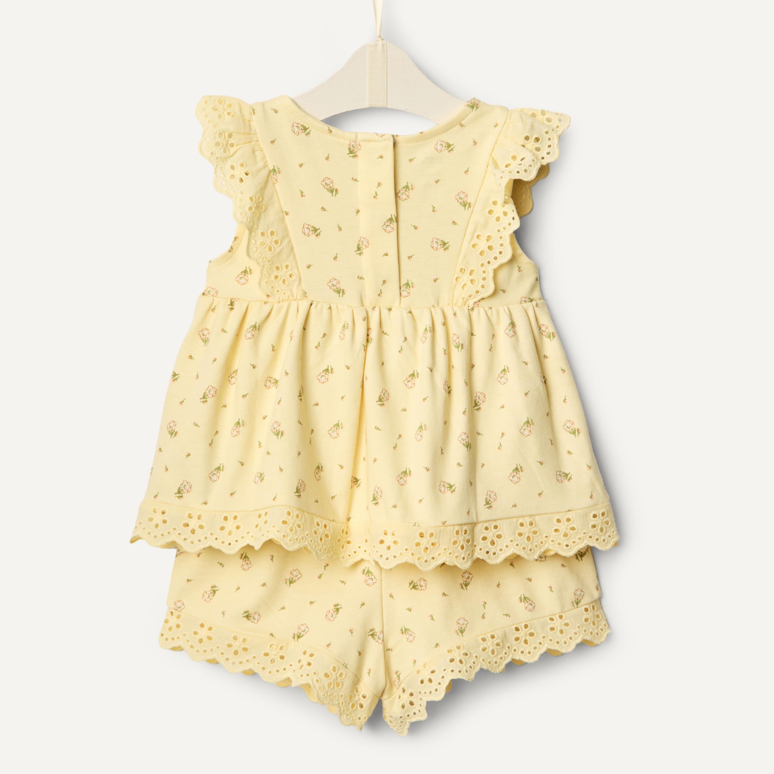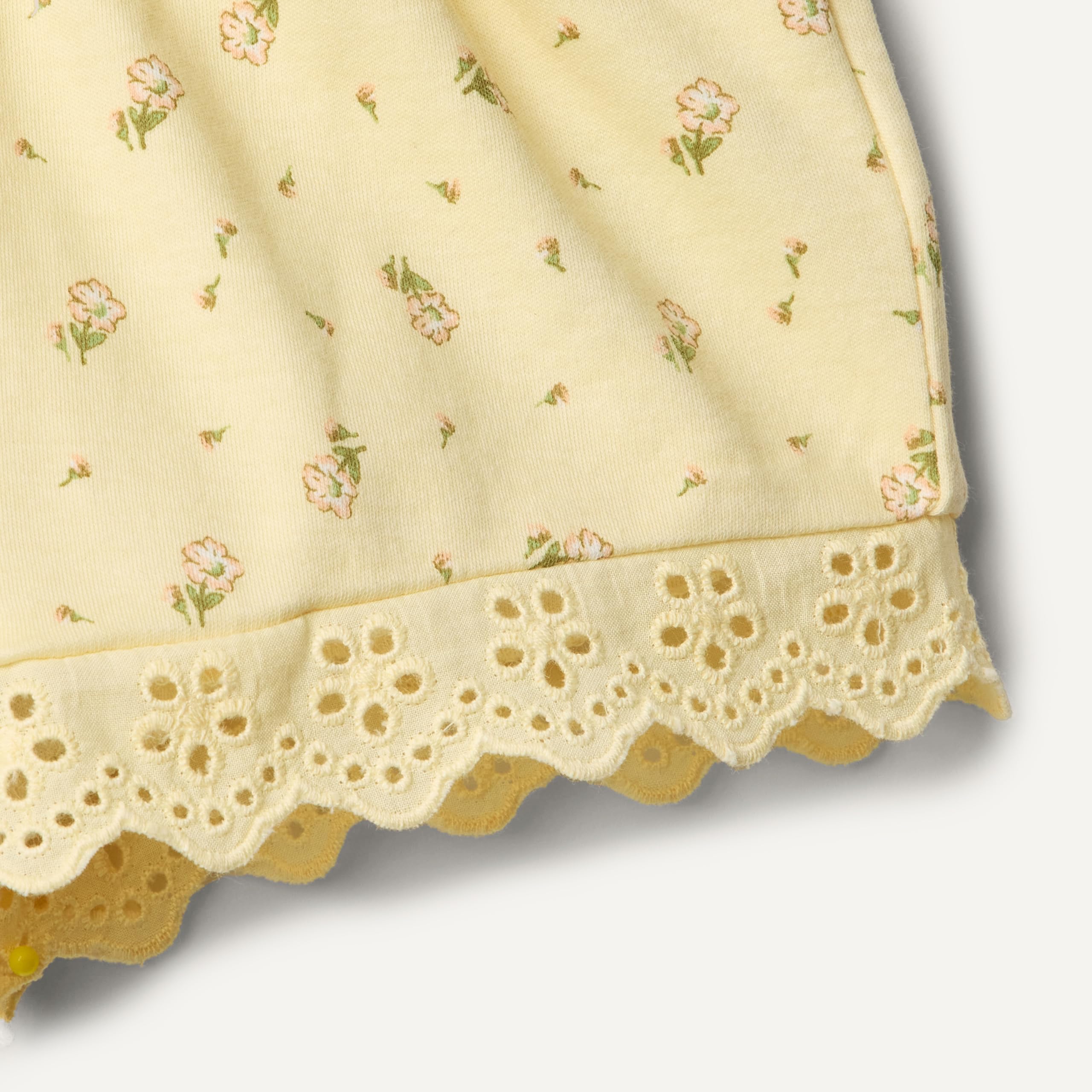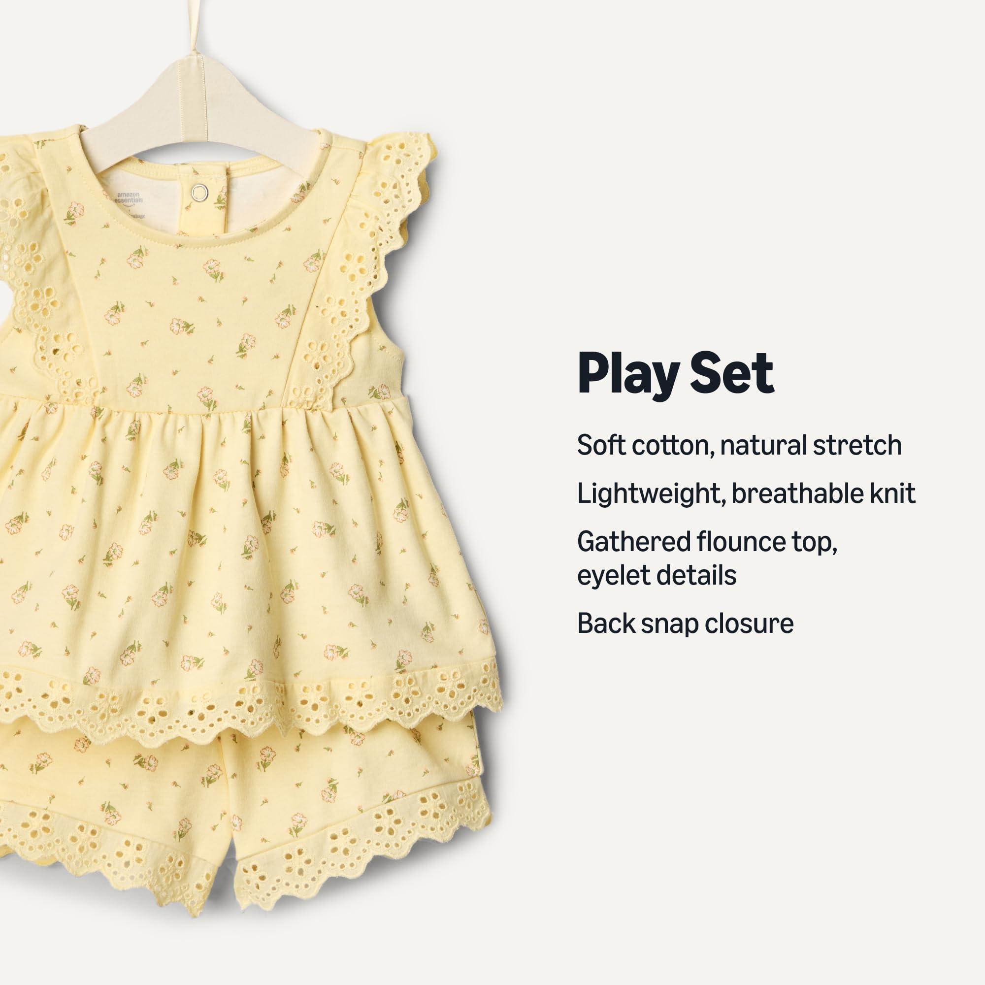 DETAILS: Gathered flounce top with elastic waist, back snap closure, and eyelet trim detail, shorts feature an elastic pull-on waistband and matching eyelet detail