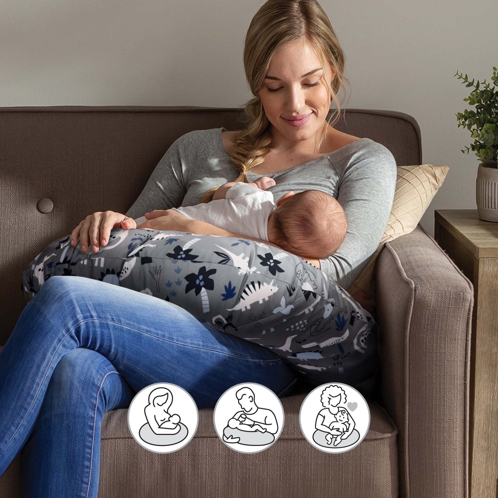 This Boppy nursing pillow provides ergonomic support for breastfeeding, bottle feeding, and bonding. The c-shaped design allows for multiple feeding styles—cradle, cross cradle, football hold and bottle feeding. Aids positioning for a better latch and back relief. Machine washable for easy cleaning with removeable pillow cover for added ease. The average nursing mom spends over 35 hours per week breastfeeding. Get the tools for the job with the Boppy Original Support Nursing Pillow. The beltless design allows for an easy, one-handed placement with no fuss, and the Miracle Middle panel provides a seam-free connection with your body for a more comfortable fit for c-sections or stomach tenderness after birth. This award-winning Boppy nursing pillow is a registry must-have and a parent favorite. Small enough to easily fit in your rocking chair or glider, but big enough to give the support you need. Support for you and baby with hypoallergenic fiber fill and a removable cover to help keep your breastfeeding pillow cleaner longer. A variety of Boppy Nursing Pillow Covers to fit your style are sold separately, from cotton blends to organics, so you always have backup on laundry day. Designed for your baby's adult-supervised awake-time. This product is not for sleep. Thank you to the millions of parents who trust Boppy. Looking for extended sizes? Check out the Boppy Best Latch Support Nursing Pillow or the Boppy Anywhere Support Nursing Pillow for a perfect fit. This product should never be used for sleep. Our mission is to keep you feeling comfortable and confident with your decision to choose Boppy for high quality products, expert third party testing, and clear messaging. The AAP Safe Sleep Guidelines state that a baby should never be put to sleep with any pillow or plush product. Newborns should always be put to sleep on their back on a firm, flat surface free from loose blankets, pillows, stuffed toys, bumpers, and other soft items. Please always use products as intended.